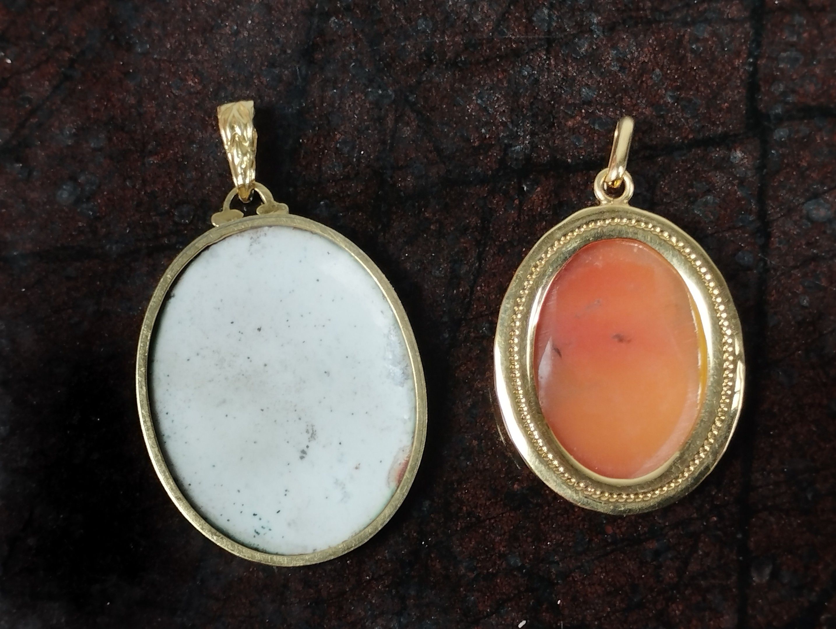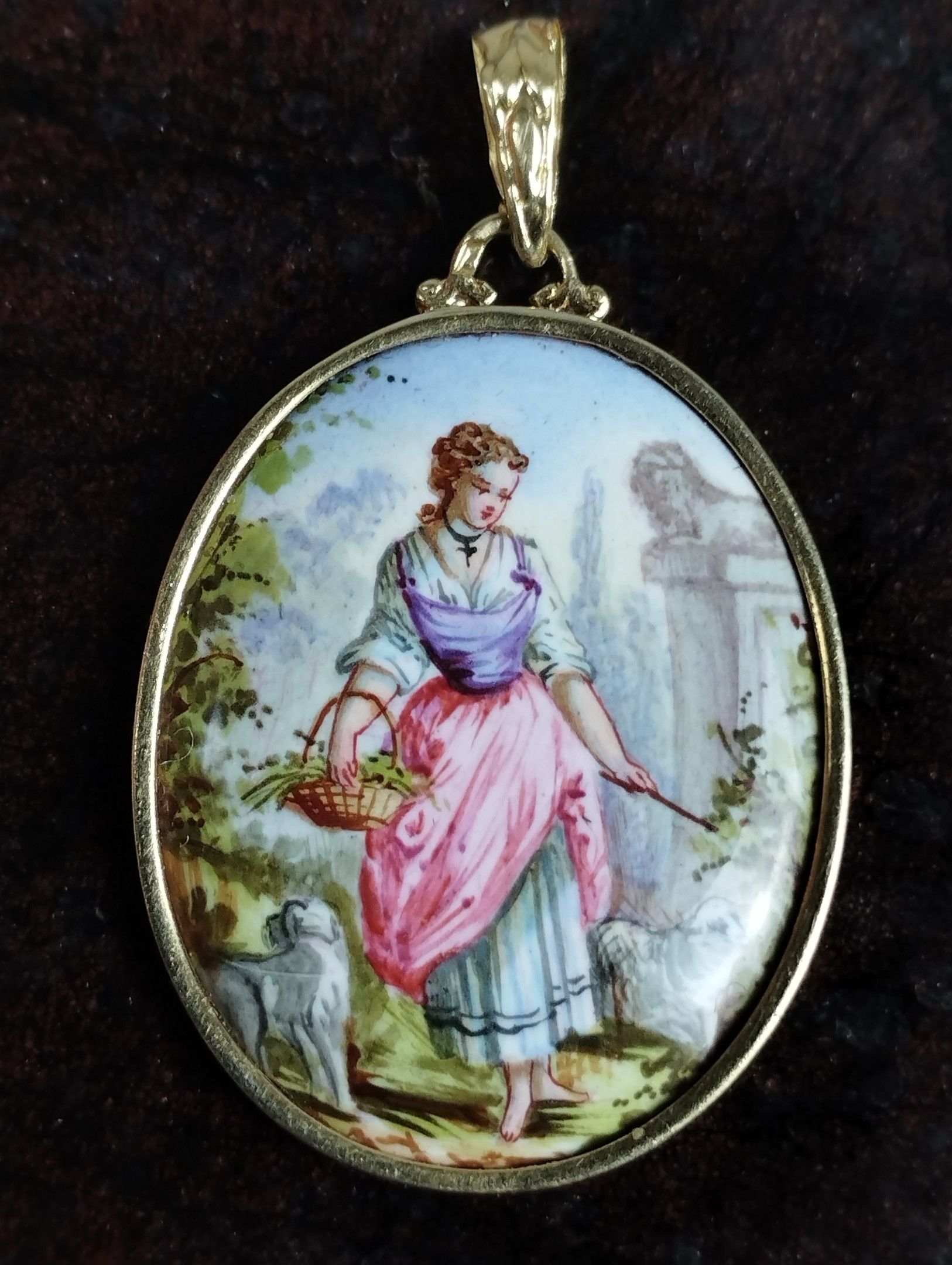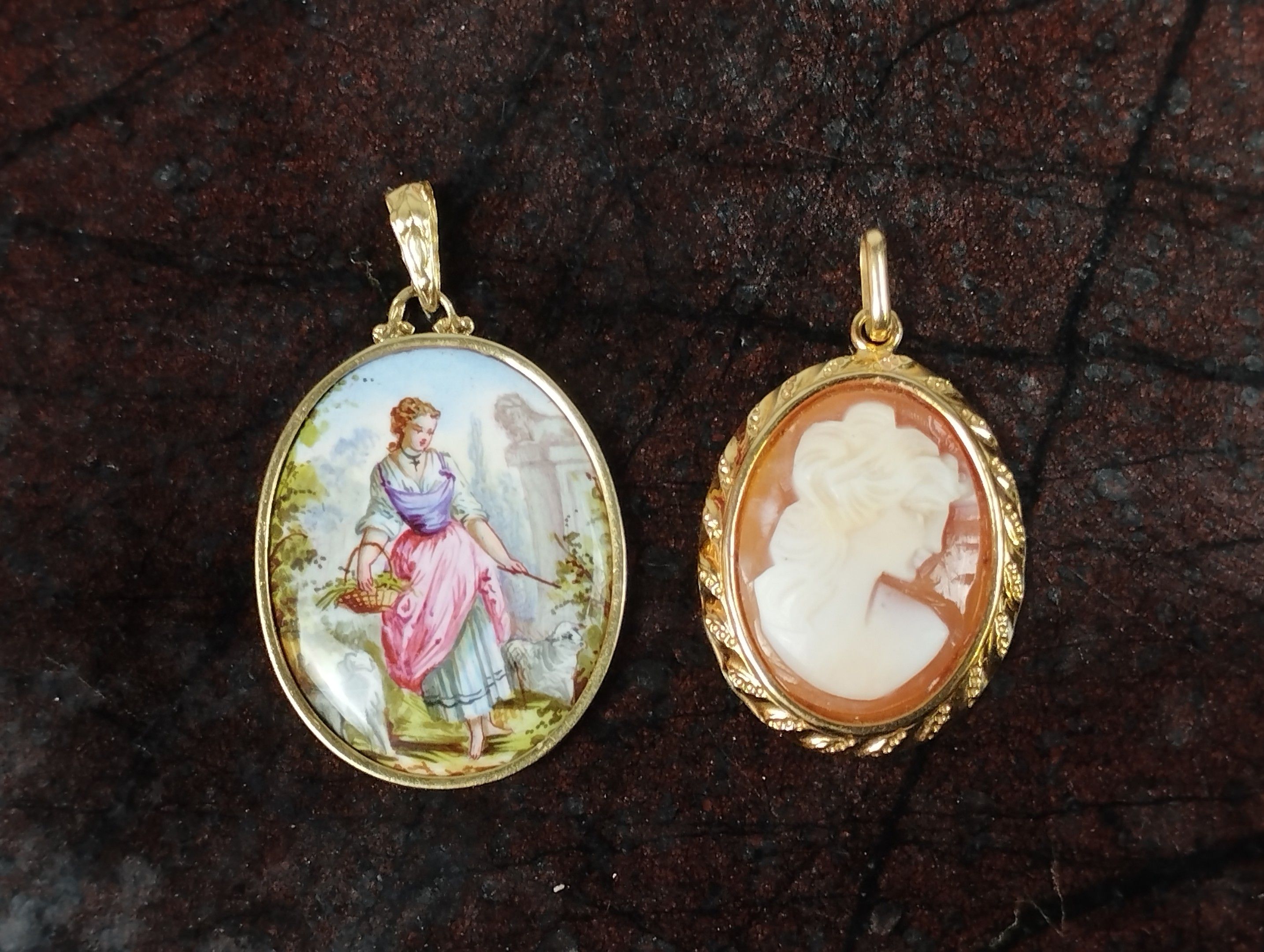 A set of two oval medallions/pendants set in yellow gold (750/00), the first holding a cameo (H. cameo: 21 mm.), the second adorned with an enamelled porcelain plaque, depicting a young shepherdess and her dog, in the Pastoral style of the 18th century. Total gross weight: 6.30 g.