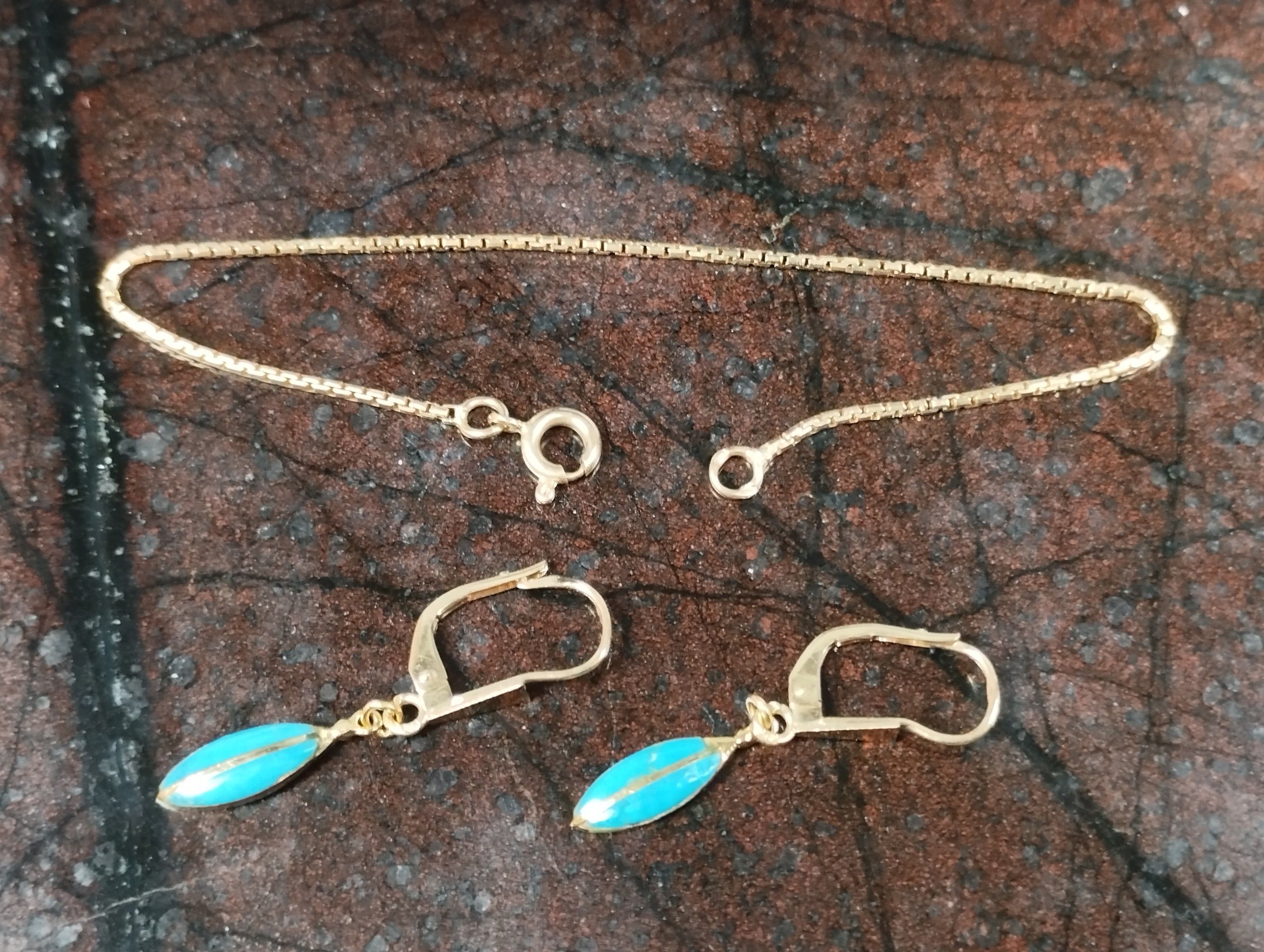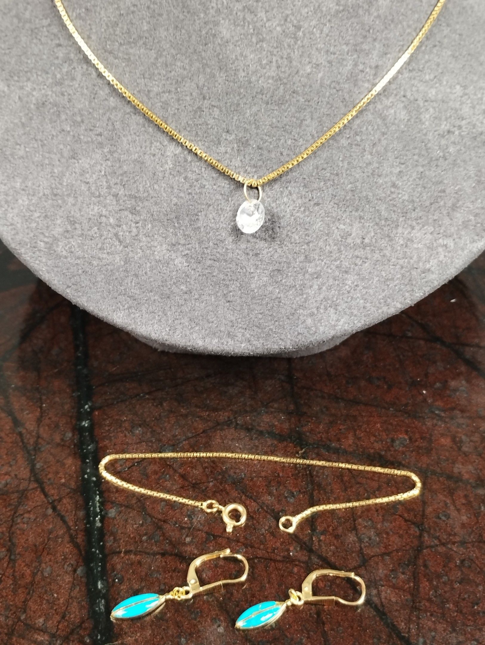 Reunion of three pieces of jewellery in yellow gold (750/00 - eagle head): a Venetian link neck chain (38 cm long) holding a zyrconium oxide, a pair of earrings and a bracelet (16 cm long). Total gross weight: 8.60 g.