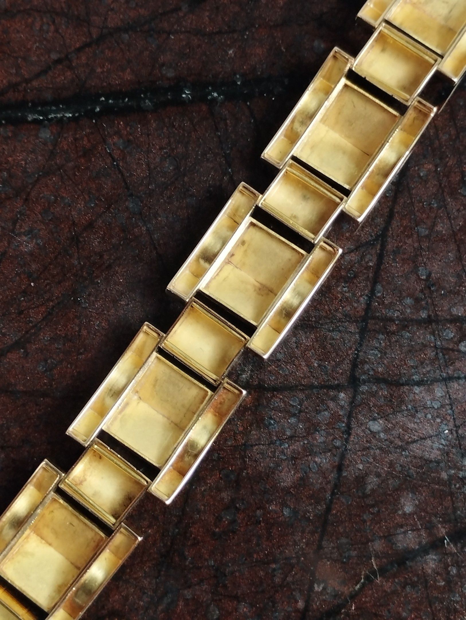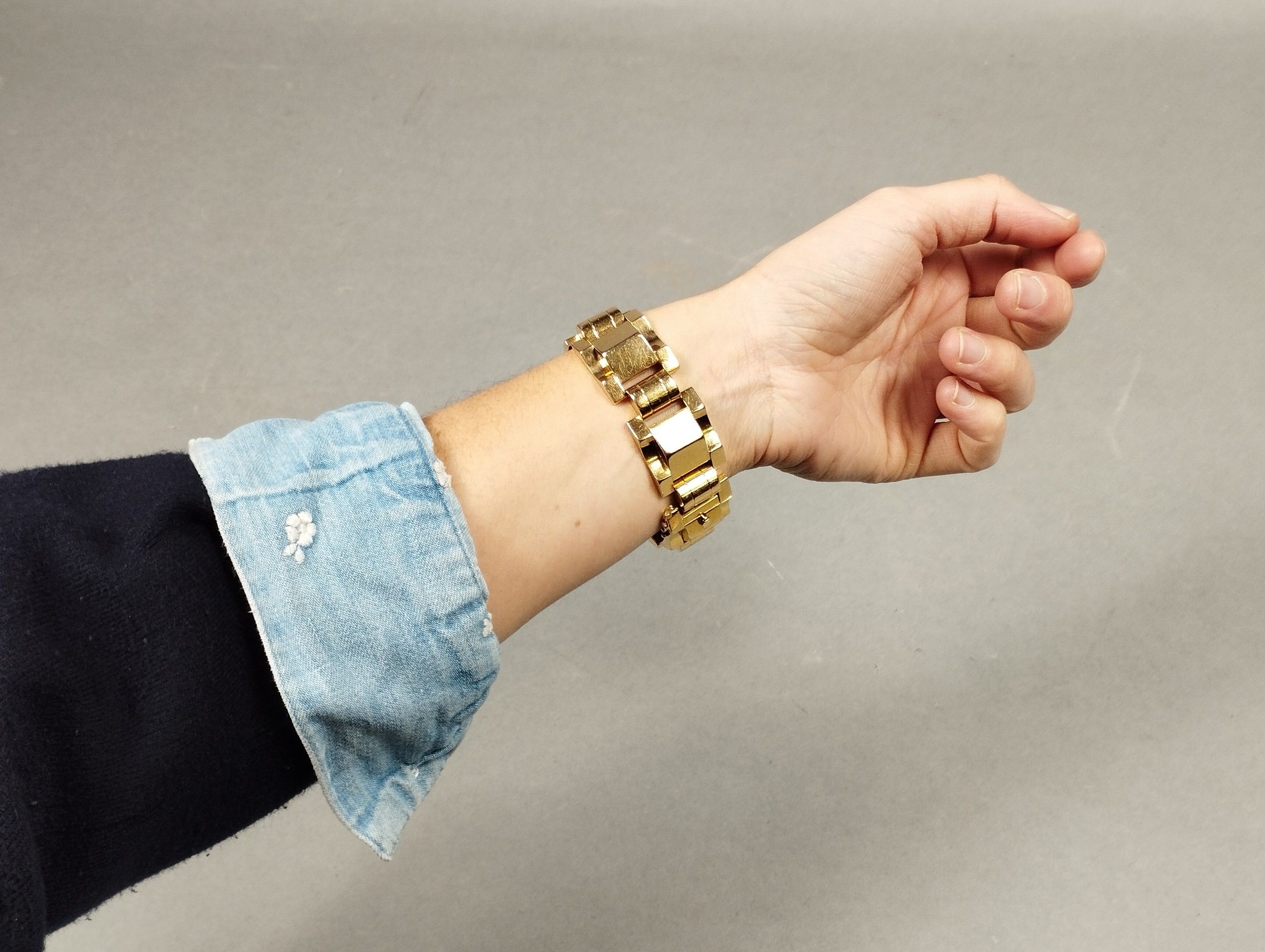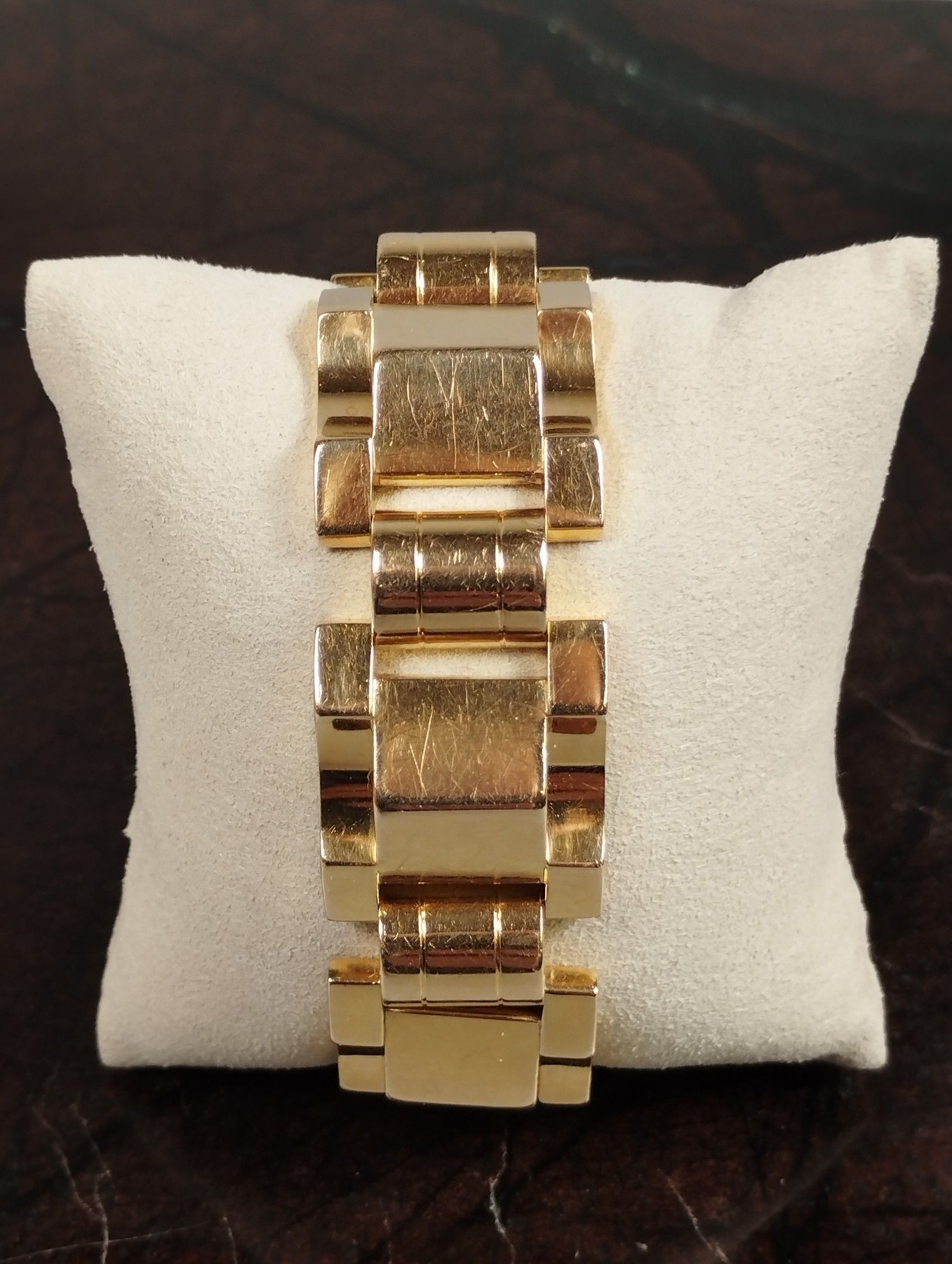 Large tank bracelet in yellow gold (750/00). Safety eight. Length: 19 cm - width: 2.2 cm. Weight: 64.5 g. Sold by designation. Kept in a bank safe. Delivery by appointment.