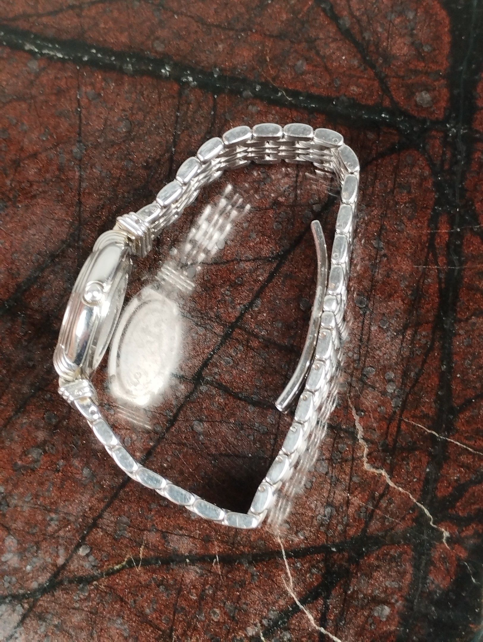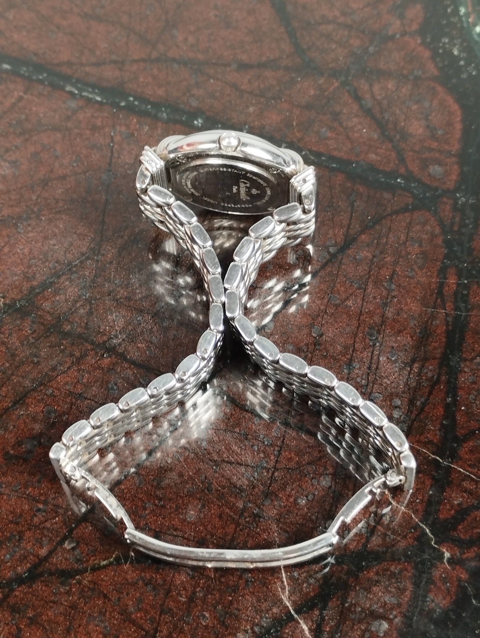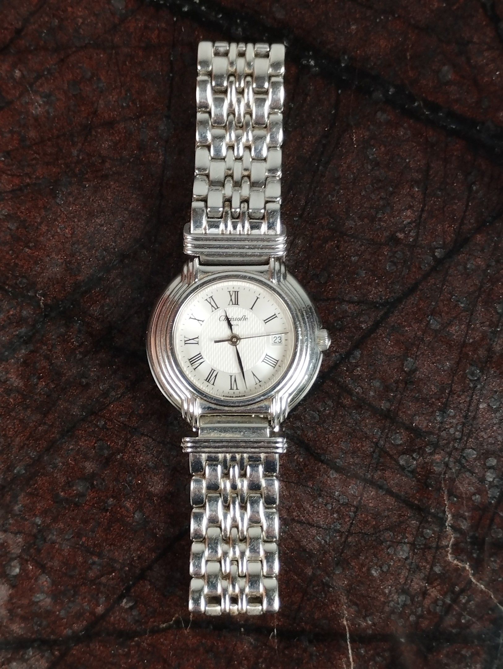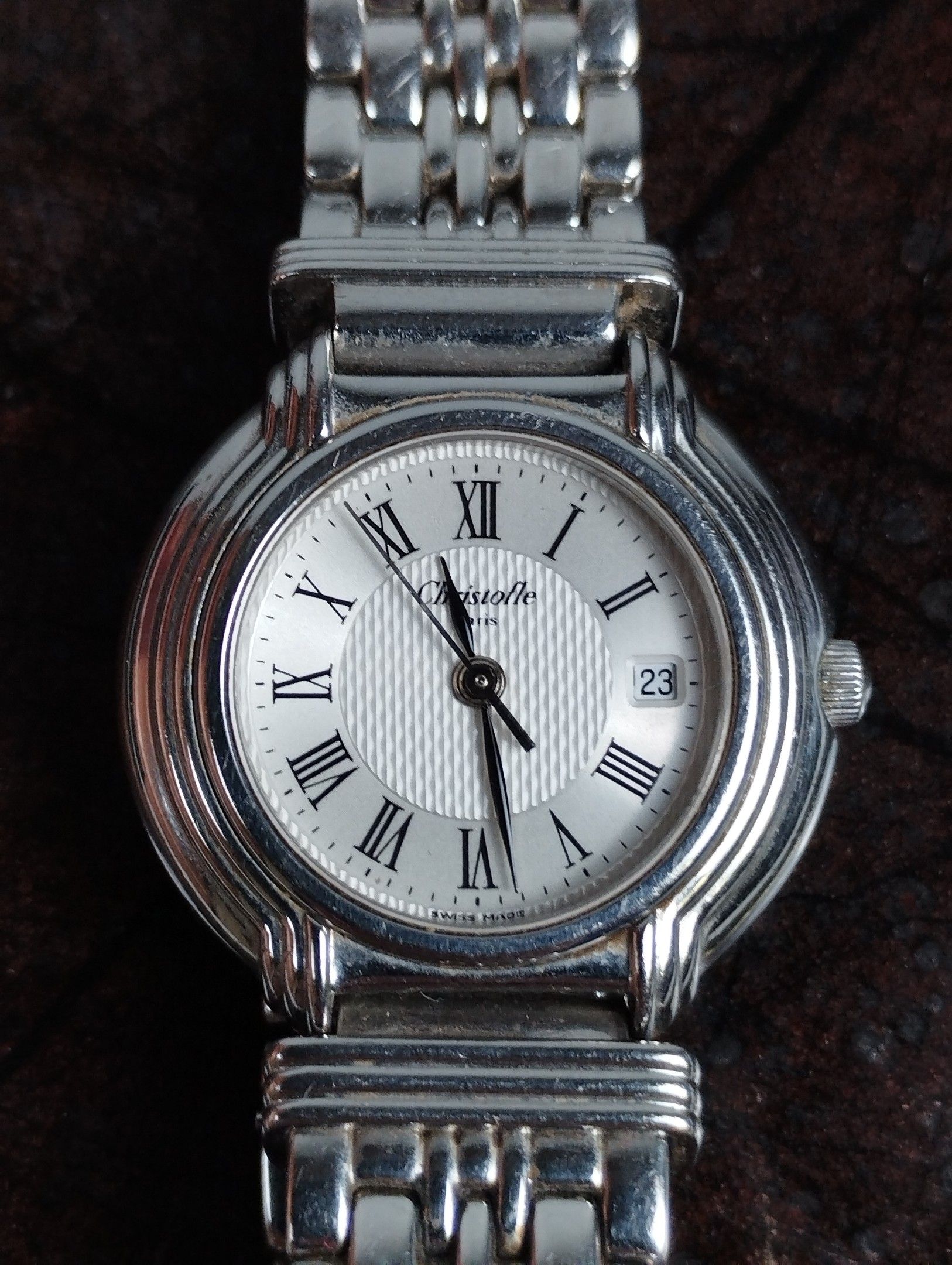 STUDIO RICCI, for CHRISTOFLE, Paris. Ladies' stainless steel wristwatch with circular case, white mother-of-pearl and guilloché dial with Roman numerals and date window at 3 o'clock, signed. Automatic movement. Case width: 28 mm. Strap with folding clasp. Good condition; works.