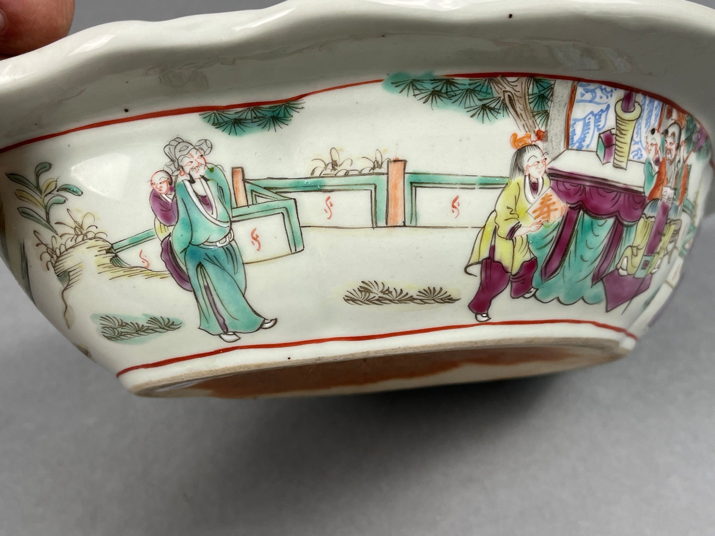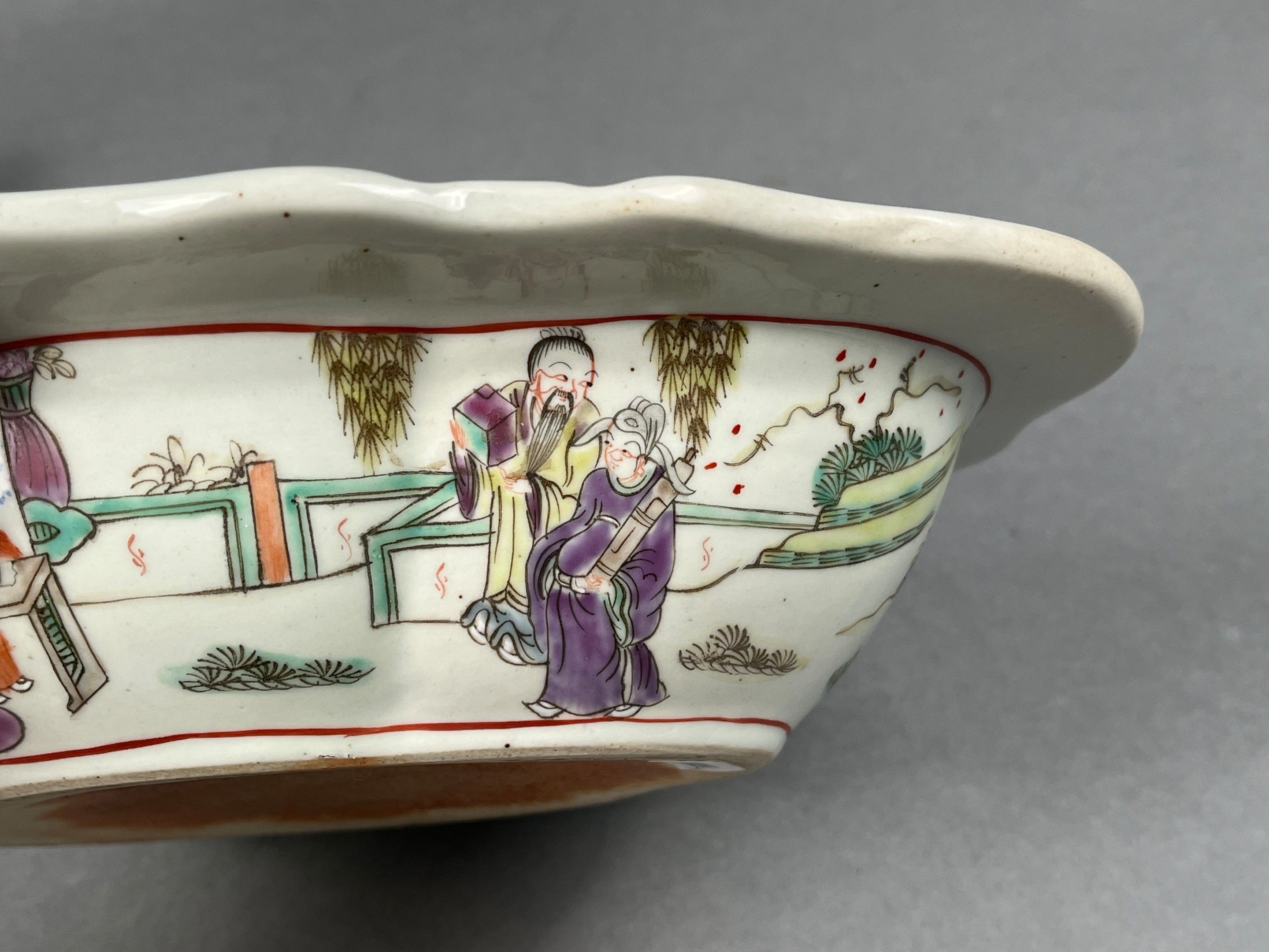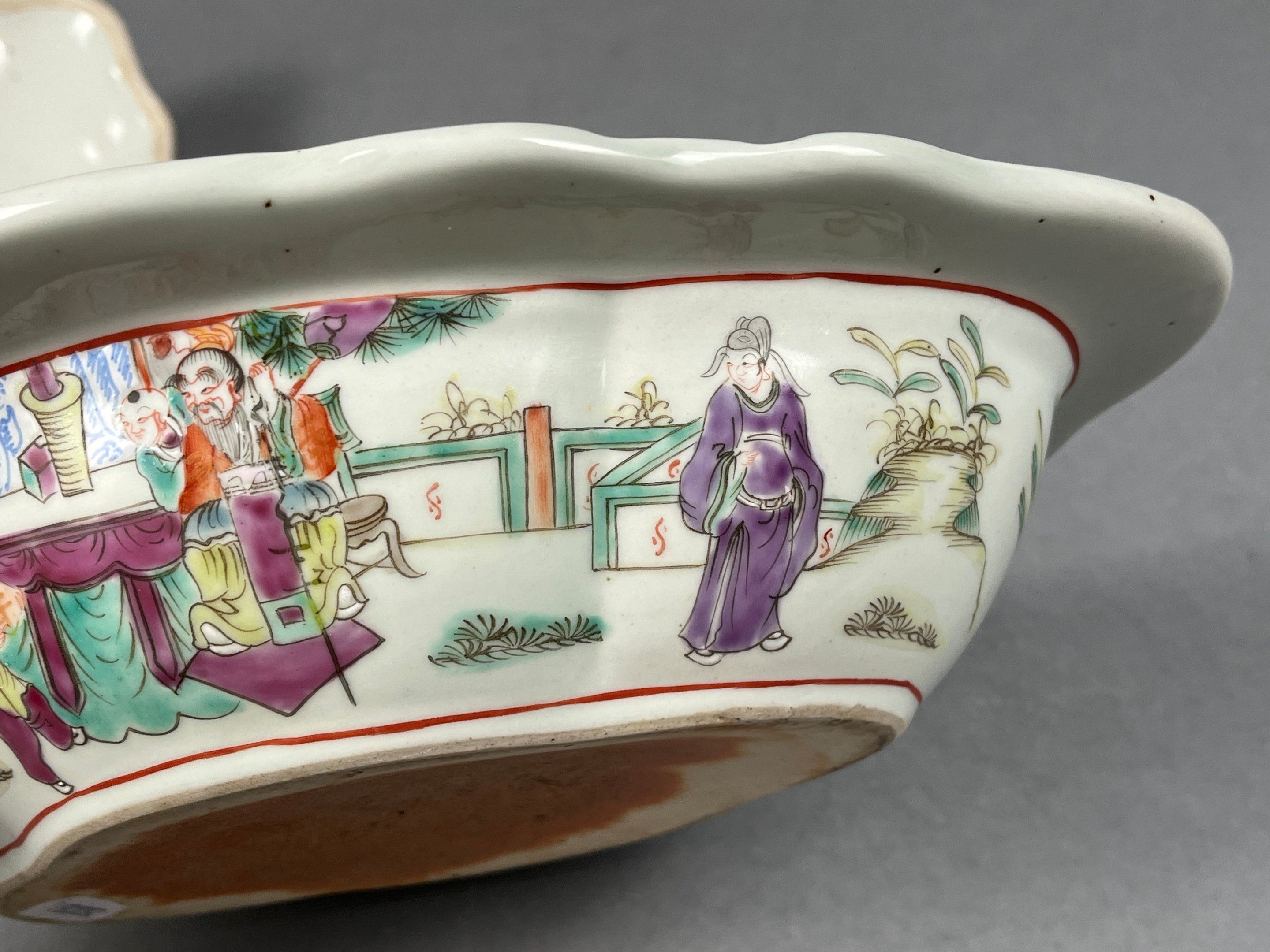 CHINA. Porcelain vegetable dish with polychrome decoration in the famille rose style. Late Qing dynasty (1644-1912). L. = 30 cm.