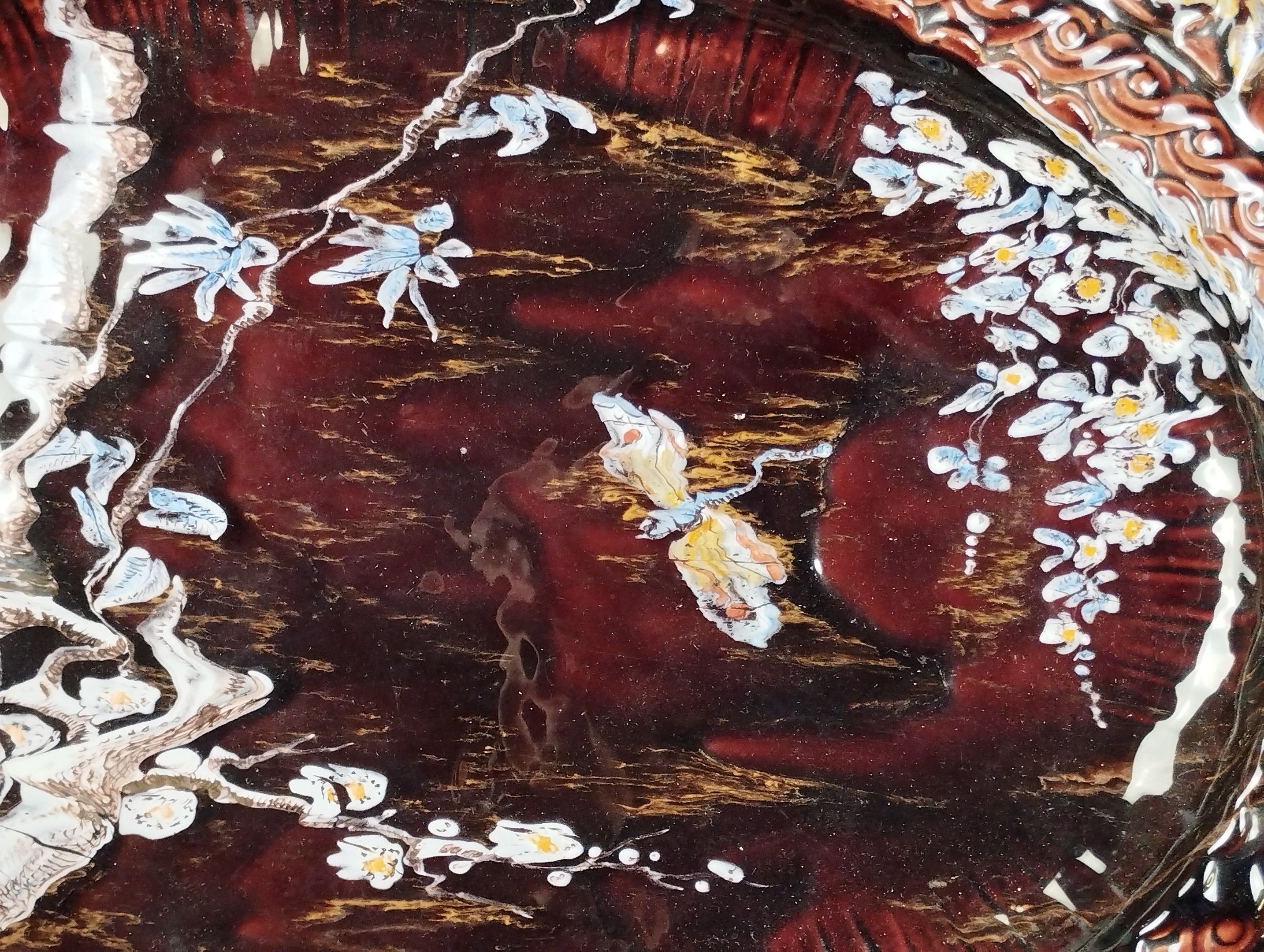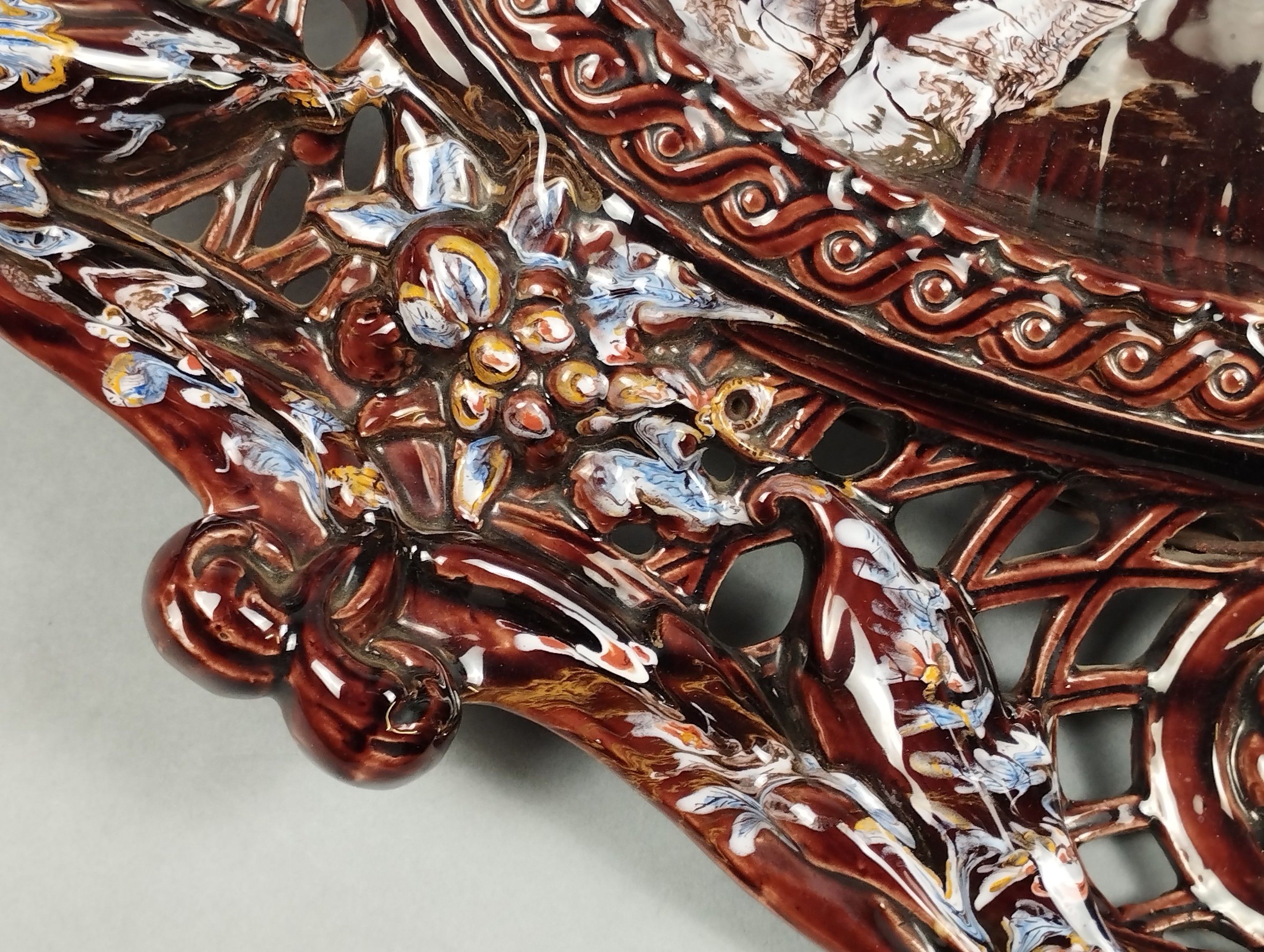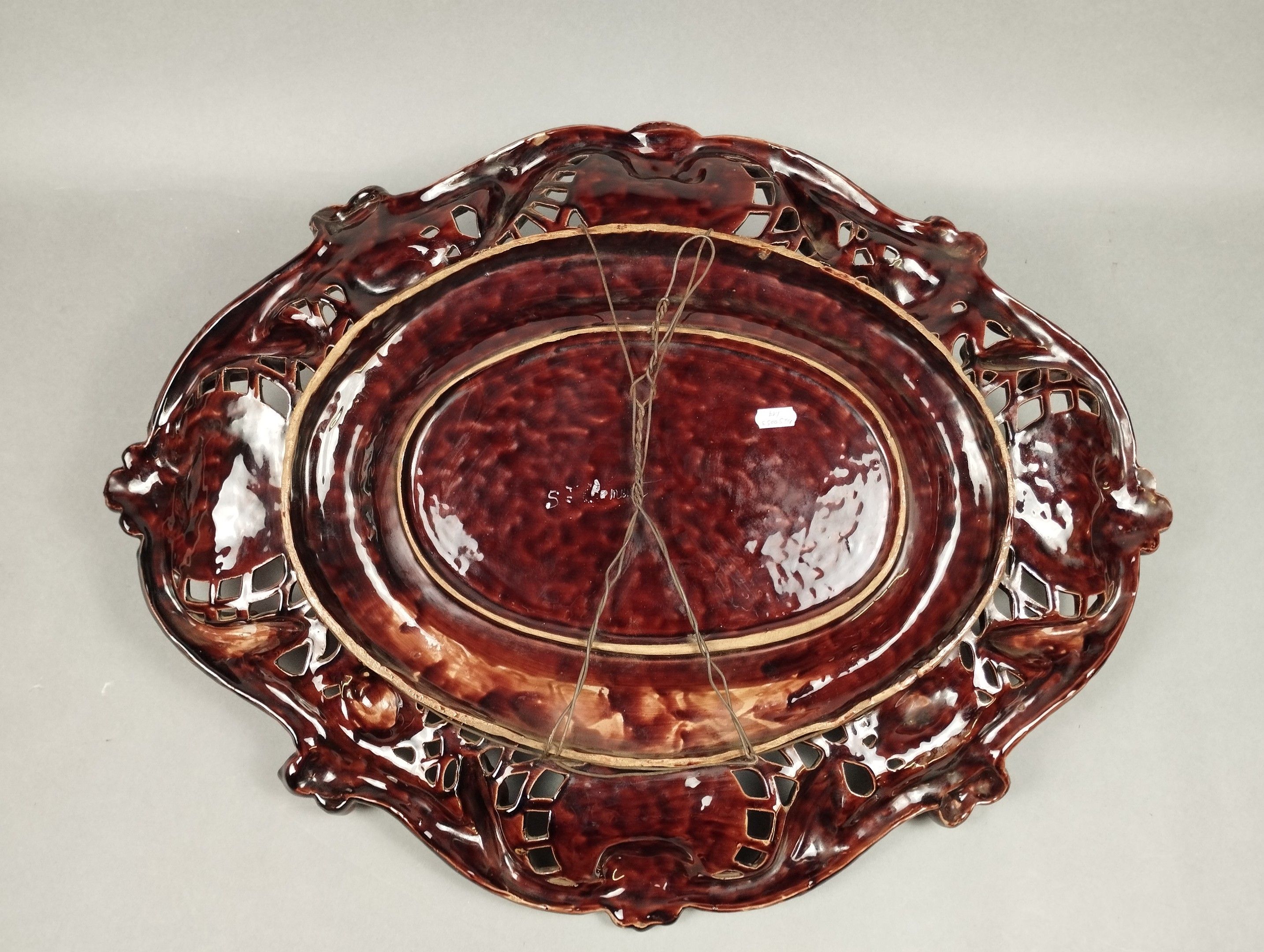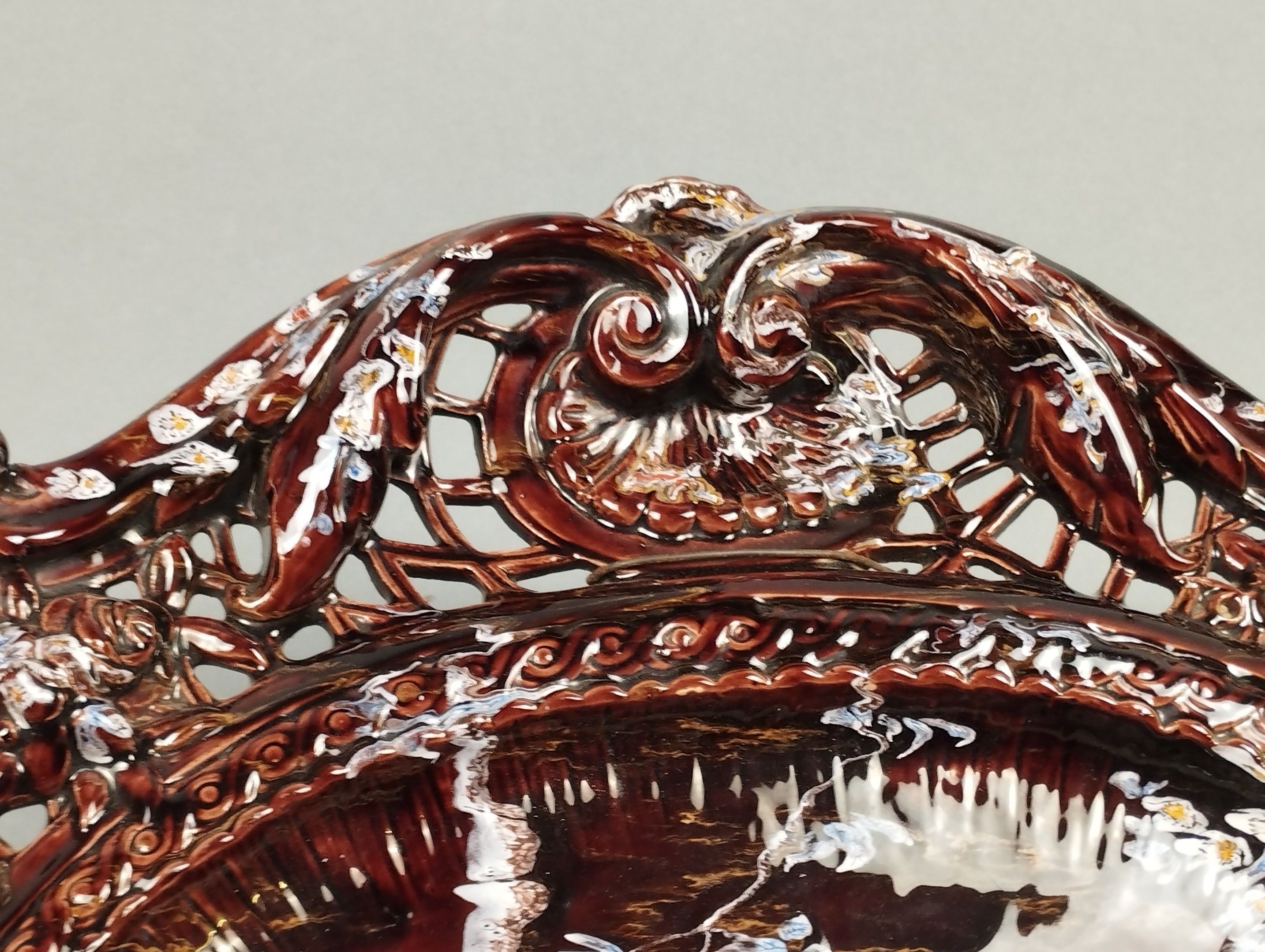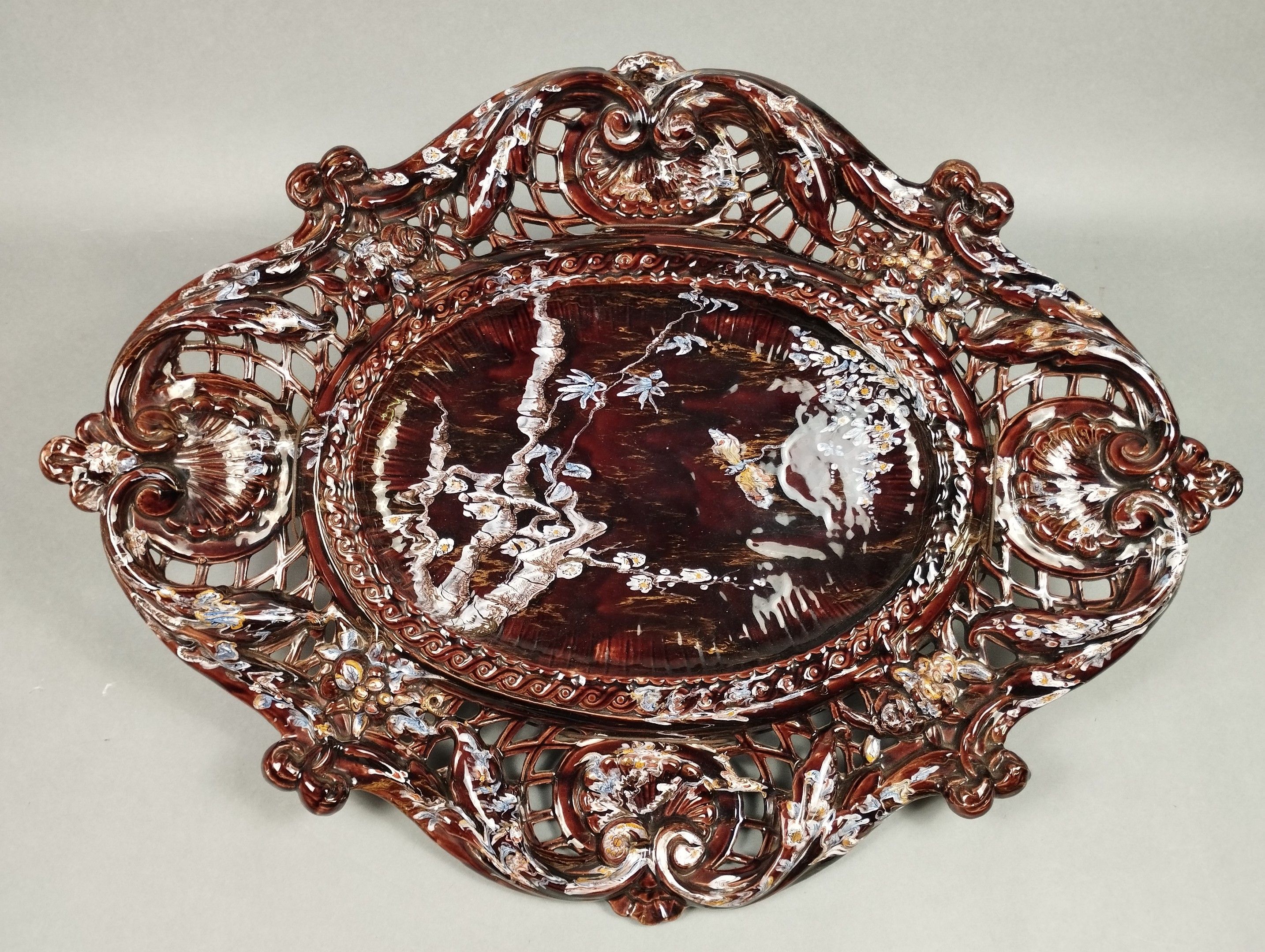 SAINT-CLEMENT, Lorraine. Large Rocaille-style presentation dish with rare Japanese decoration of dragonflies and trees in blossom. Emile Gallé period - 1870-1880. 54 x 71 cm.