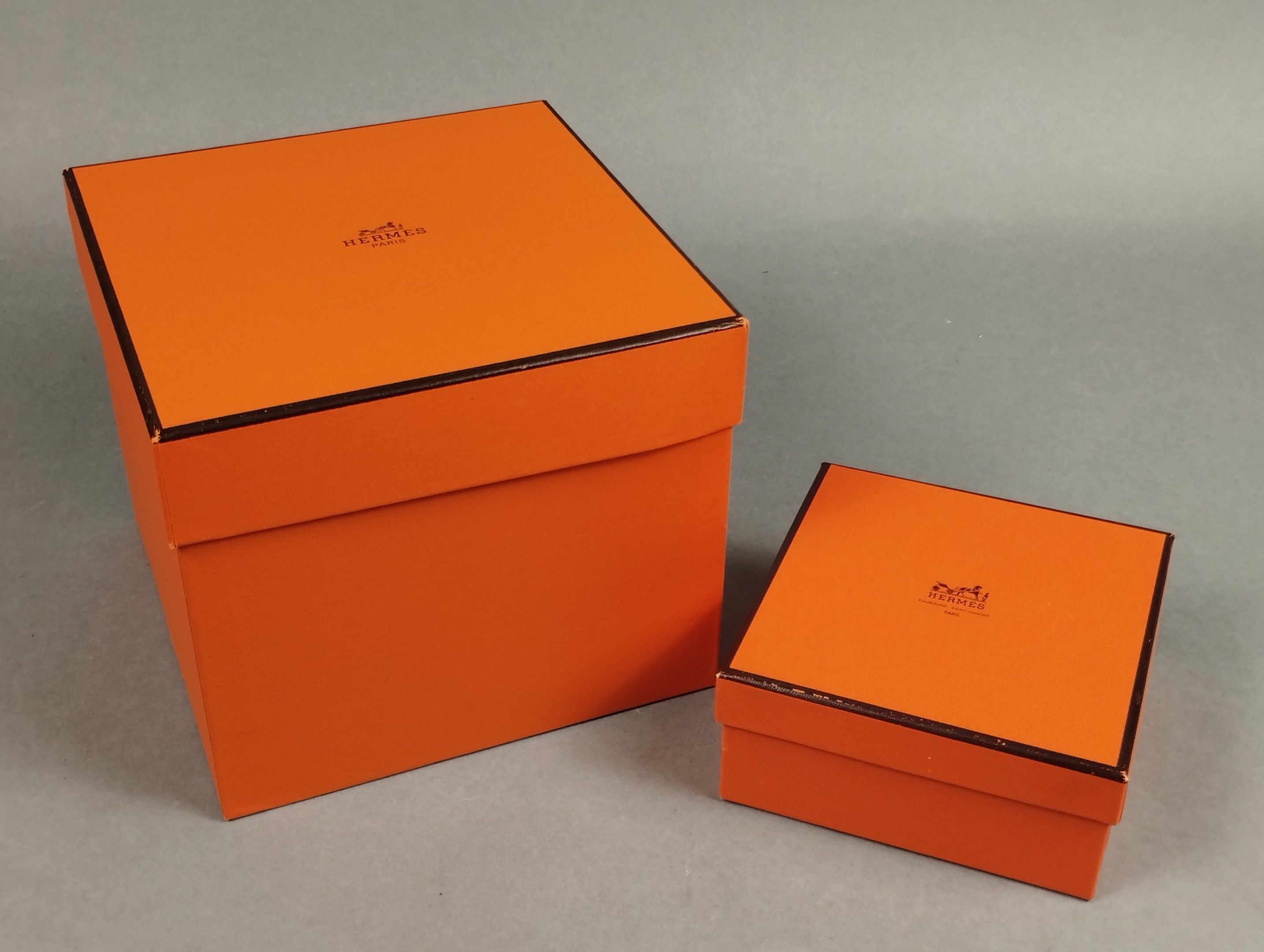 HERMES, Paris. Reunion of two orange cardboard boxes: 13.8 x 13.8 x 6.8 (with its ribbon), and 19.8 x 19.8 x 16.8 cm. Very good condition.