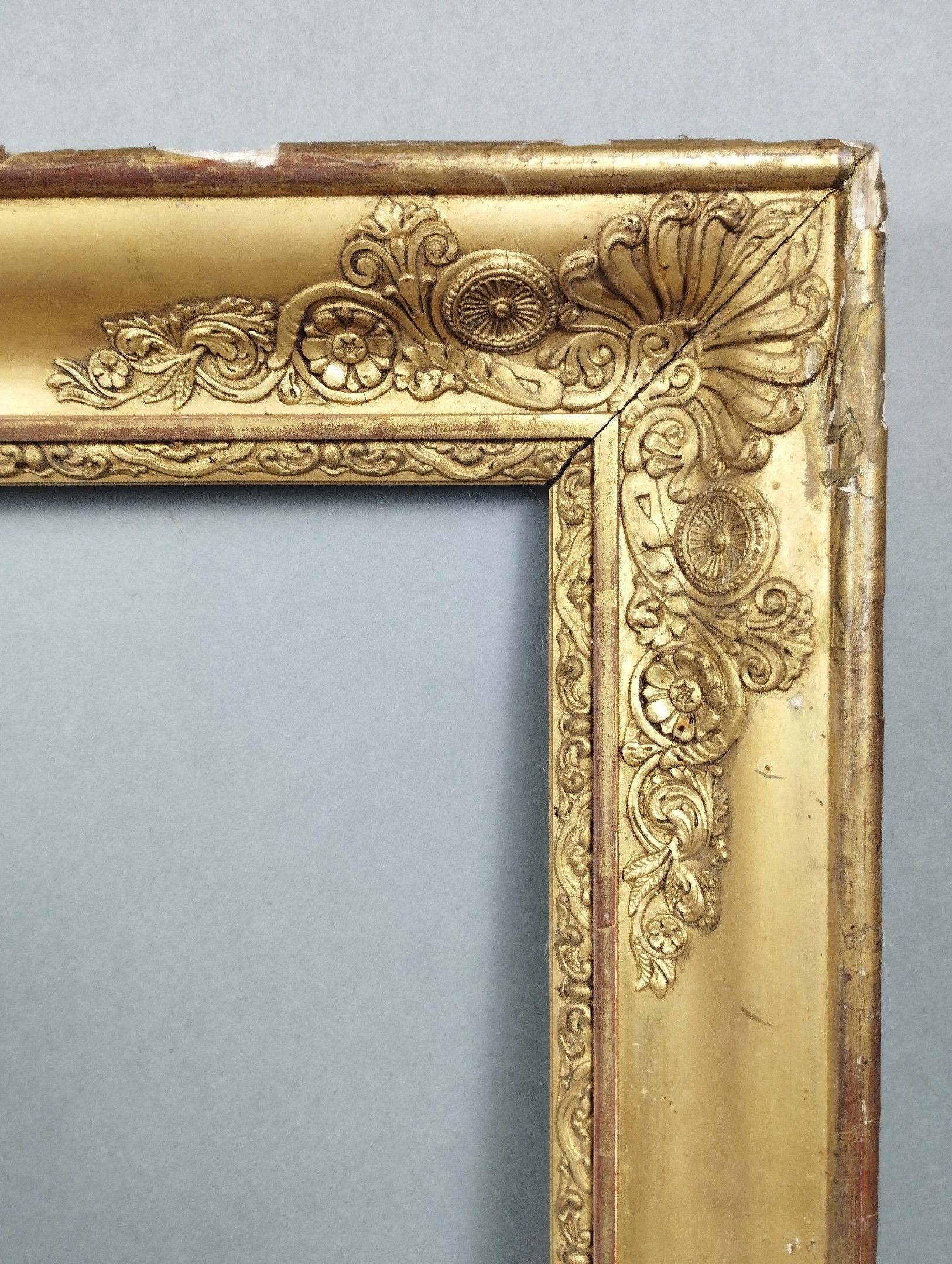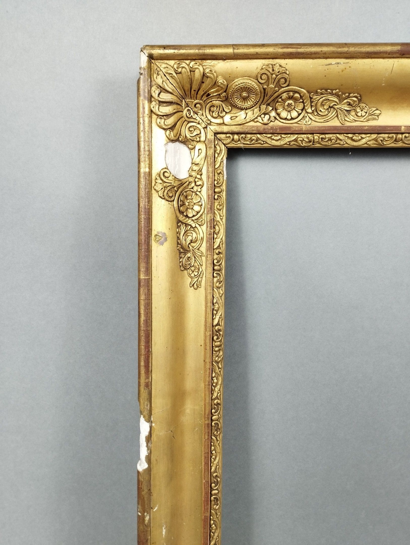 An Empire period giltwood frame with palmettes motifs. Early 19th century. Rebate dimensions: 50 x 61.5 cm. Overall dimensions: 60.5 x 73 cm. Misses and accidents.