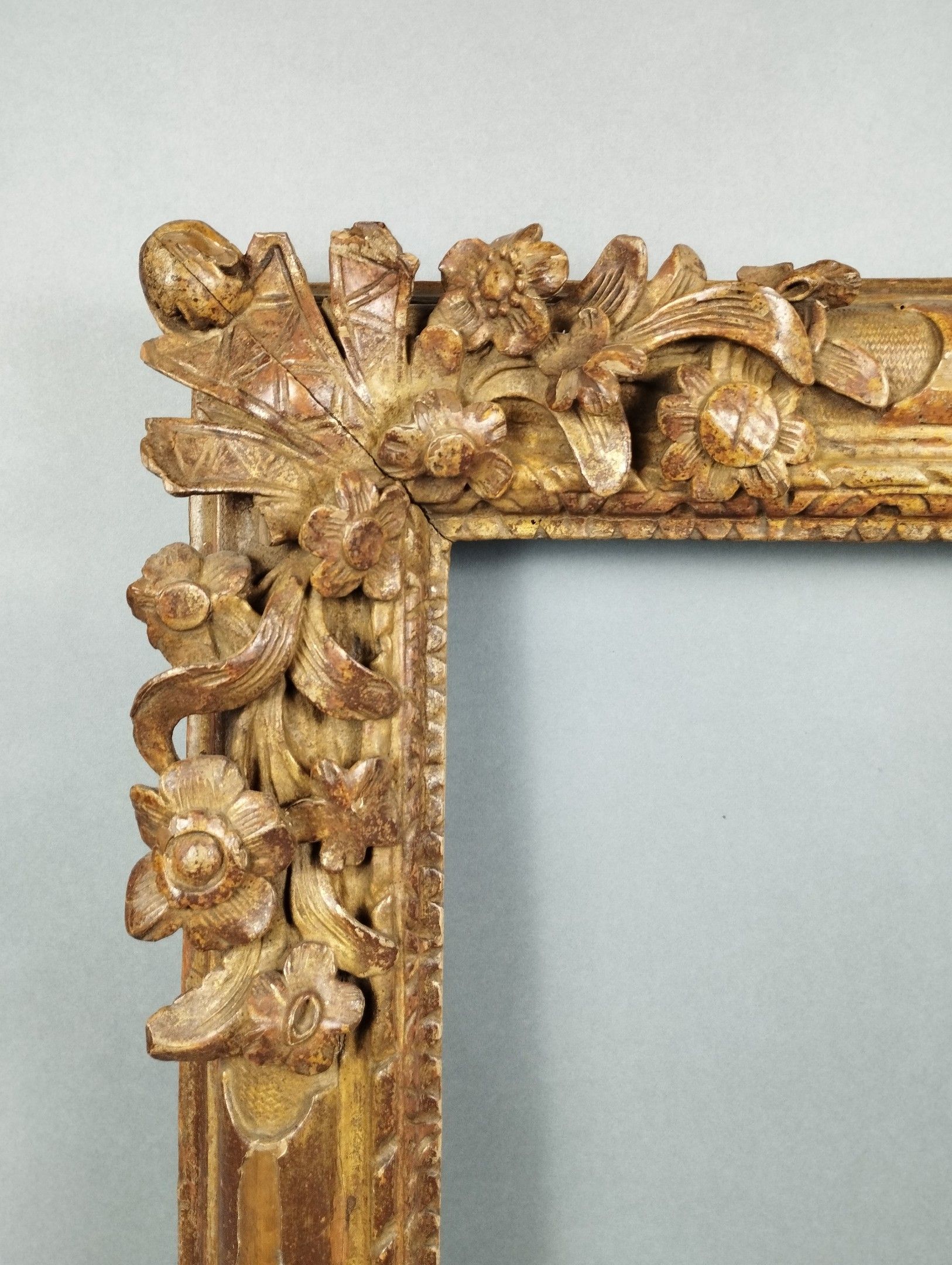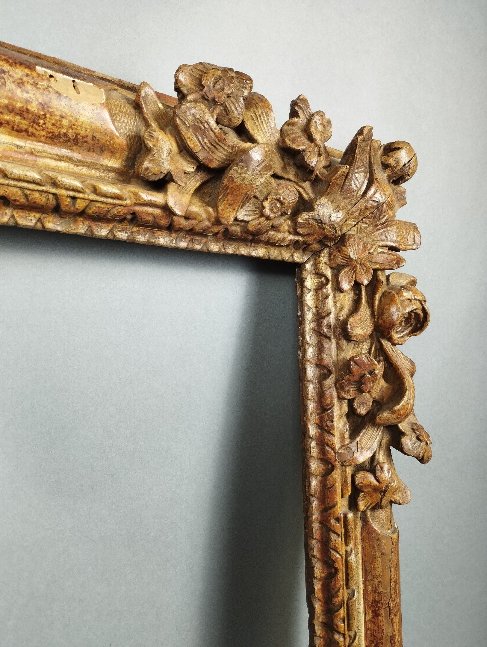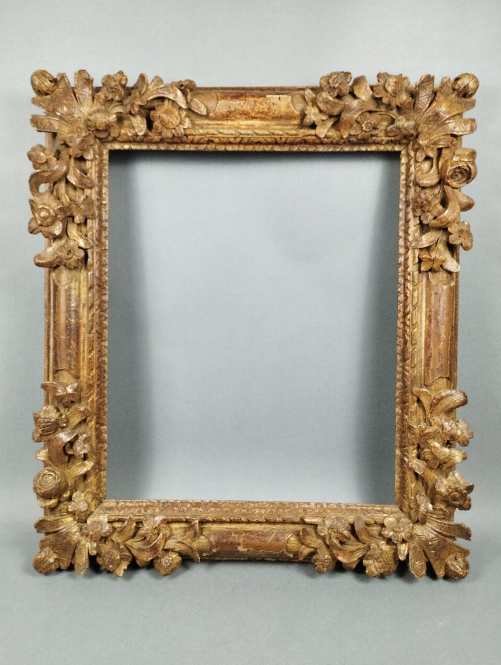 A rich Louis XIV period frame in carved and gilded wood, decorated with flowers and parchment spandrels. Late 17th century.