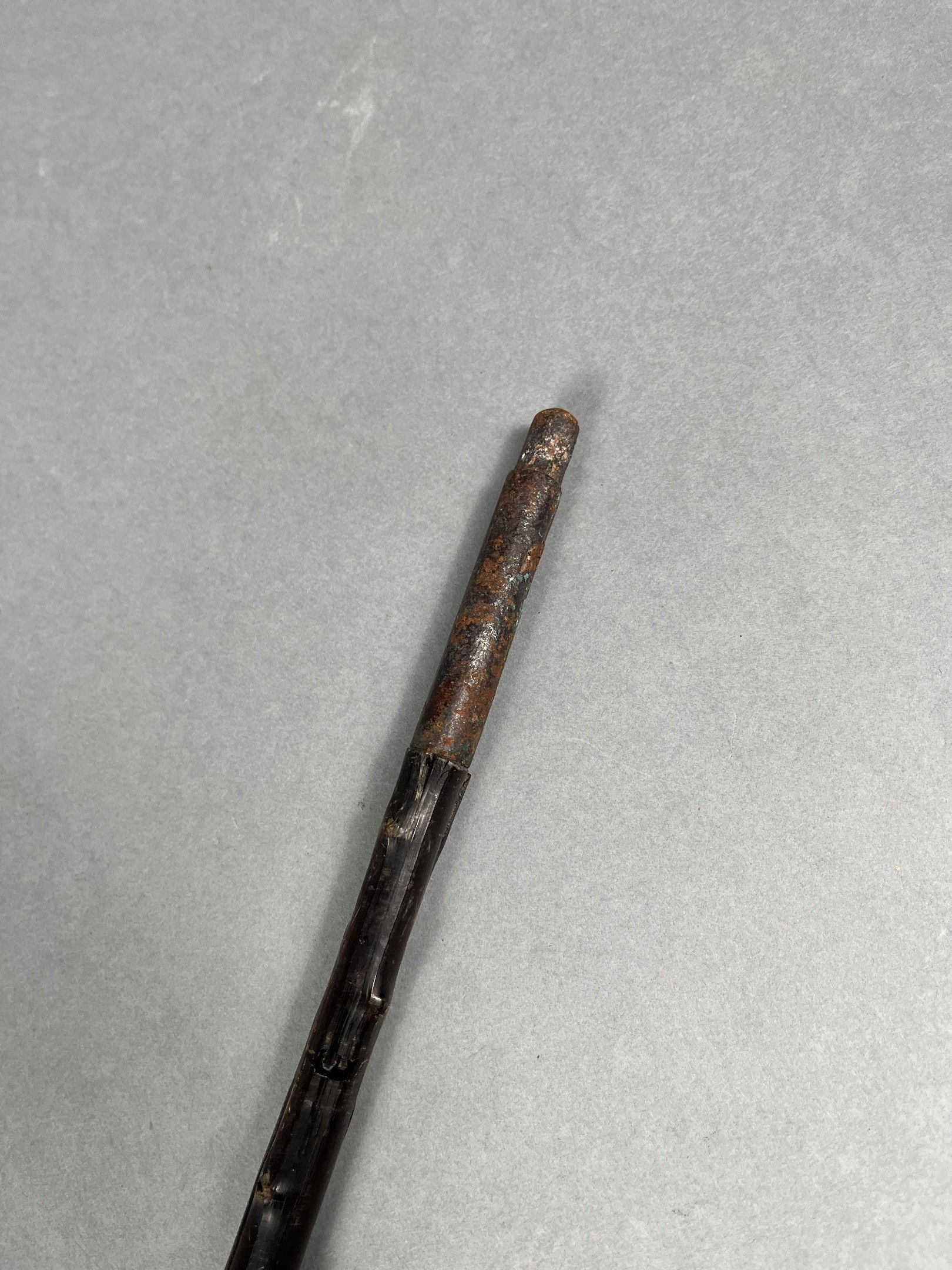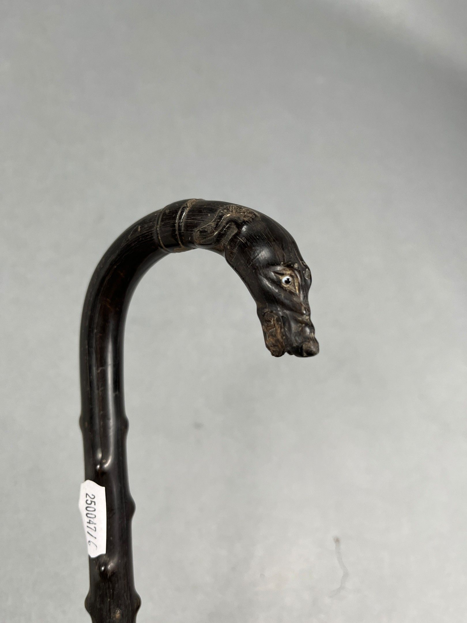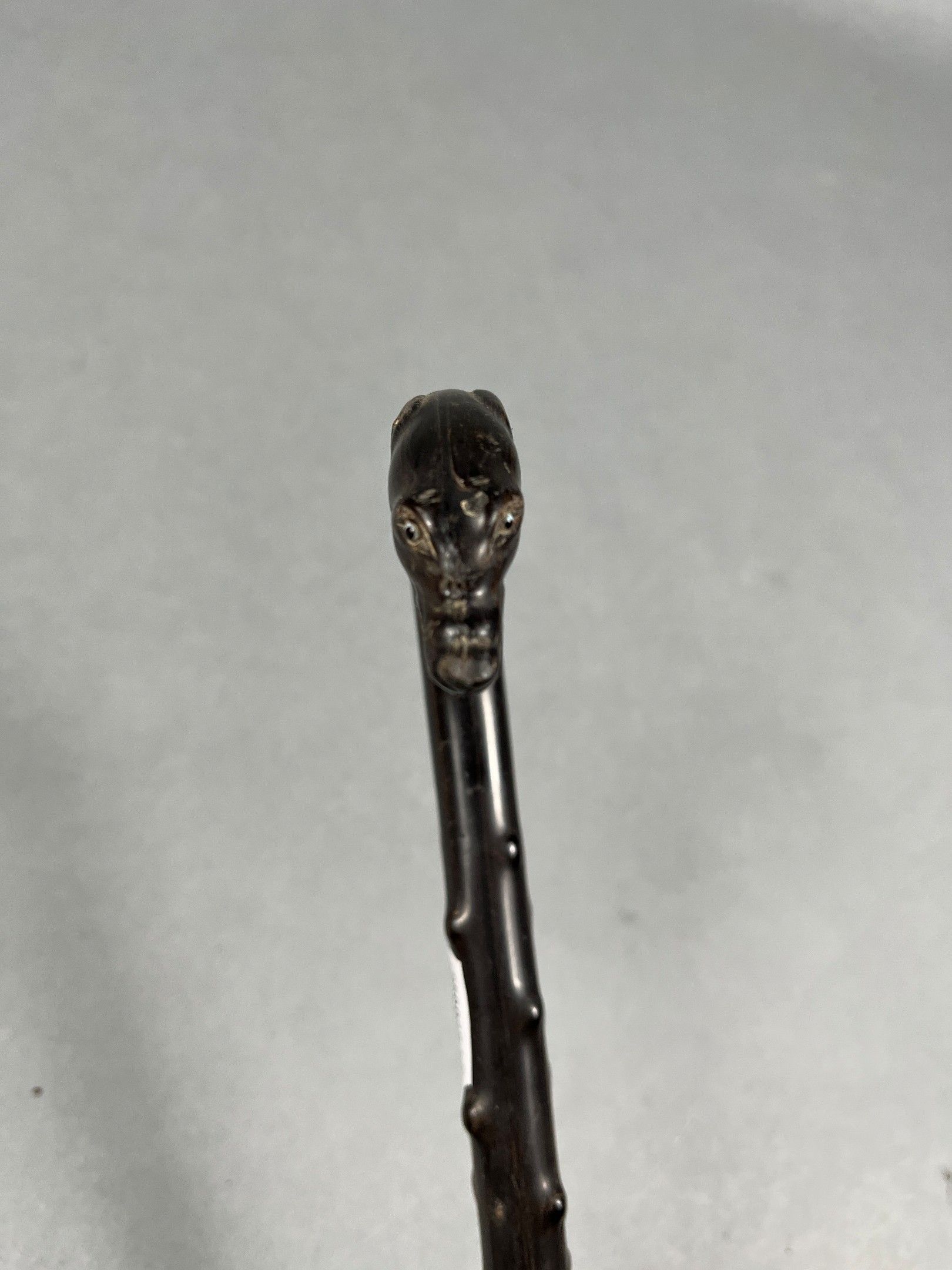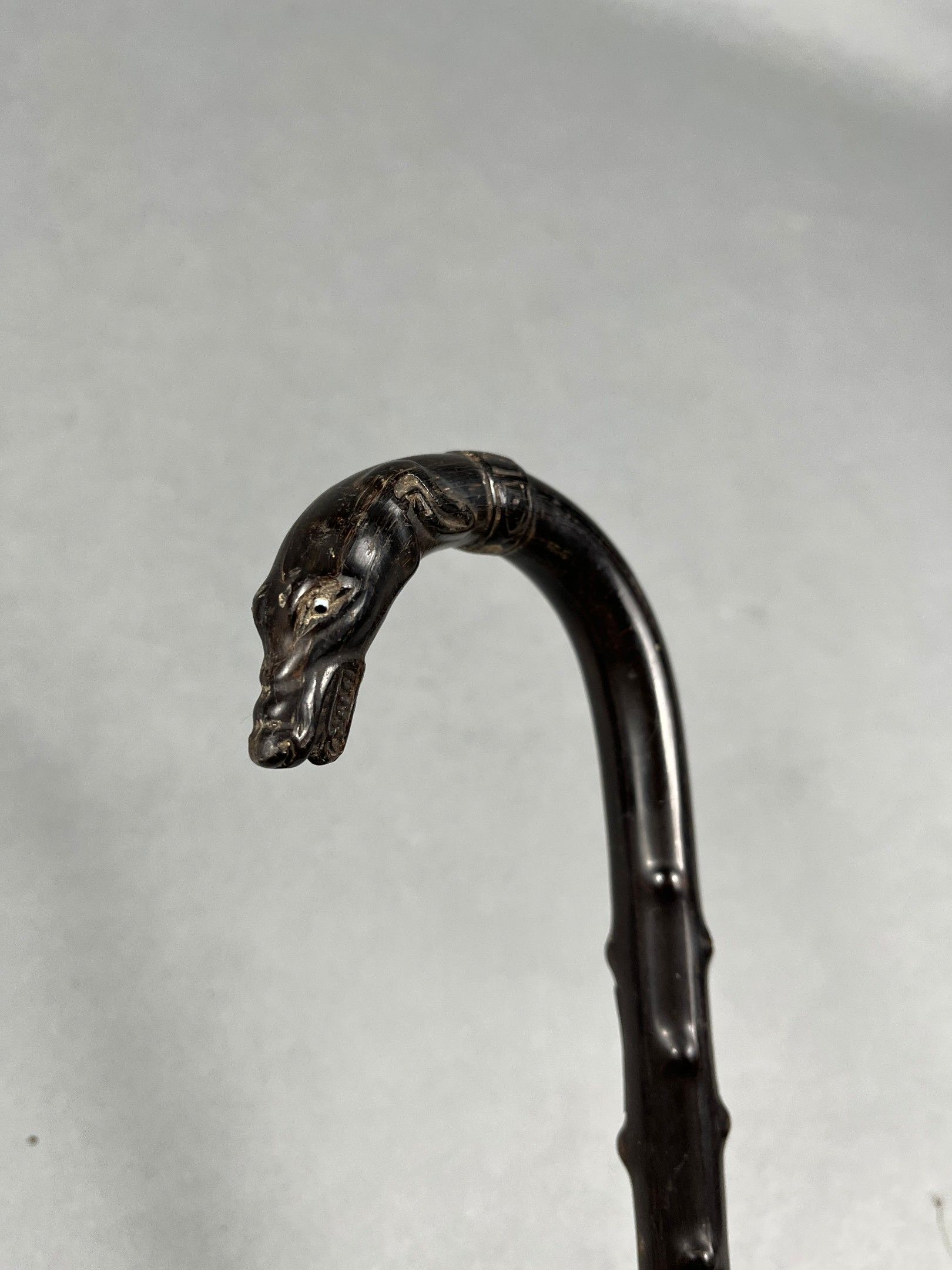 Cane in moulded horn, imitating bramble, the pise depicting a greyhound's head, the eyes in sulphur. Metal ferrule. L. = 93 cm (minor accidents)