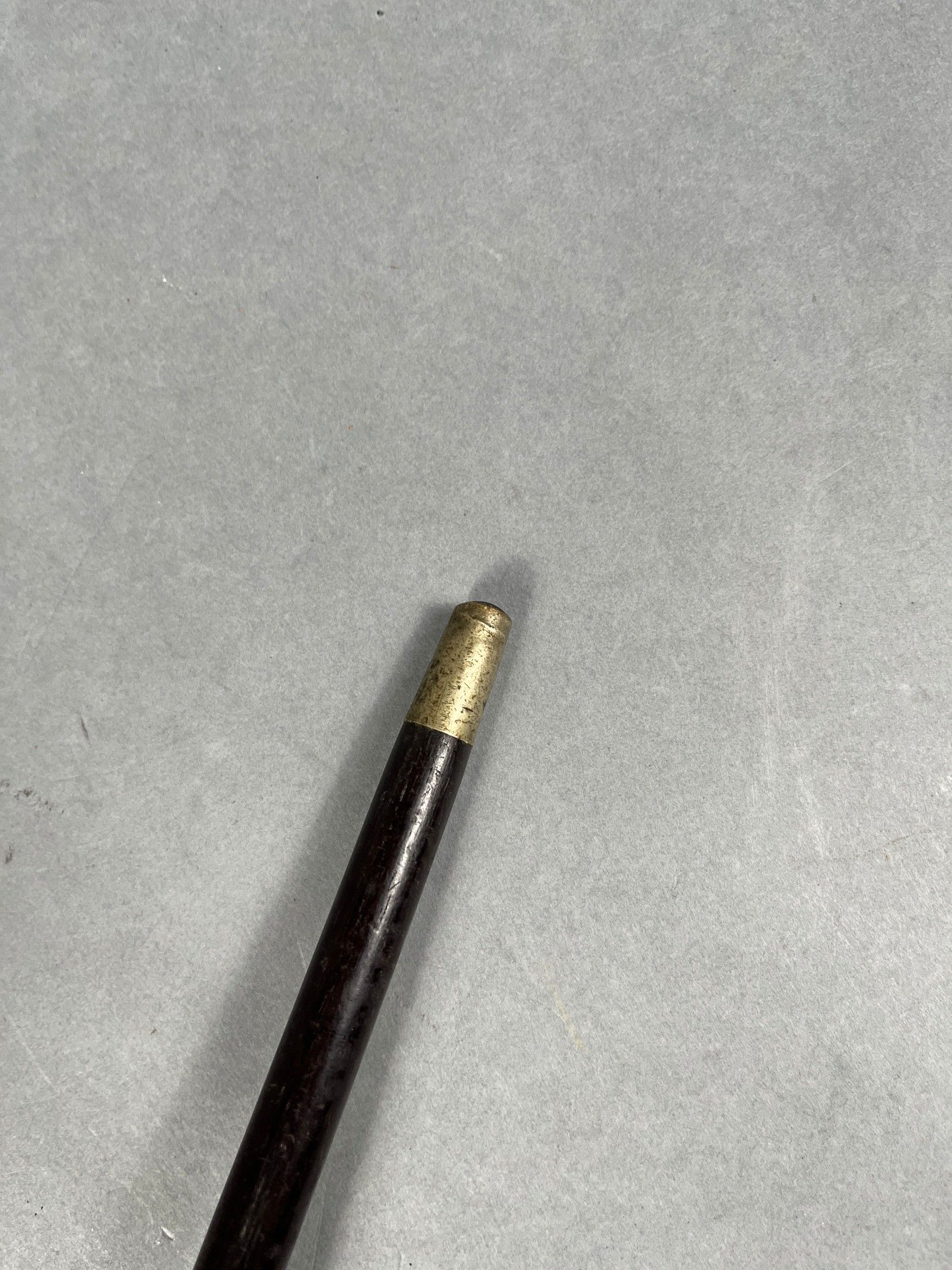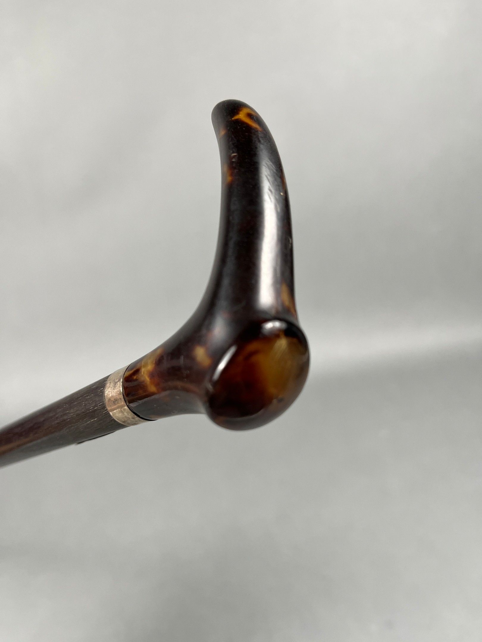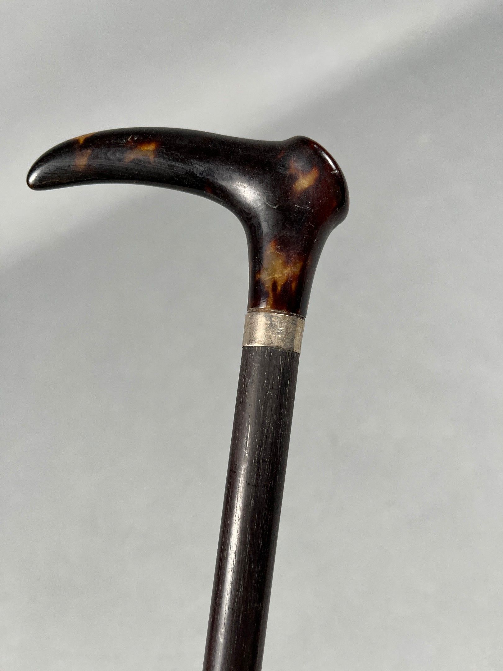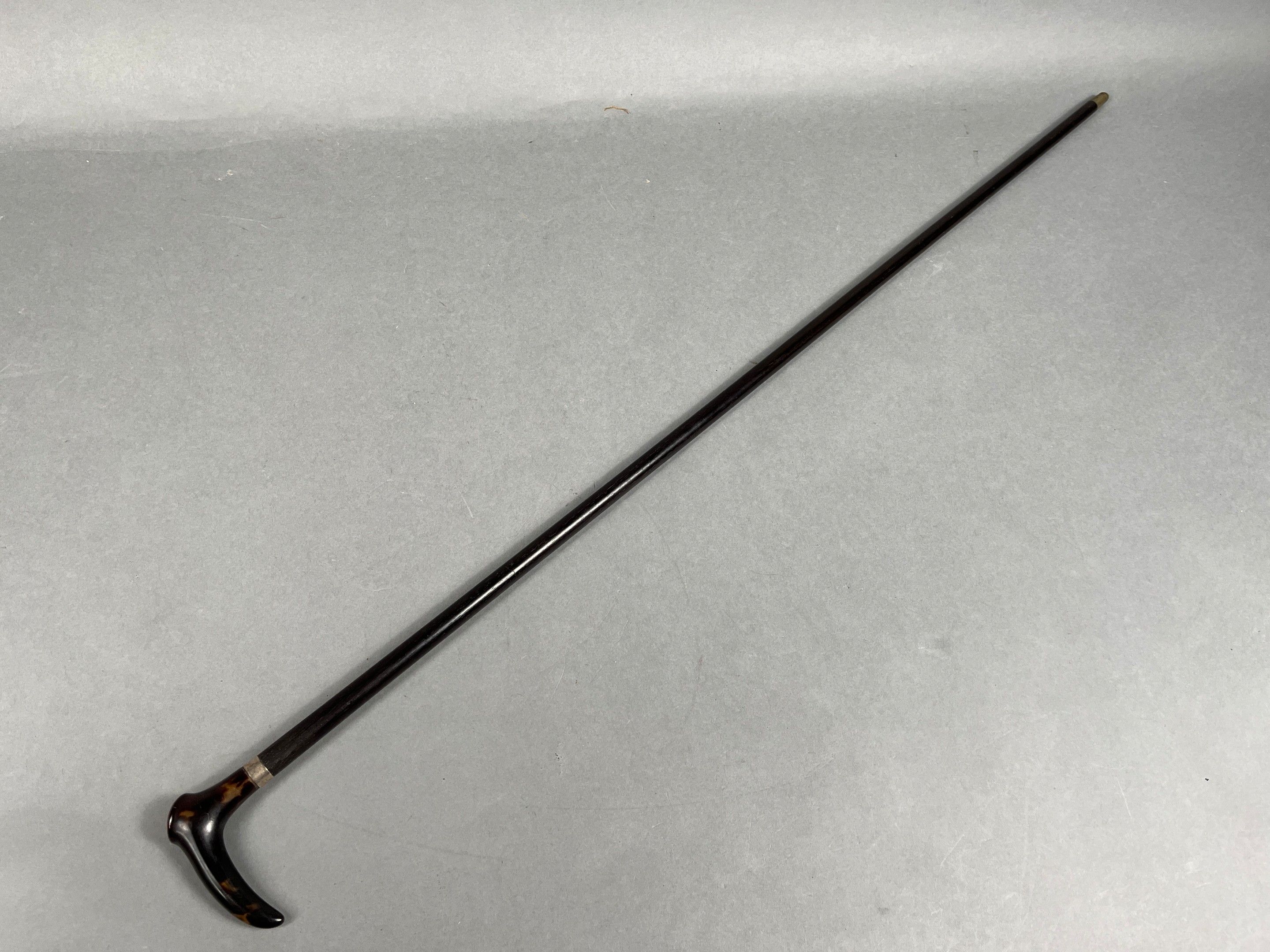 Cane with tortoiseshell grip (slightly banged) and rosewood shaft. Metal ferrule. Length = 95.5 cm.