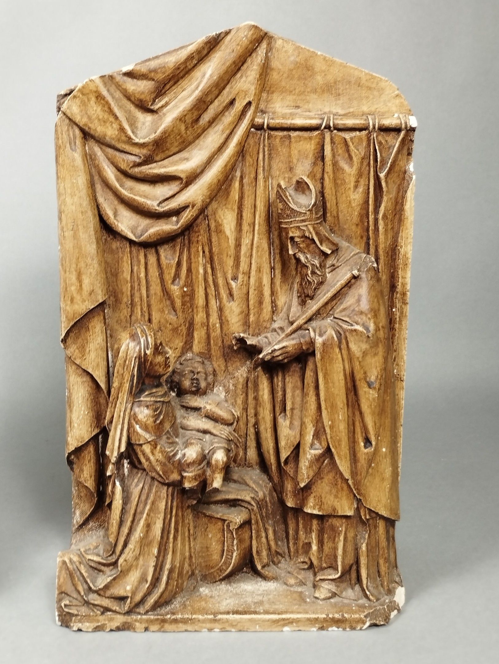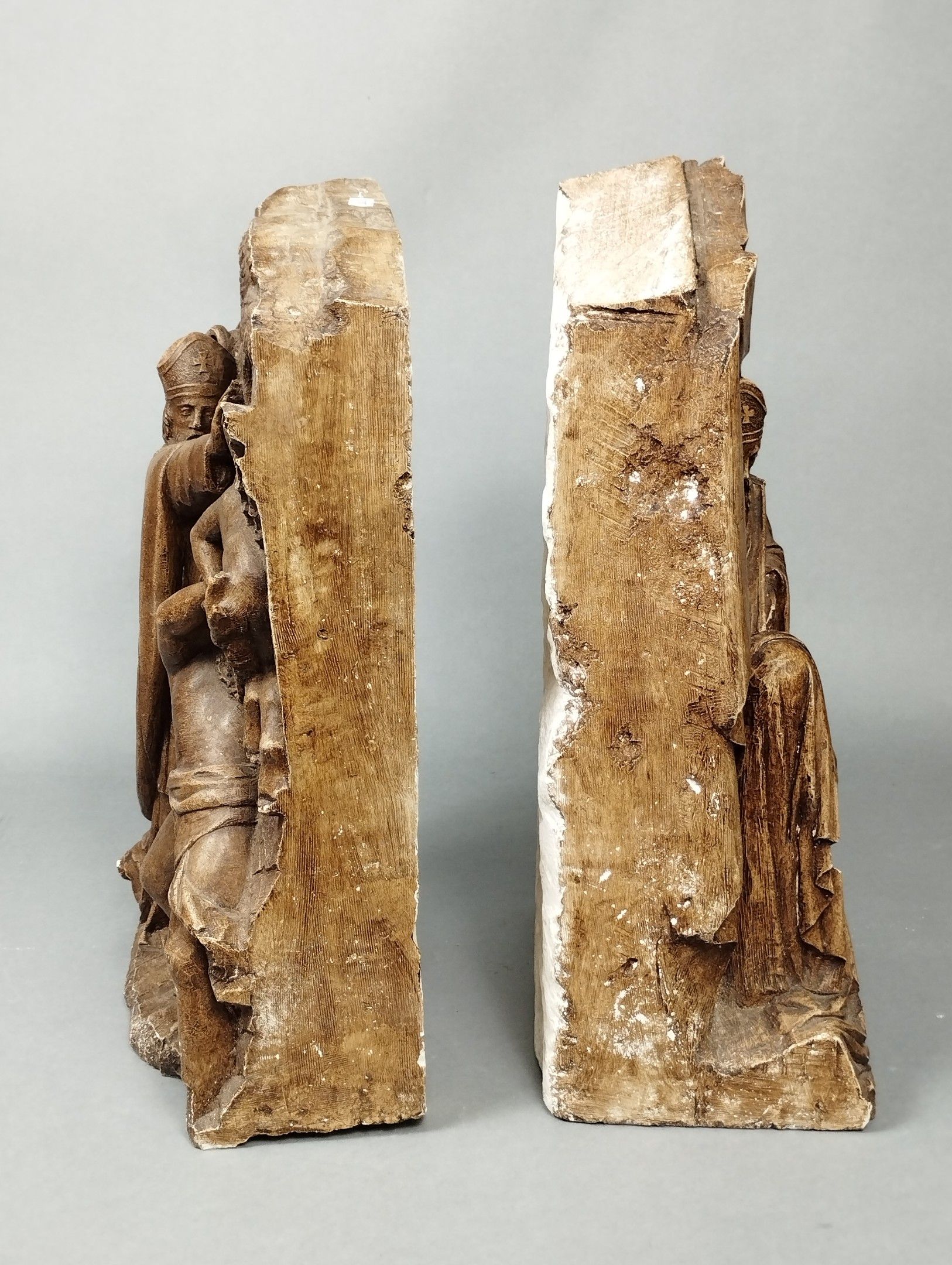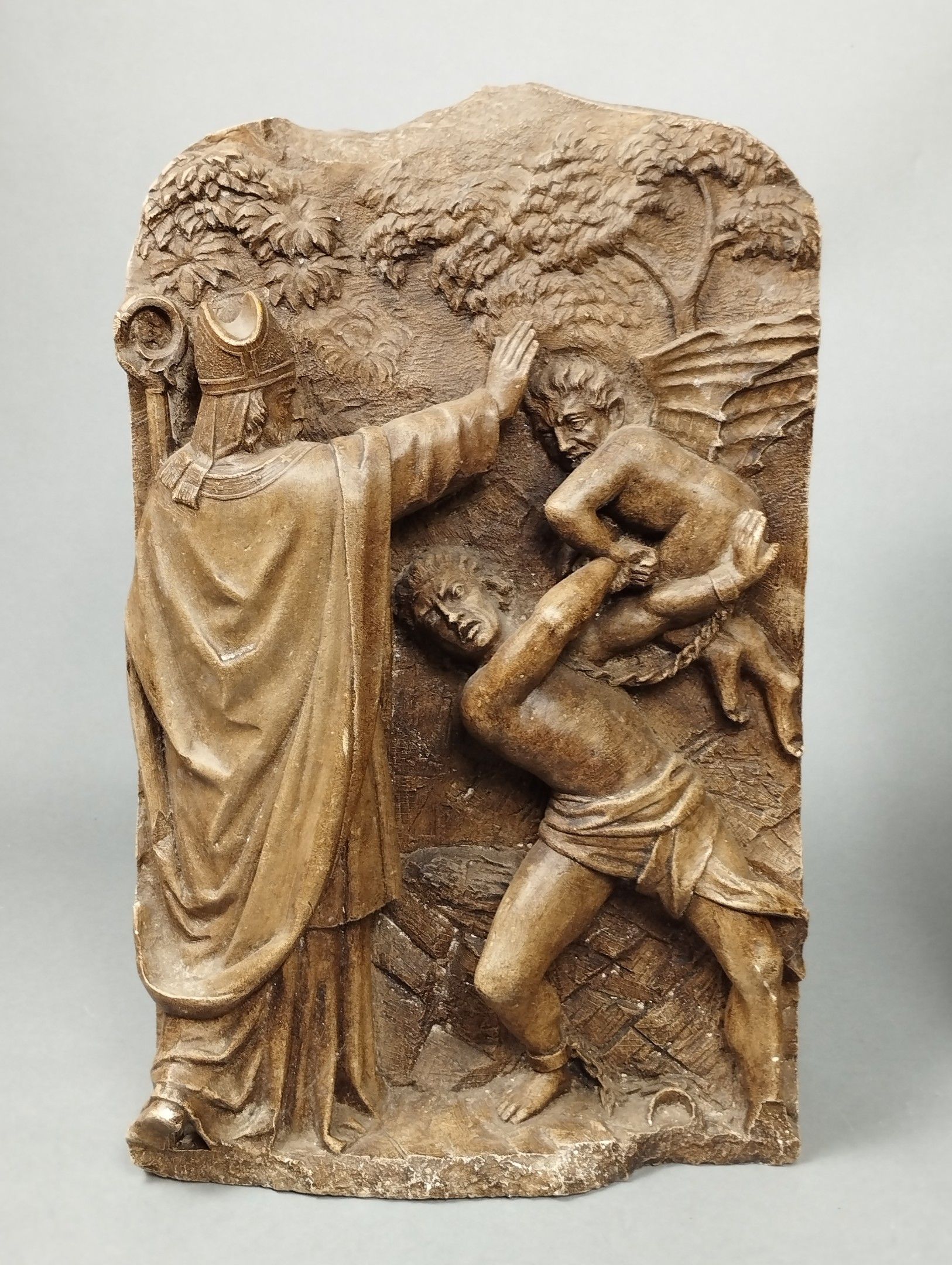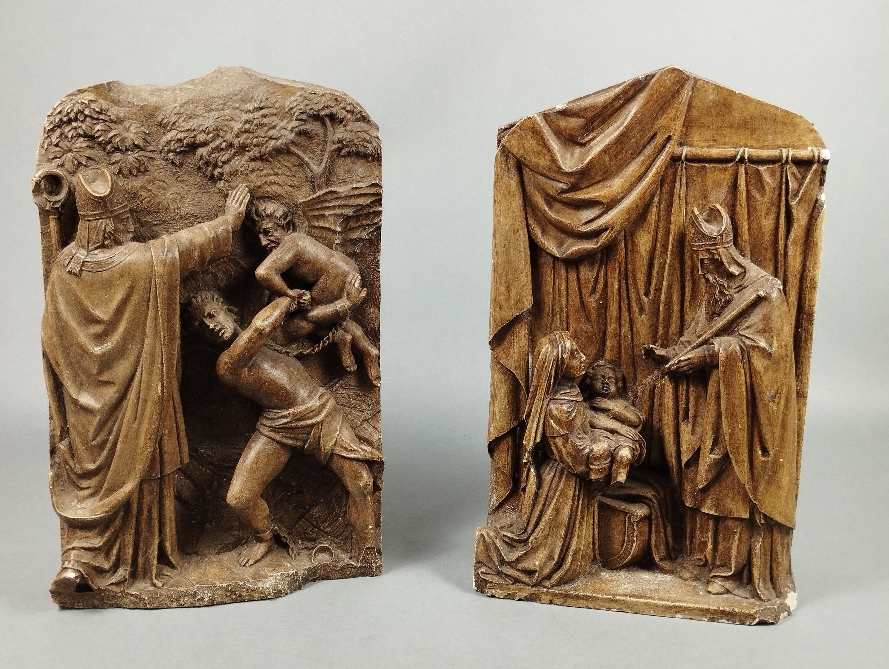 Pair of thick bas-reliefs in carved limestone with a patina, probably from an altar, representing episodes in the life of a holy bishop, driving the demon out of a possessed person or resuscitating a child. Late 19th century. Approximately 50 (high) x 30 cm. Minor accidents.