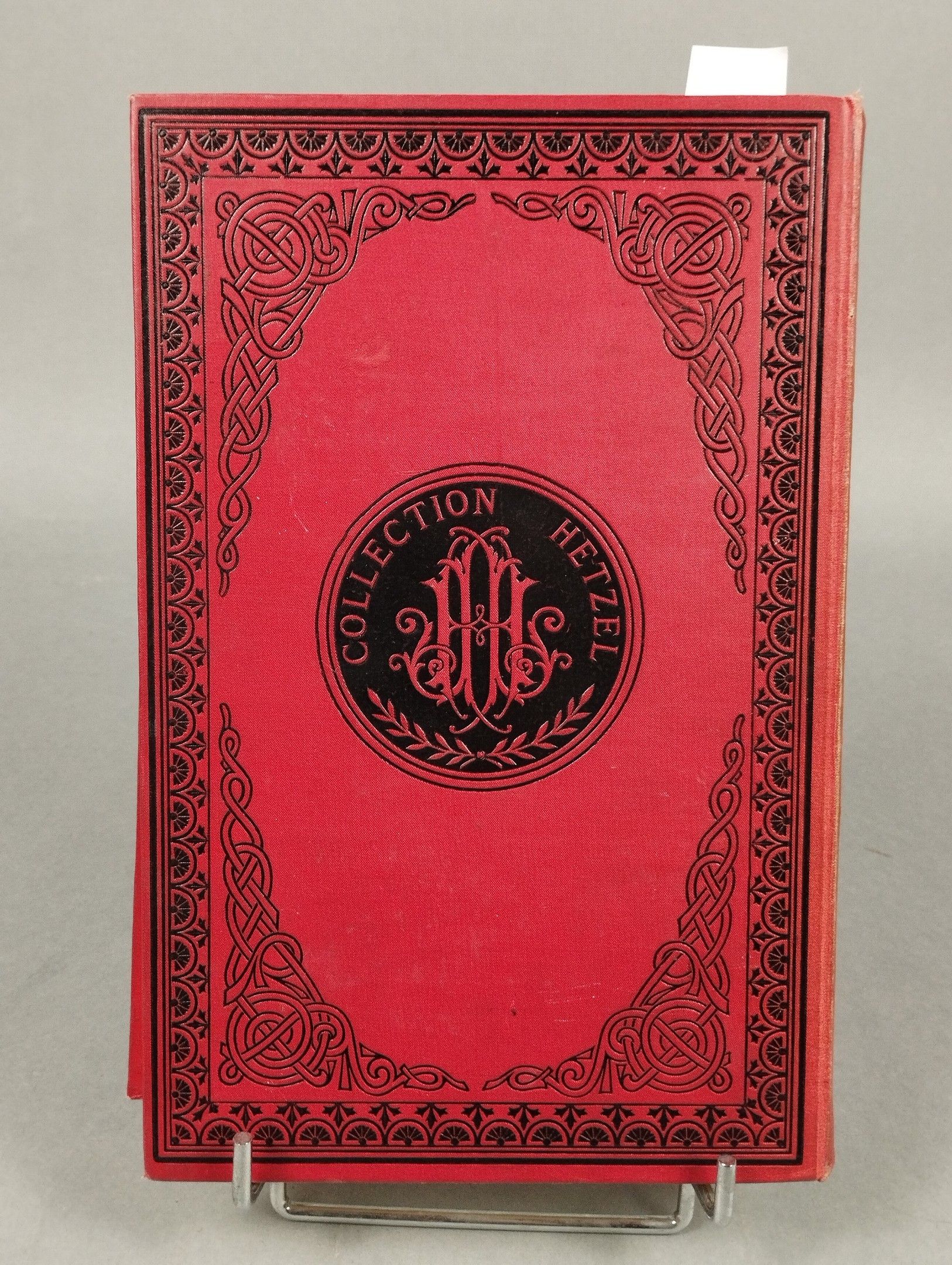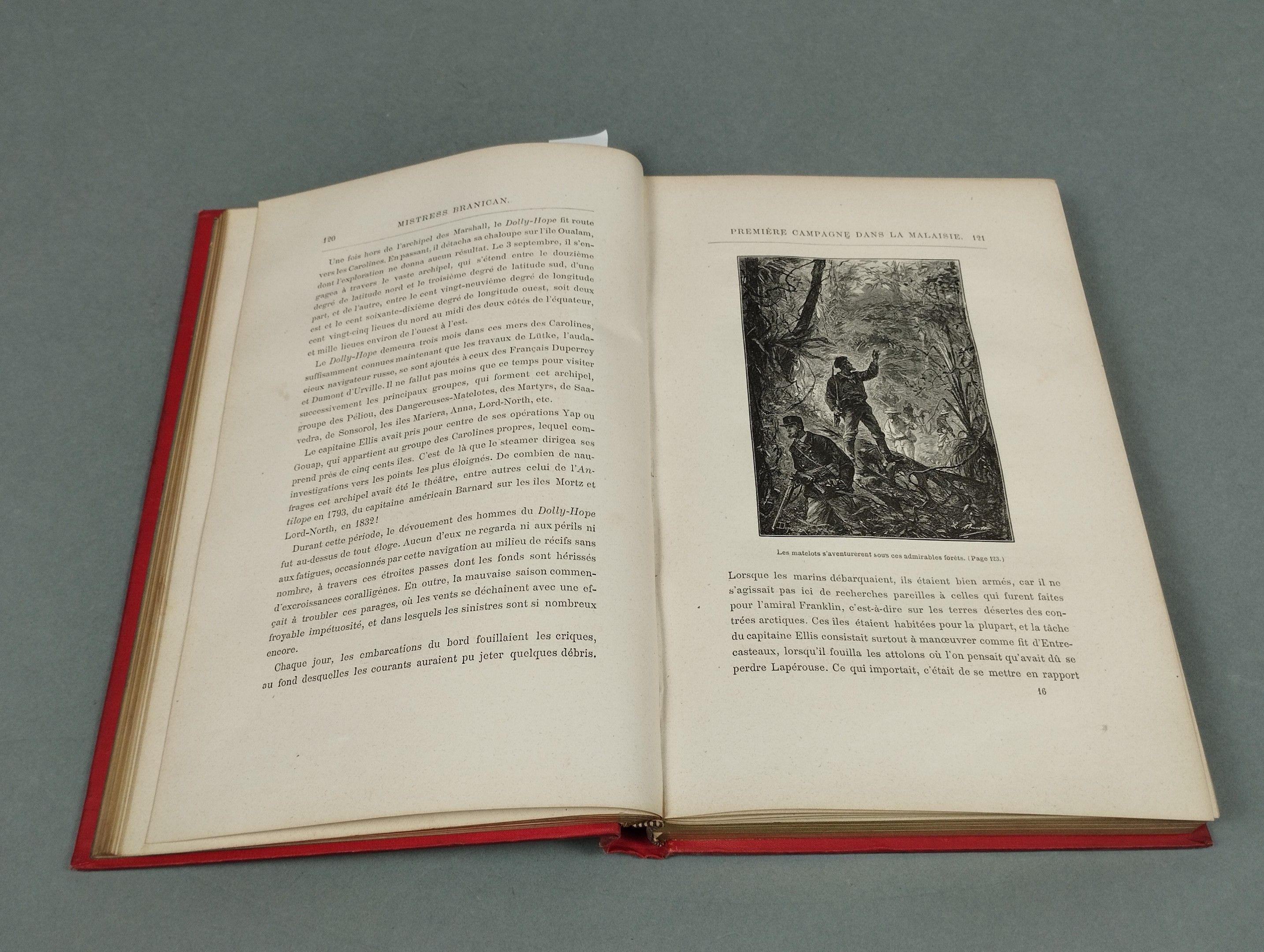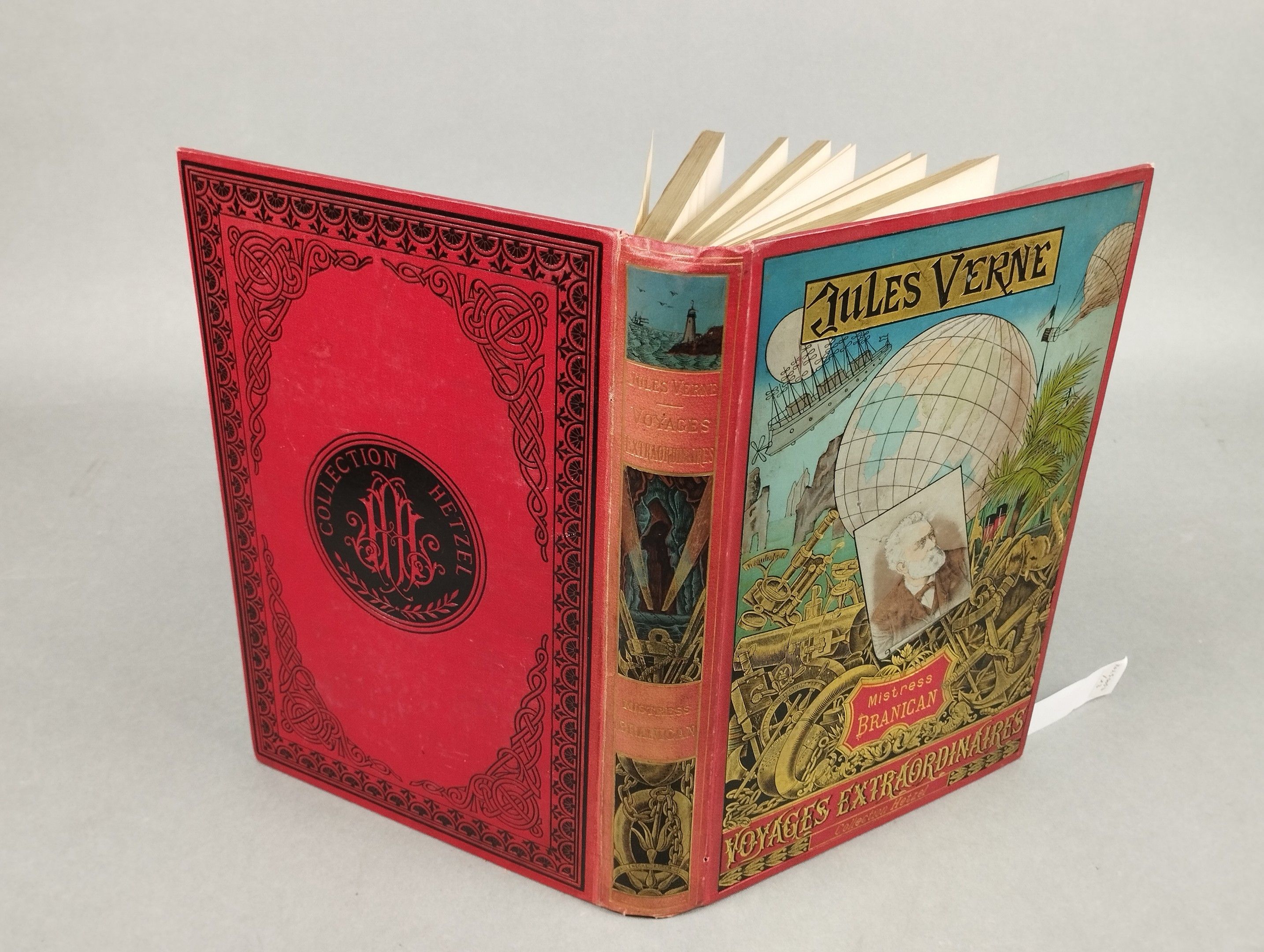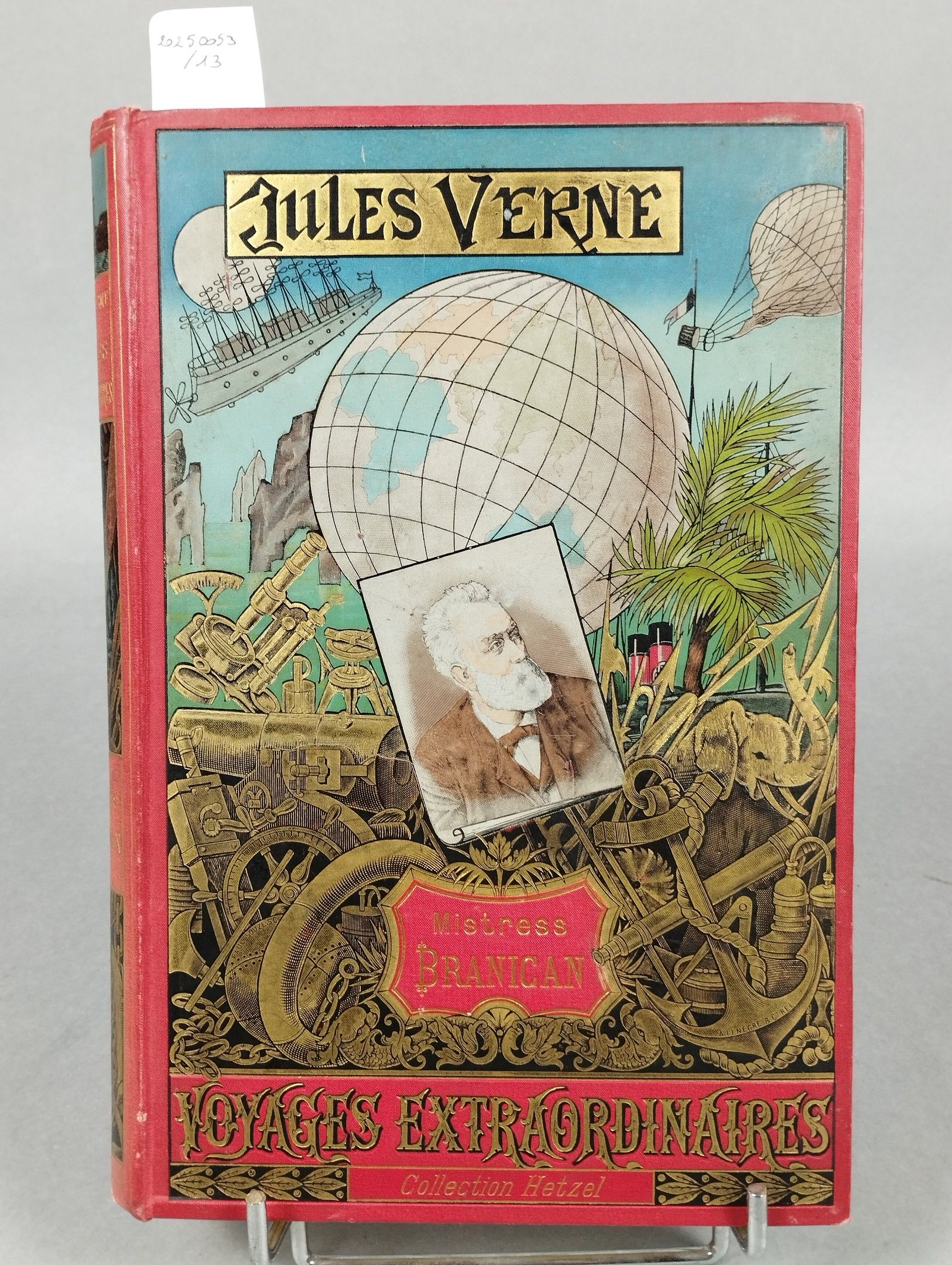 VERNE (Jules). Mistress Branican, Paris: Hetzel, s.d. [1891], 440 p. Illustrated with 83 drawings by Benett, 12 large chromotype engravings. Polychrome boards, type with printed portrait (1890-1895), spine with lighthouse. First edition. Minor wear and rubbing, spine very slightly faded.