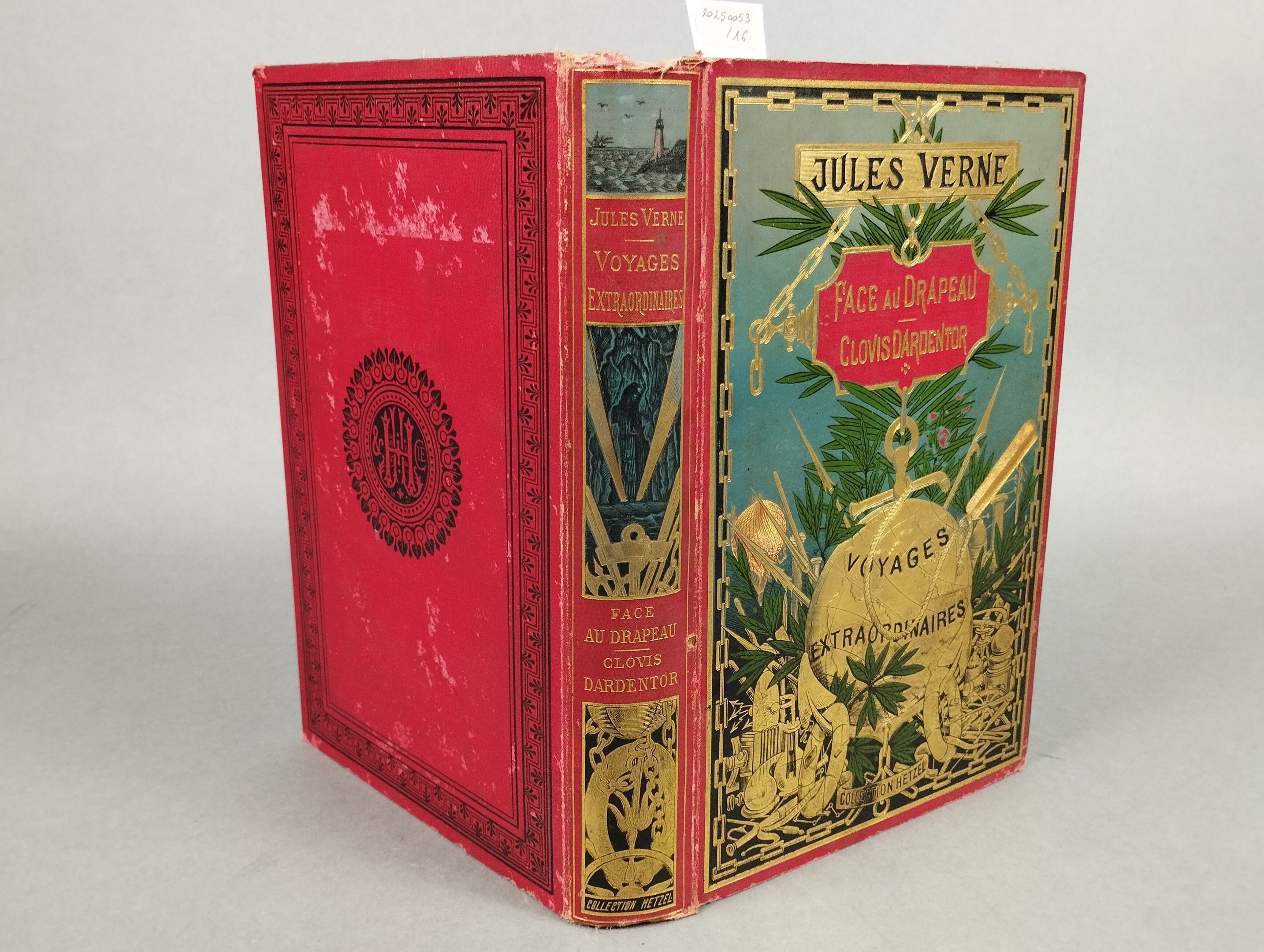 VERNE (Jules). Face au drapeau & Clovis Dardentor, Paris: Hetzel, s.d. [1897], 244 p. Polychrome hardback, type à la mappemonde, dit aussi au globe doré (1896-1905), spine with lighthouse. Wear and accidents.