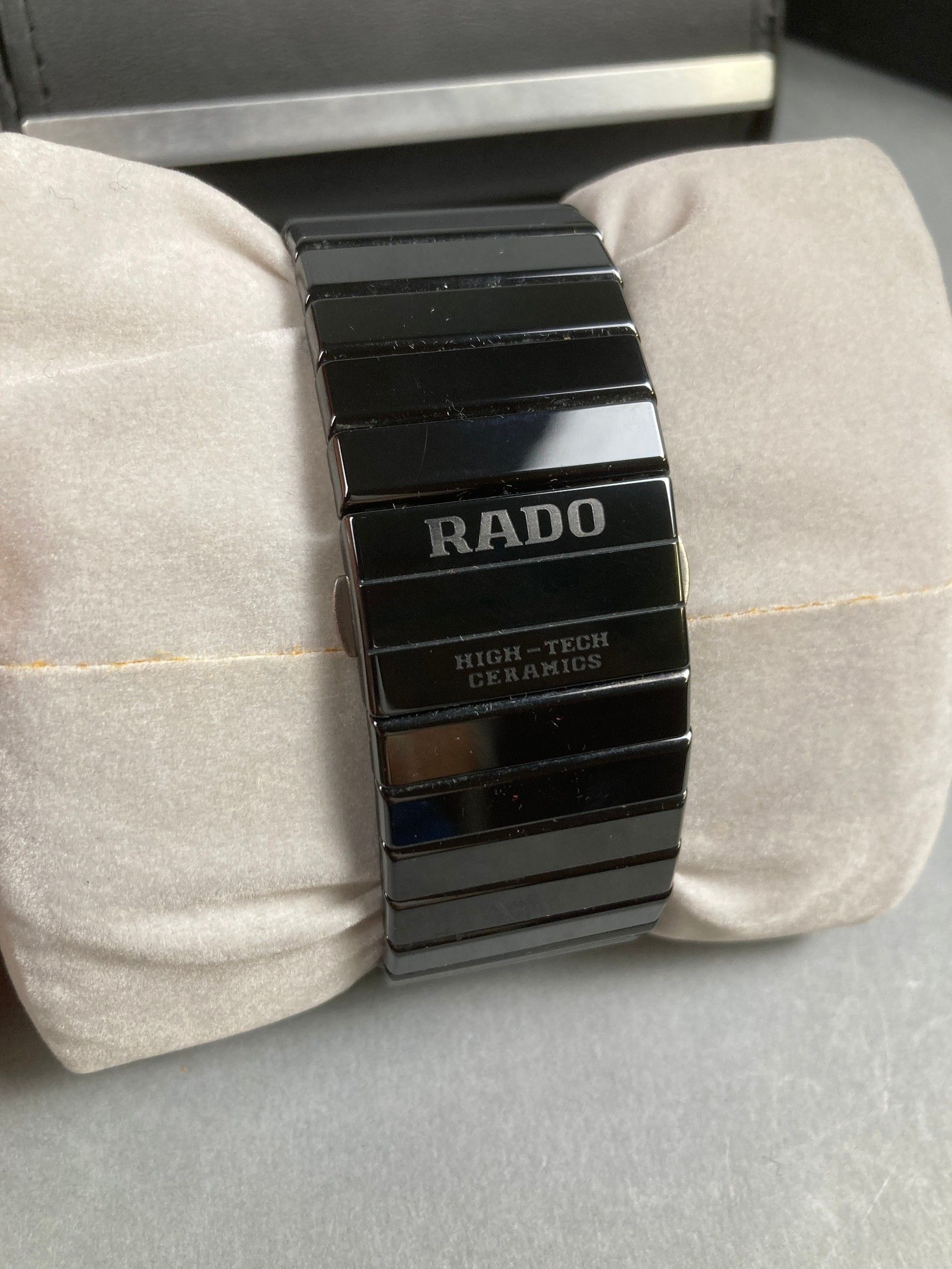 RADO, Switzerland. Diastar" multifunction wristwatch in black ceramic and titanium. Rectangular stainless steel case; black dial with hour markers. Digital and analogue display. Case size: 28 x 34 mm. Battery operated. Strap with folding clasp. In its box, with over-box and papers, warranty card and purchase invoice. Additional links included.
