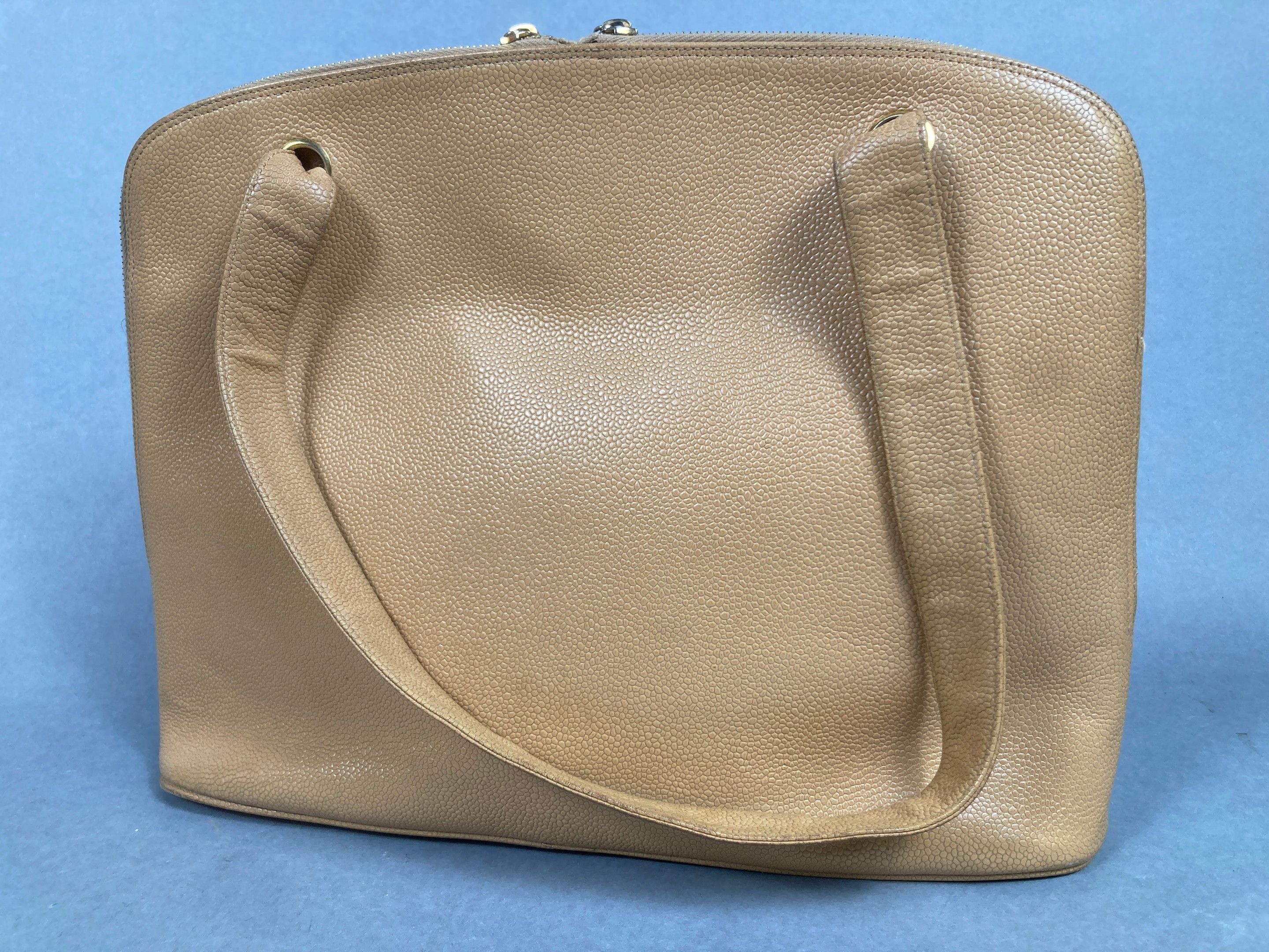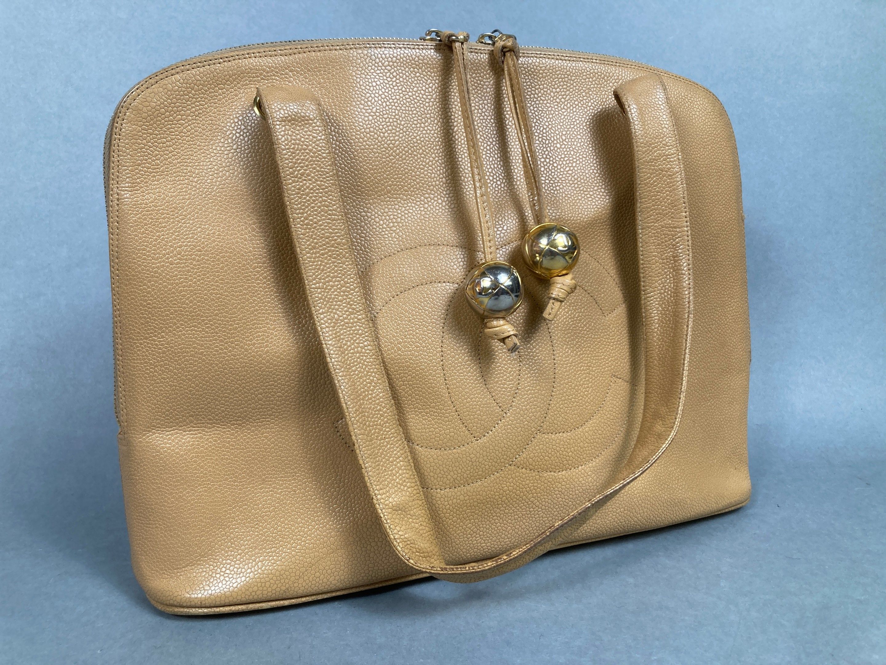 CHANEL, Paris. Handbag, camel grained leather model, carried on the shoulders (double handle). Double zip opening embellished with gold-tone metal balls with logo; and two inside zipped pockets. Gold-tone metal trim. Signed. Width: 35 cm. With dust-bag.