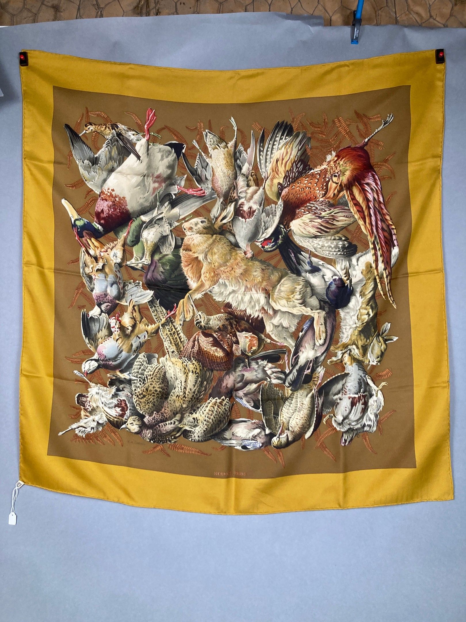HERMES, Paris. "Game. Square 90 in printed silk twill (brown background), after a design by Henri de Linarès. Signed, with label. With its box. Some threads very slightly pulled.