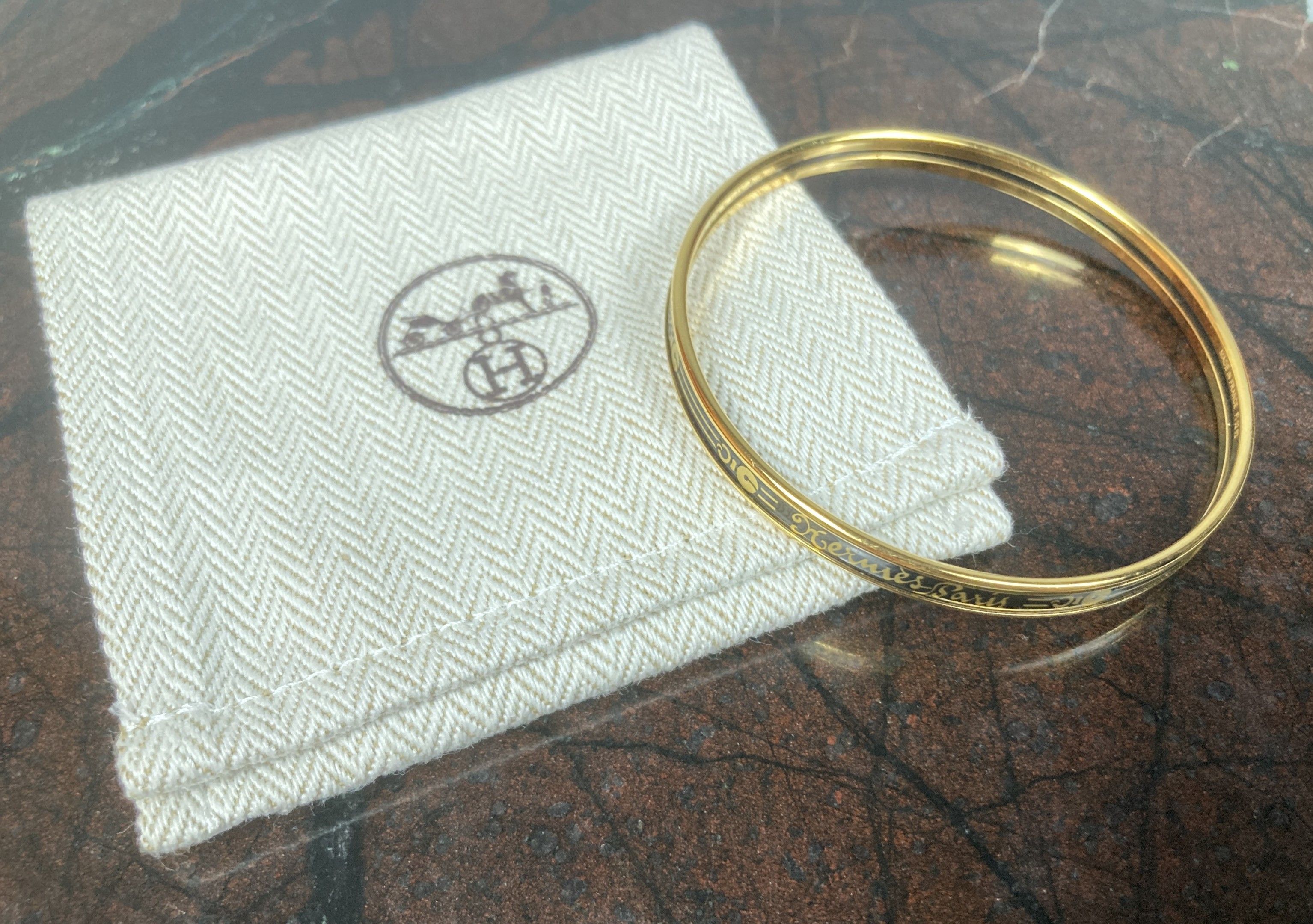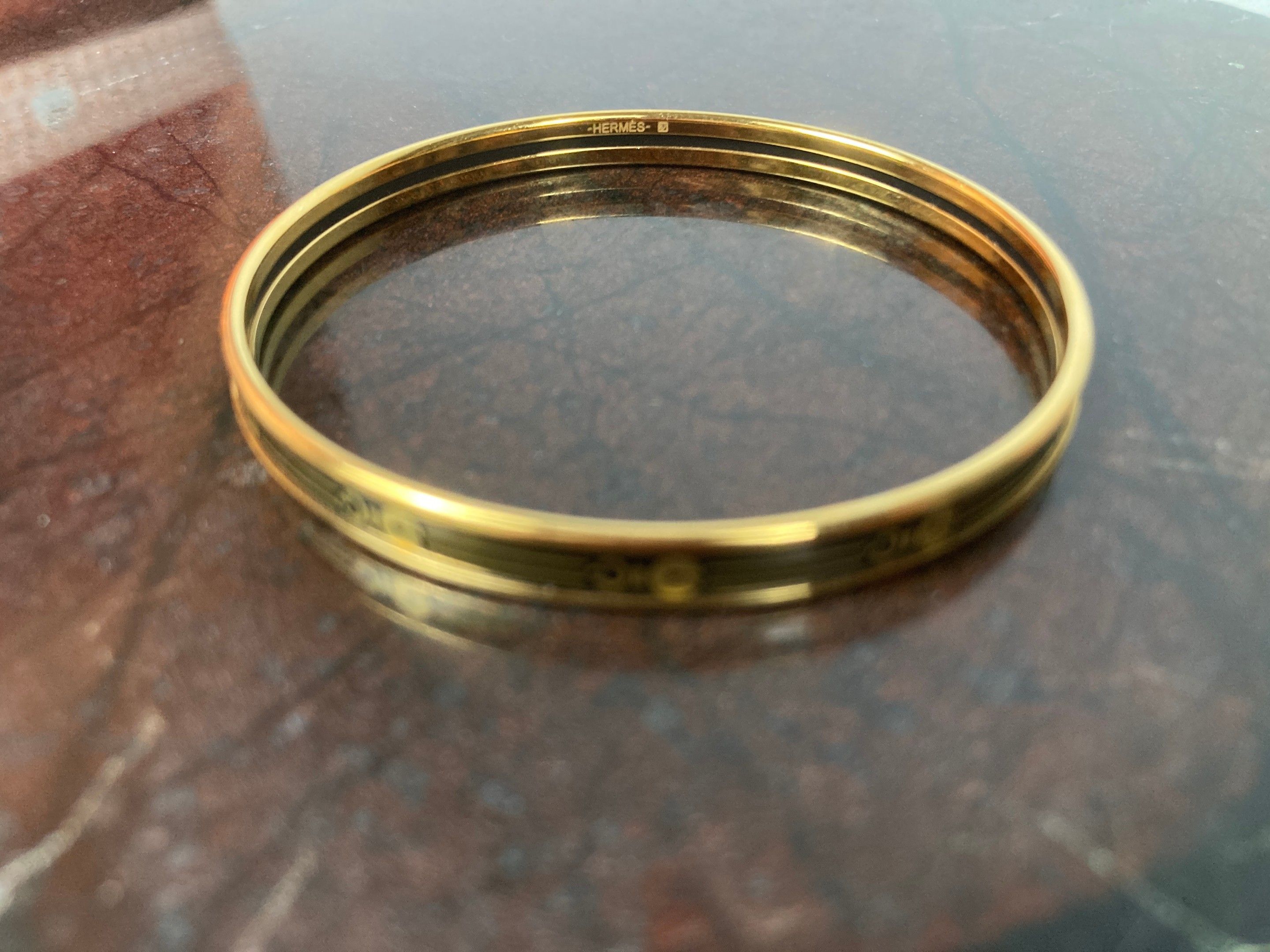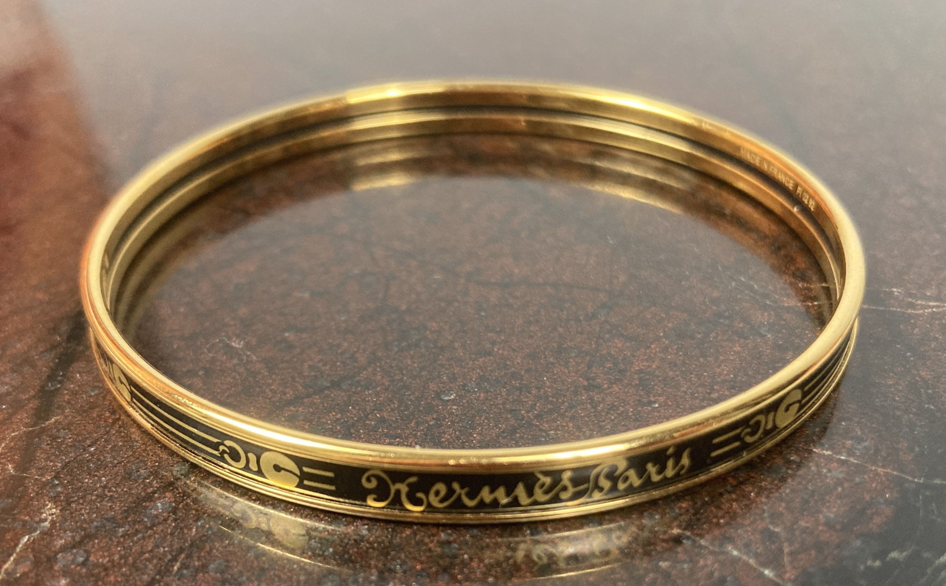 HERMES, Paris. Bracelet in gold-plated metal with enamelled gold-printed decoration on a black background. Signed. Inside diameter: 6.2 cm; width: 6 mm. Good condition. With pouch.