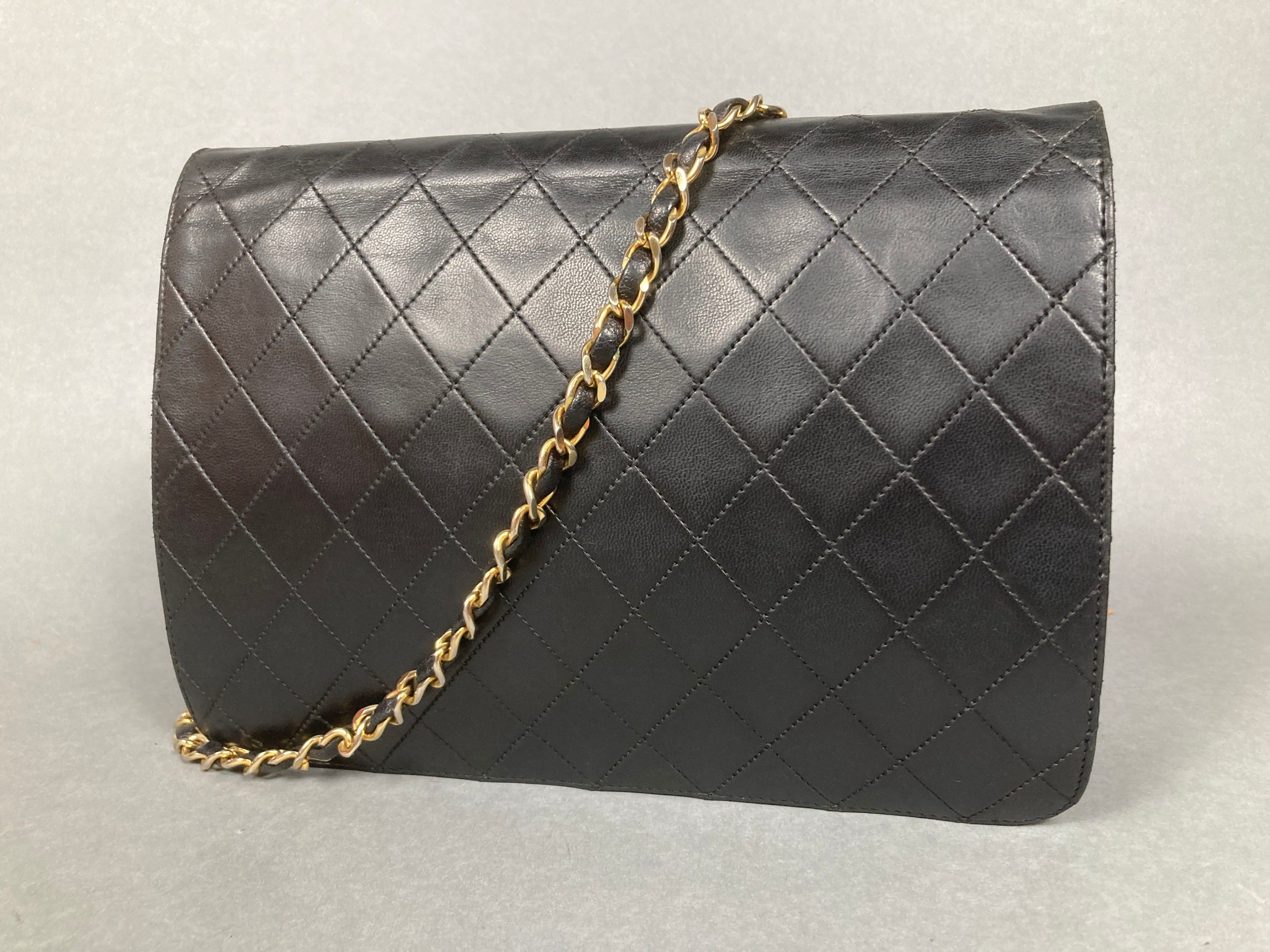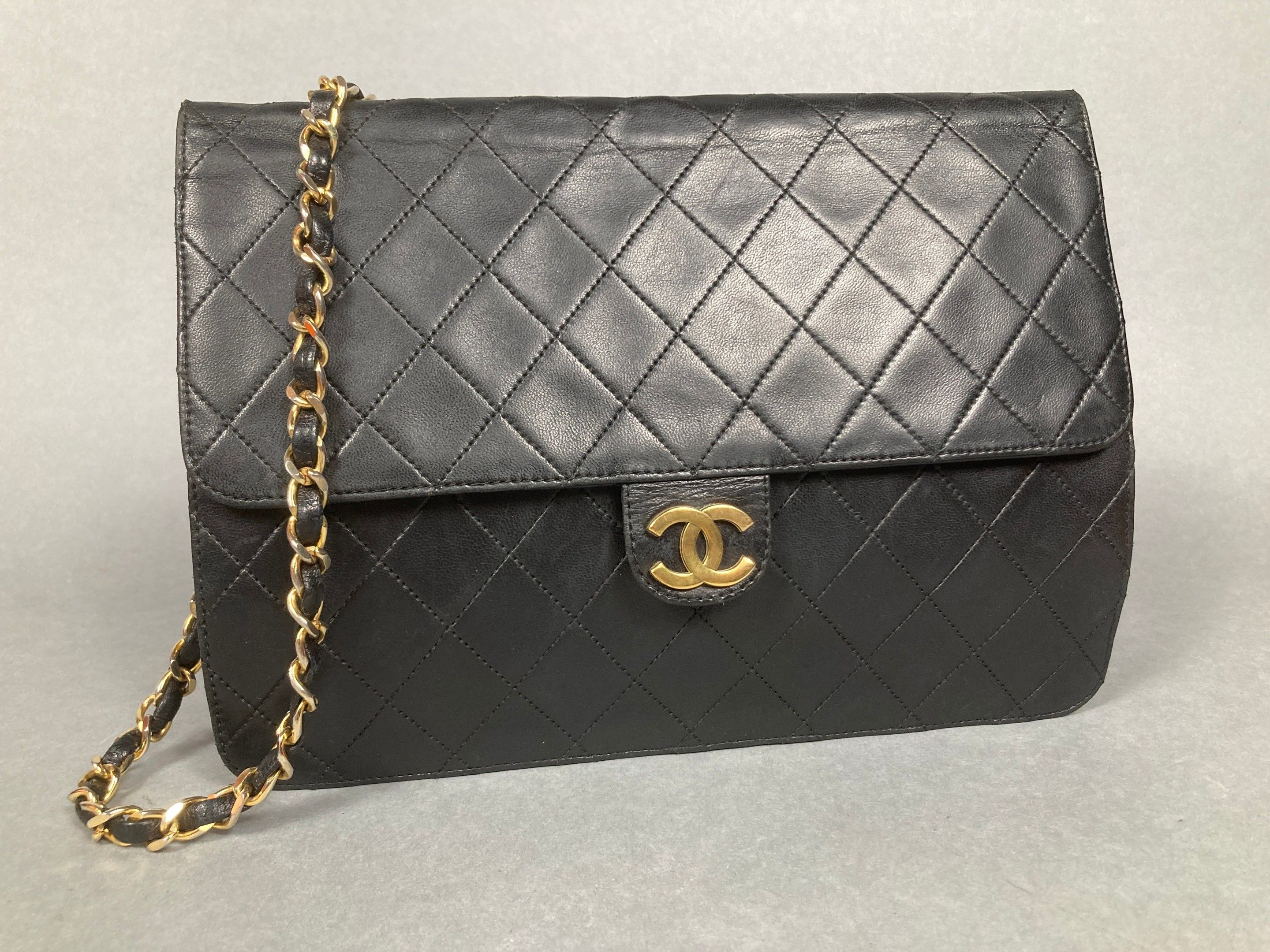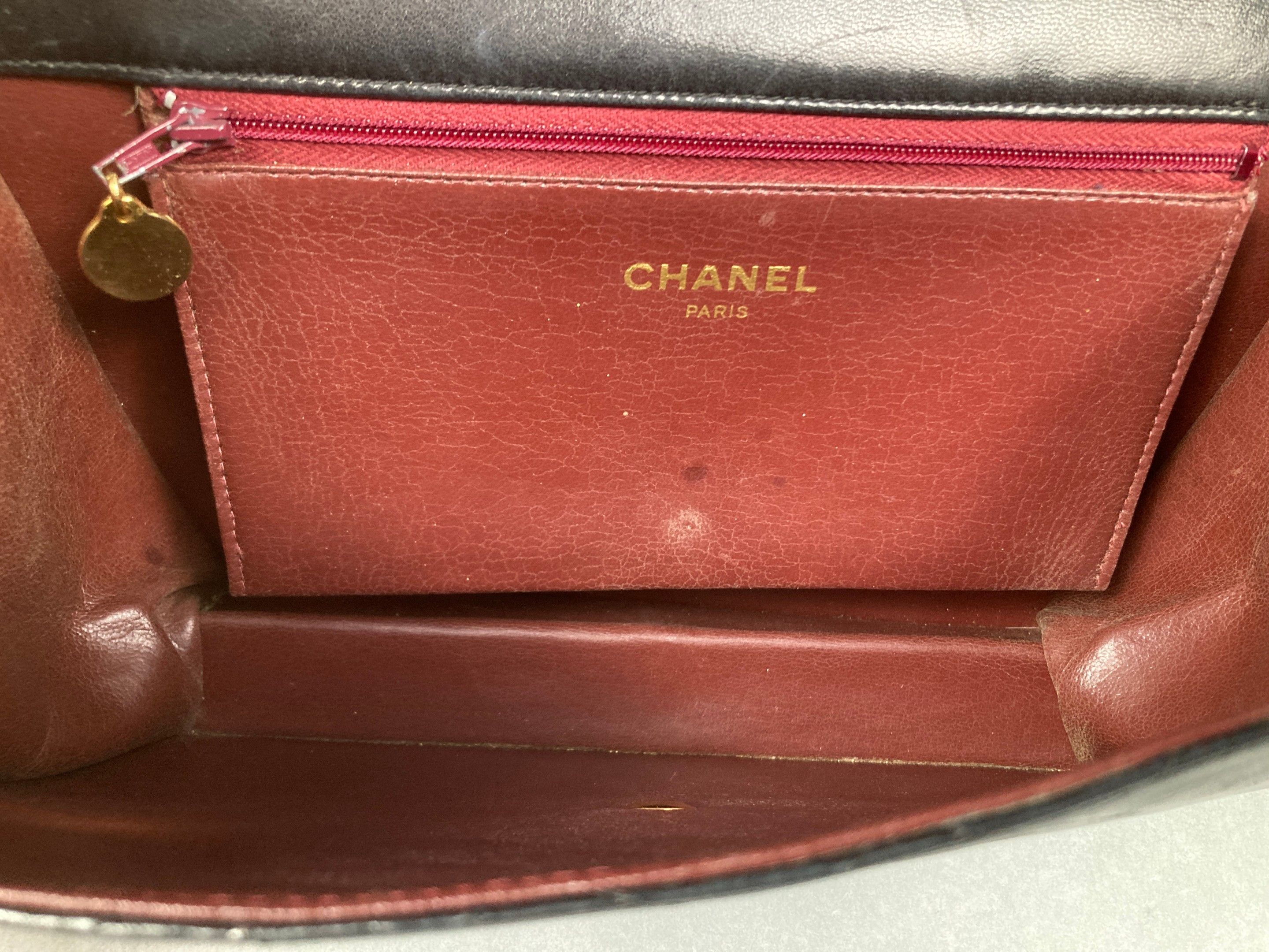 CHANEL, Paris. Vintage "Timeless Classique" shoulder bag in quilted black leather; interlaced leather and gold-tone metal shoulder strap; interlaced double-C gold-tone metal clasp; monogrammed flap reverse; burgundy leather interior with zipped pocket. Signed. Width: 25 cm. Traces of use.