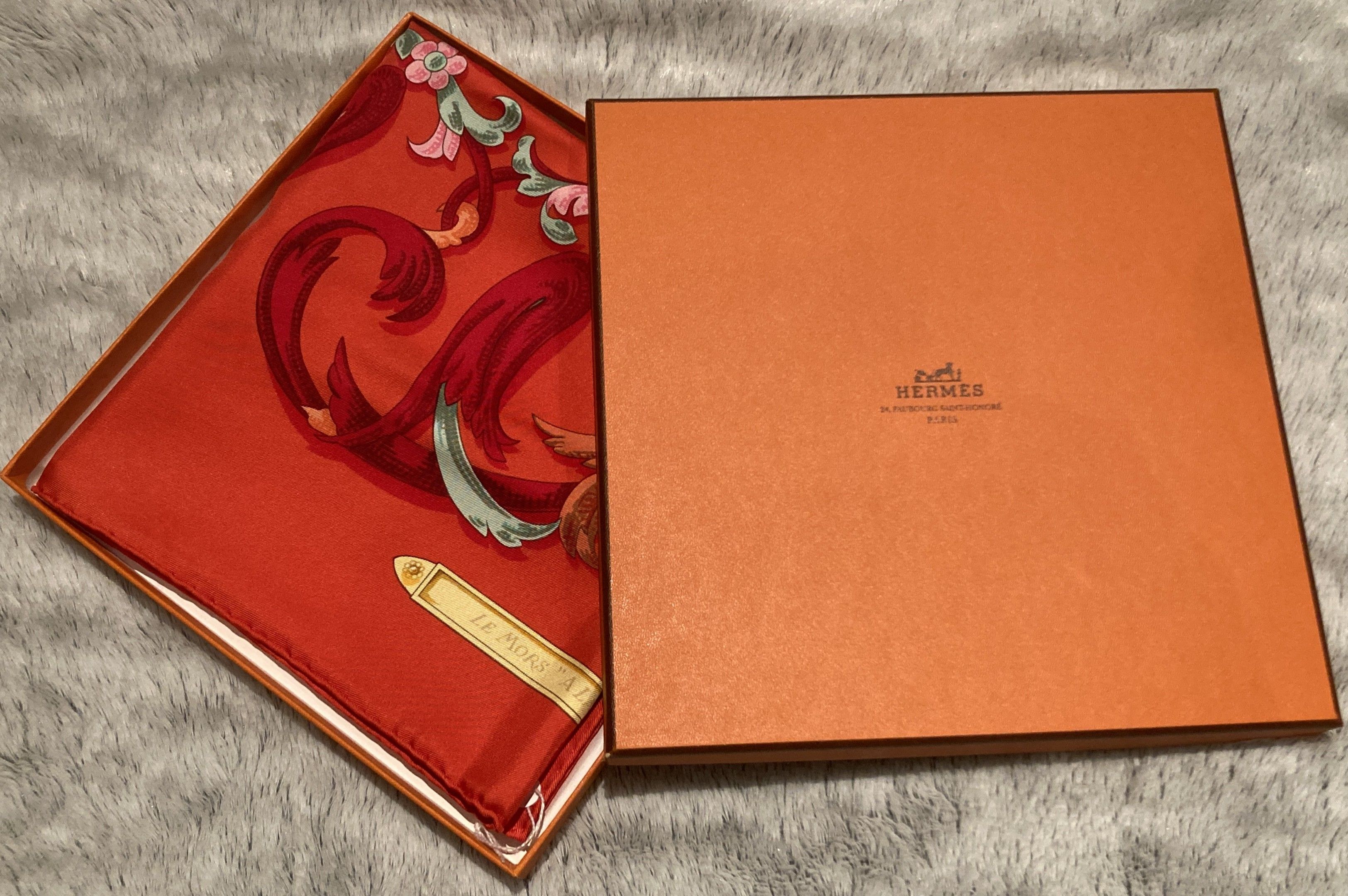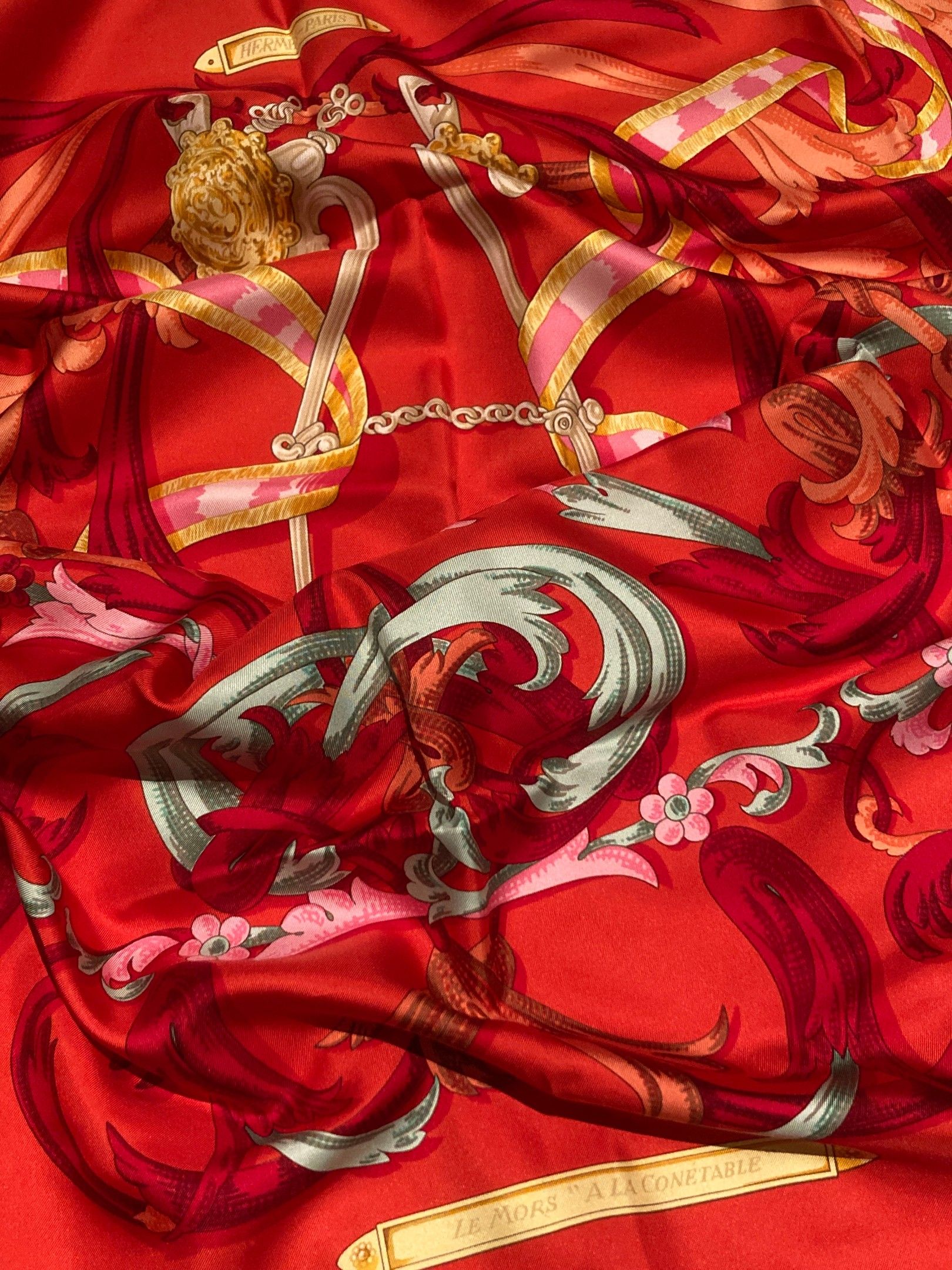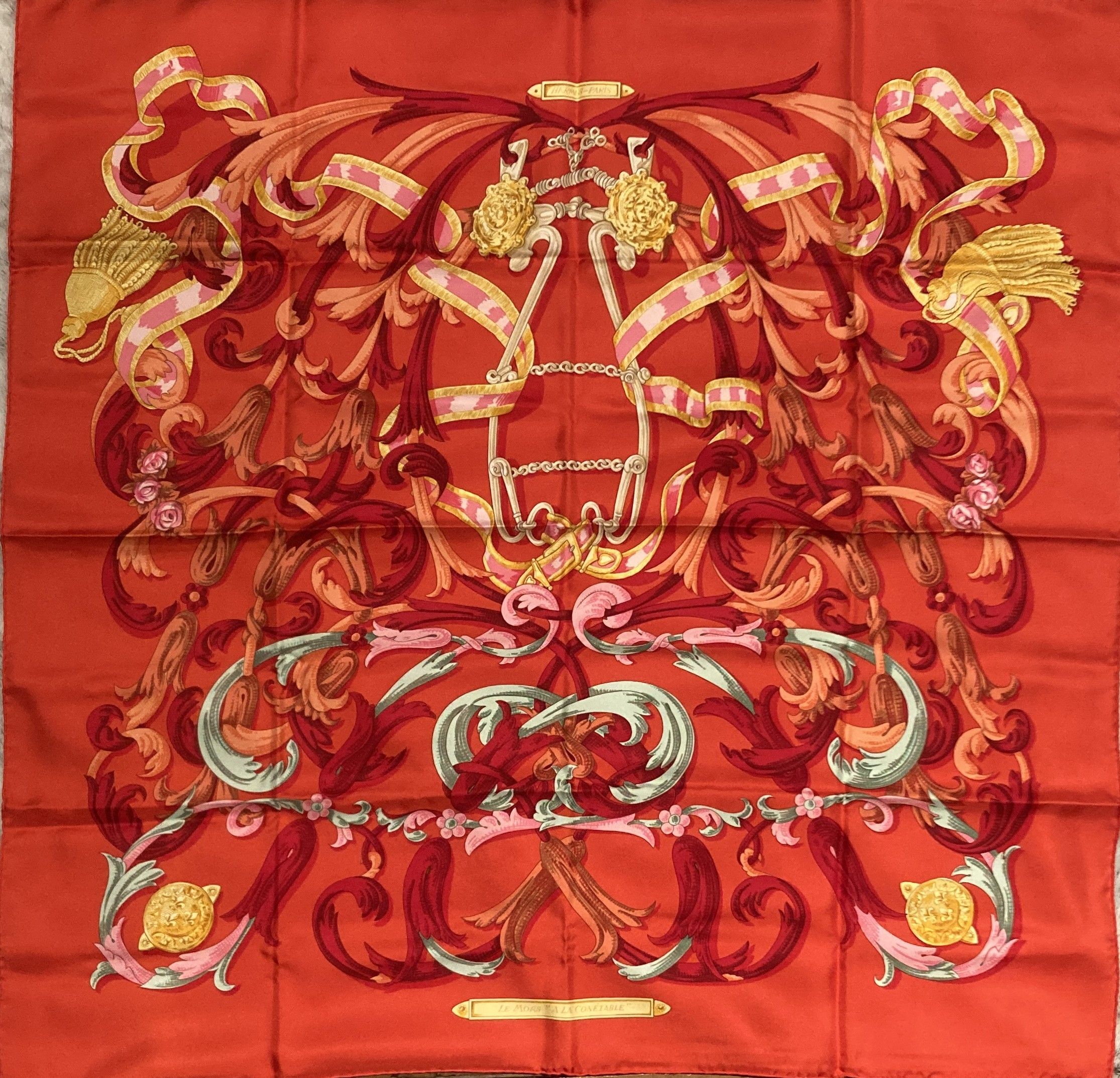 HERMES, Paris. Le Mors "à la Conétable". Square 90 in printed silk twill (coral background), after a model by Henri d'Origny. Signed, with black label. Very good condition. In a Maison box.