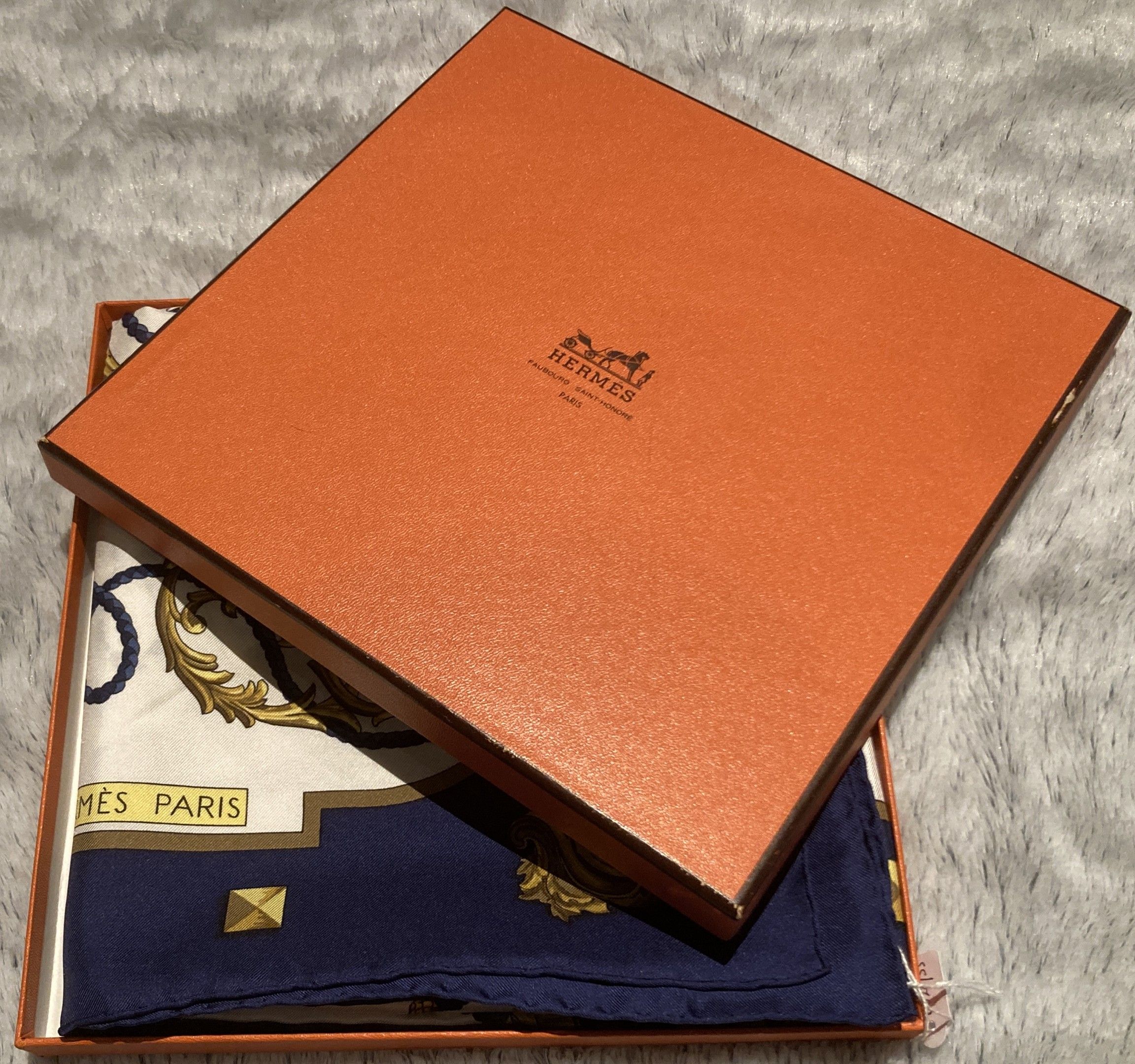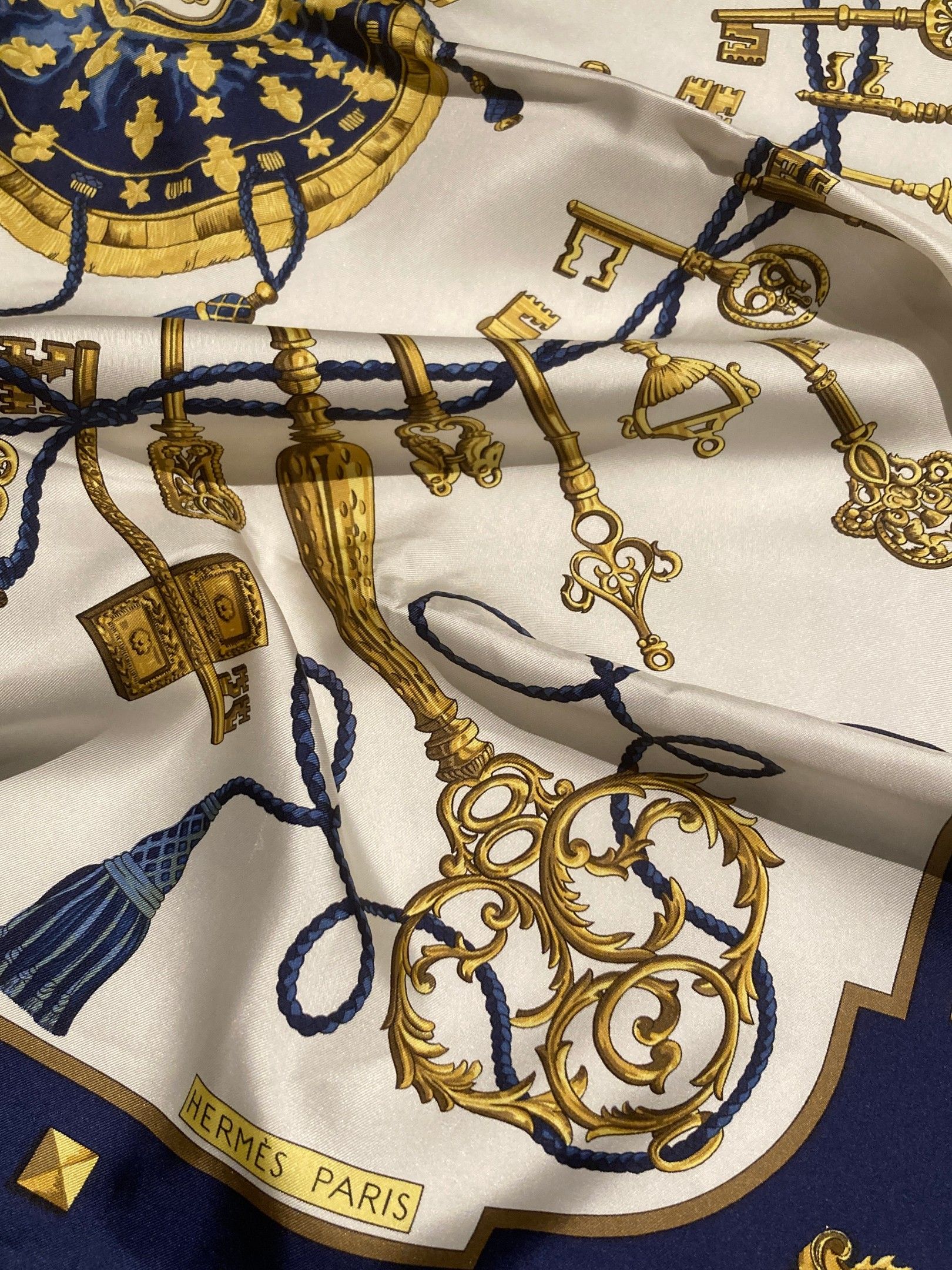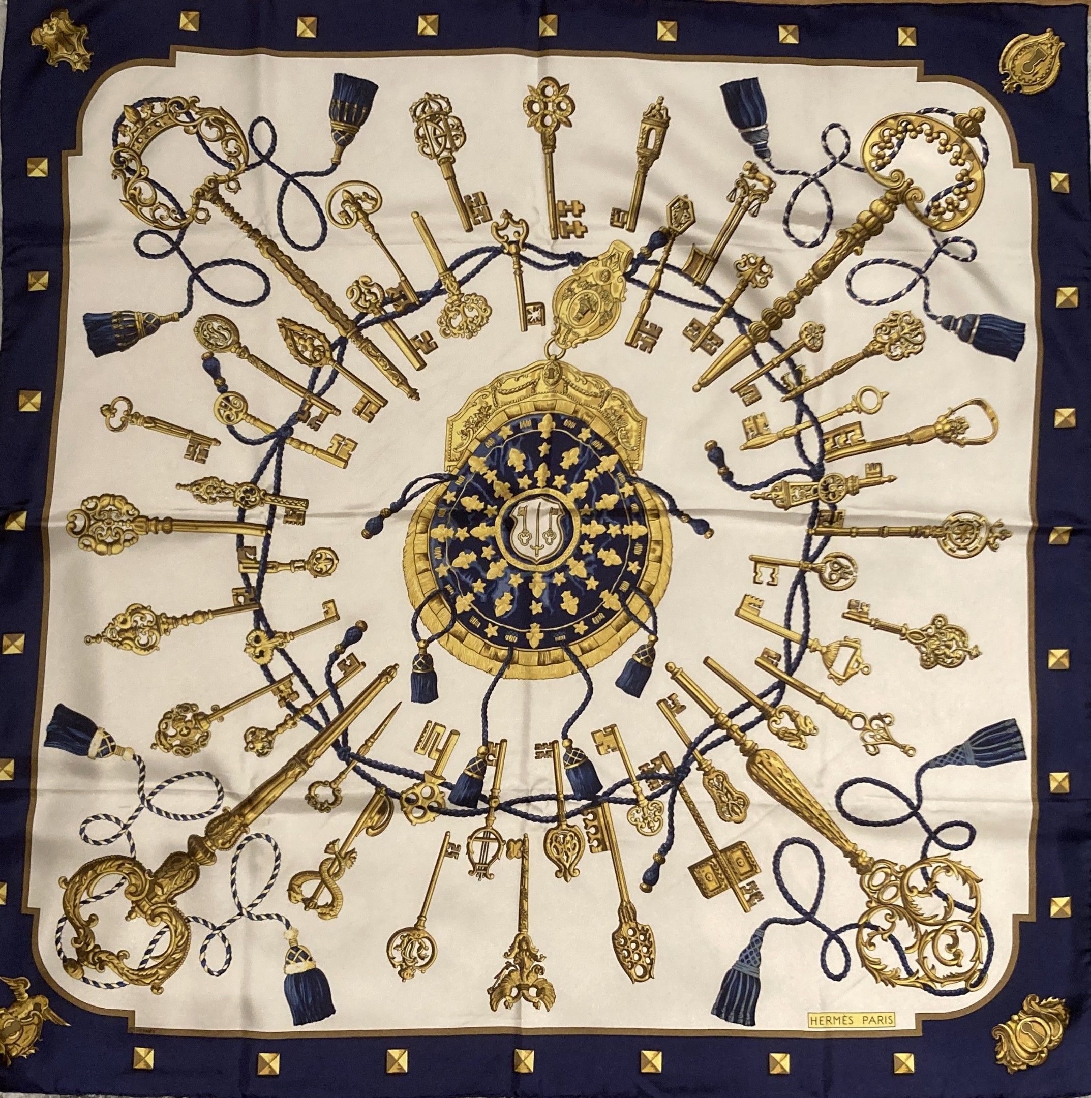 HERMES, Paris. "Les Clés". Square 90 in printed silk twill (cream background; navy blue border), based on a design by Cathy Latham. Signed, with label. Very good condition. In a Maison box.