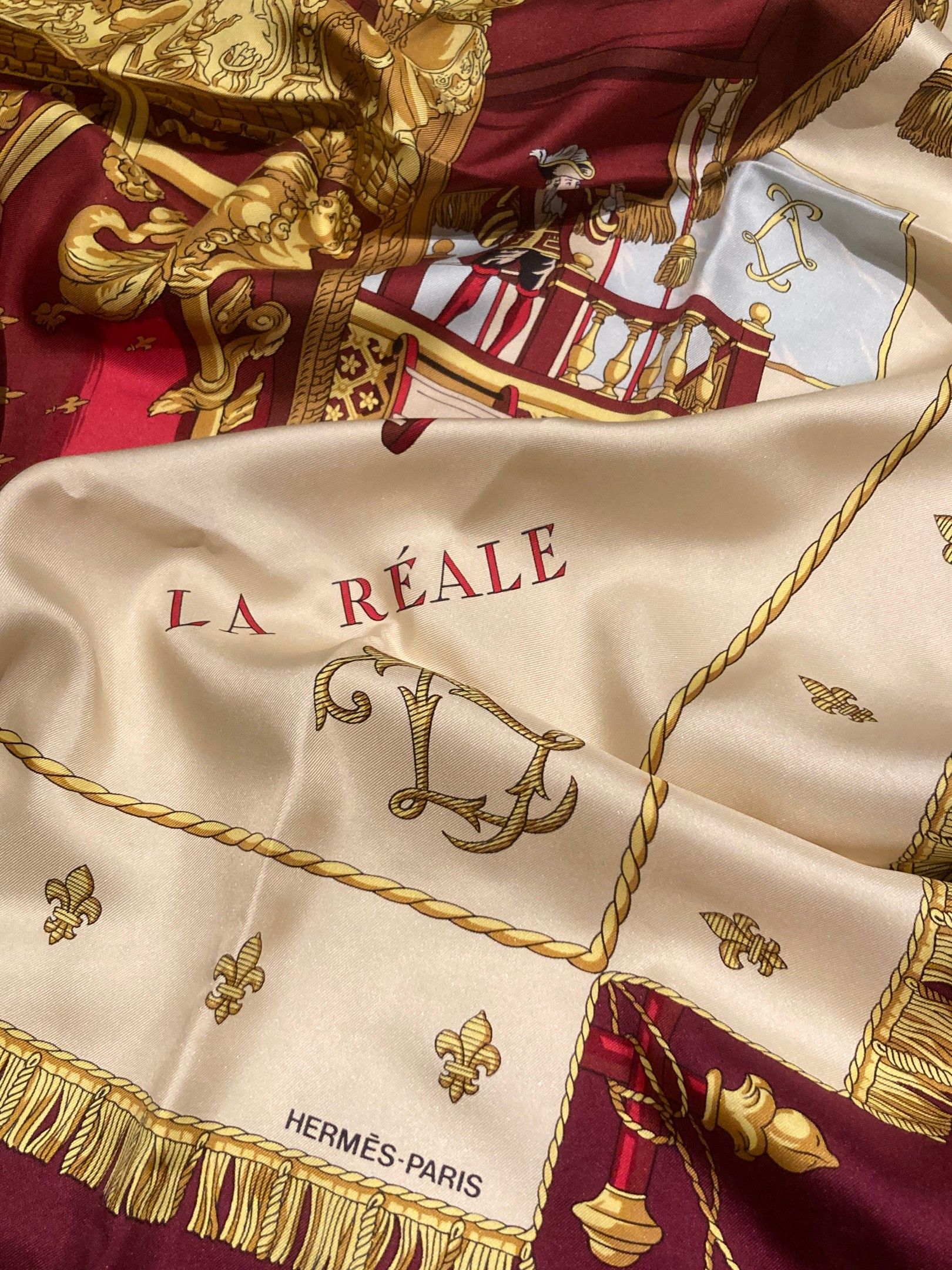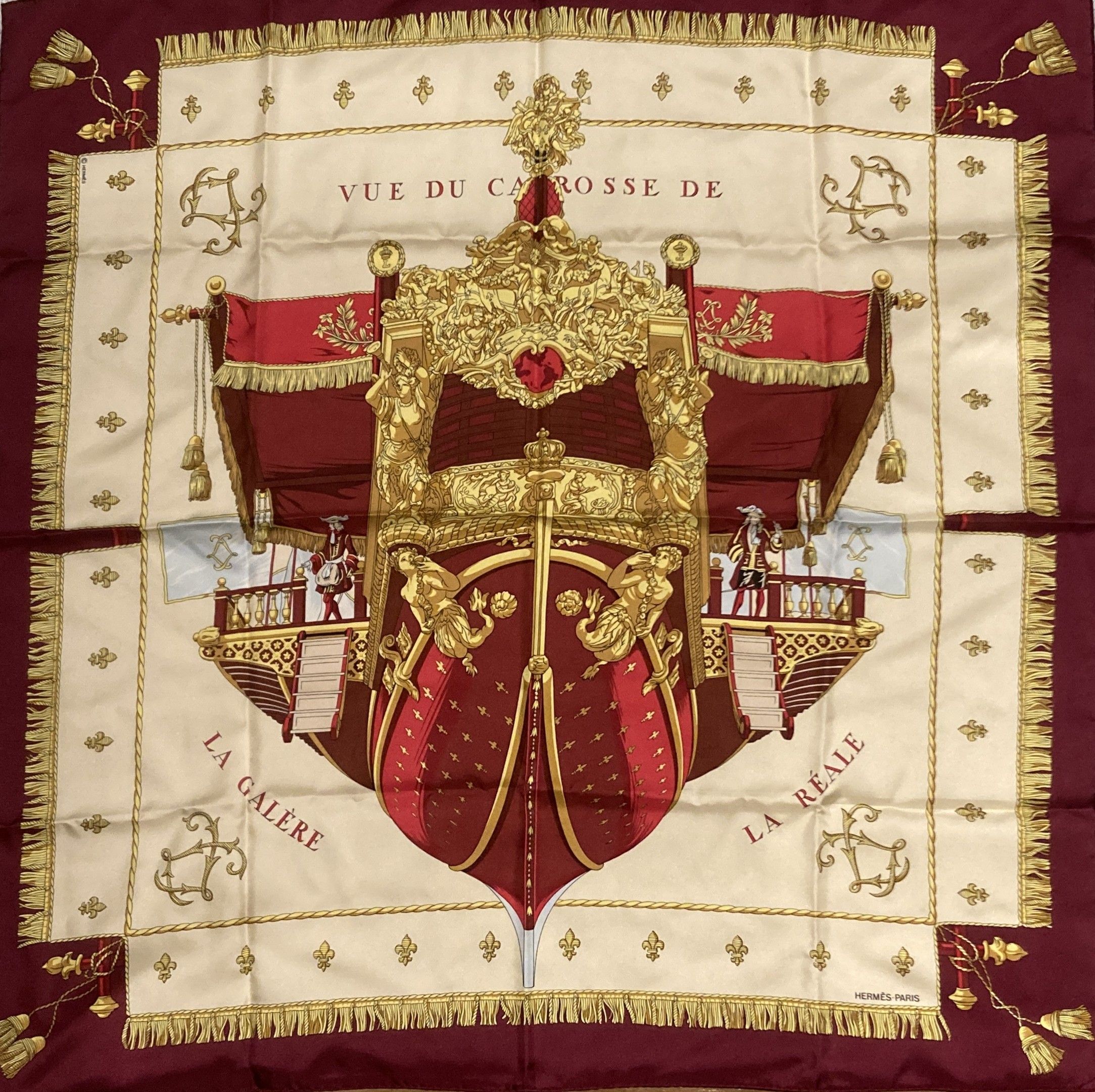 HERMES, Paris. "View of the coach of the galley La Réale. Square 90 in printed silk twill (aubergine border), based on a design by Hugo Grygkar. Signed, with label. Very good condition.