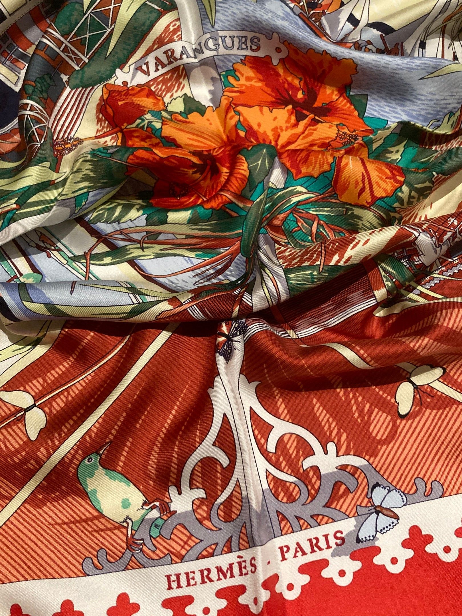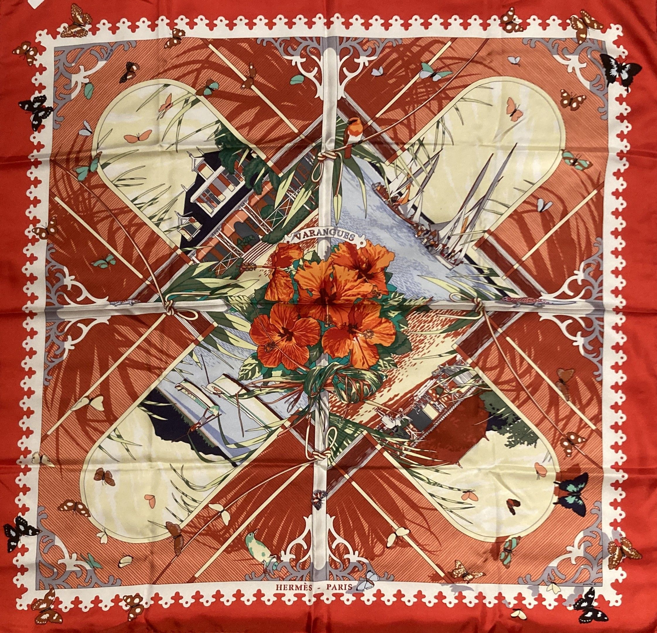 HERMES, Paris. "Varangues". Square 90 in printed silk twill (red border), based on a design by Dimitri Rybaltchenko. Signed, with label. Very good condition.