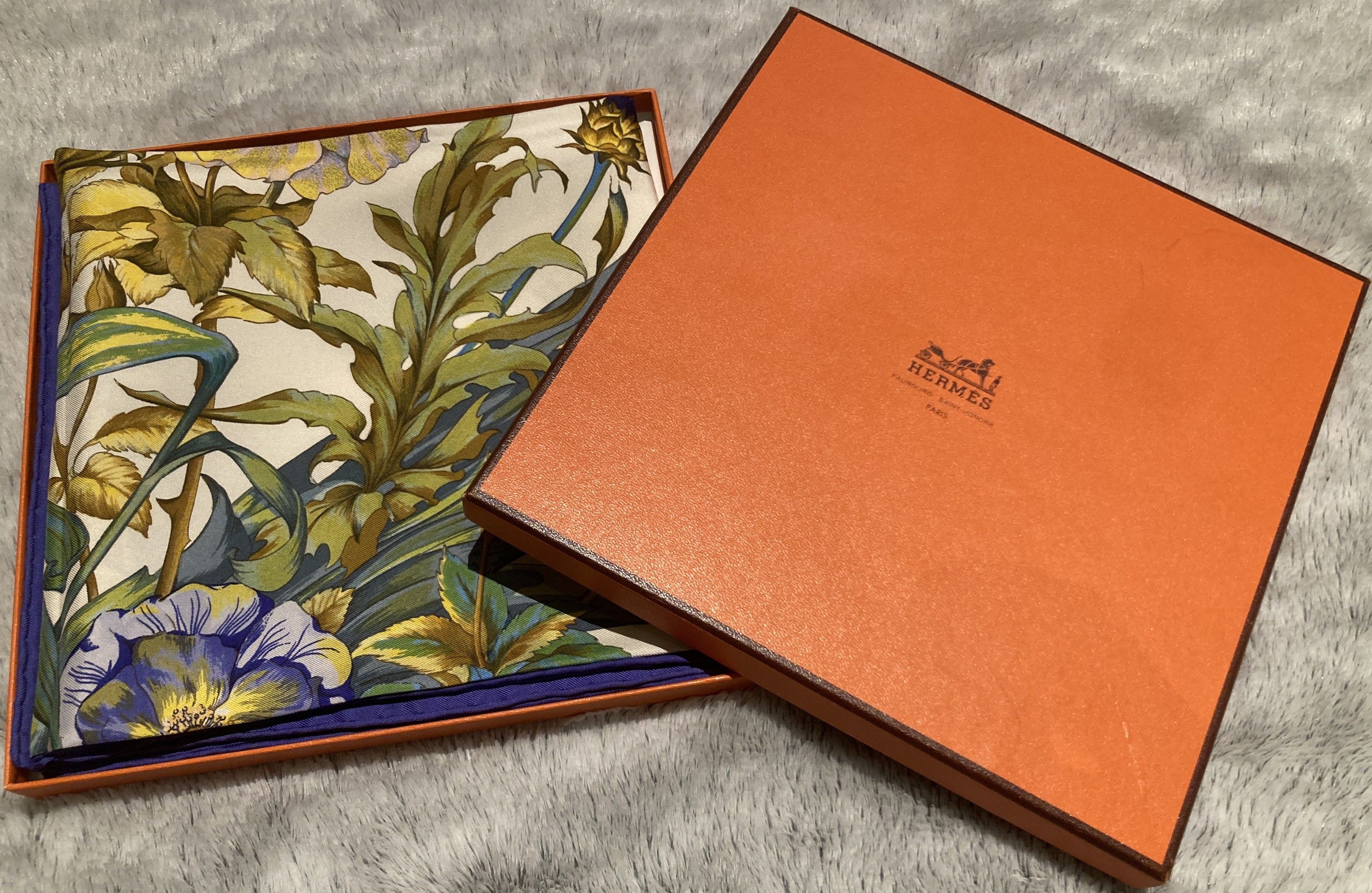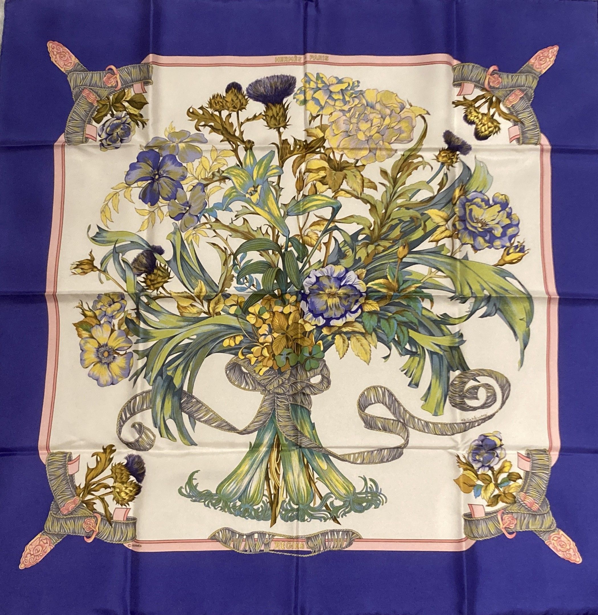 HERMES, Paris. "Regina". Square 90 in printed silk twill (purple border), based on a design by Leïla Menchari. Signed, with label. Very fine, near new condition. In a Maison box.