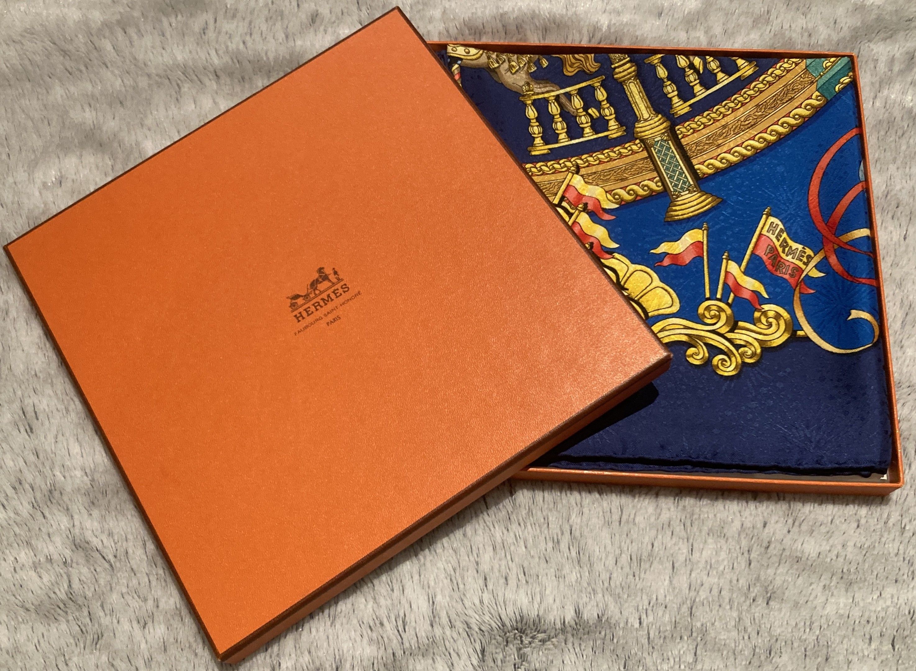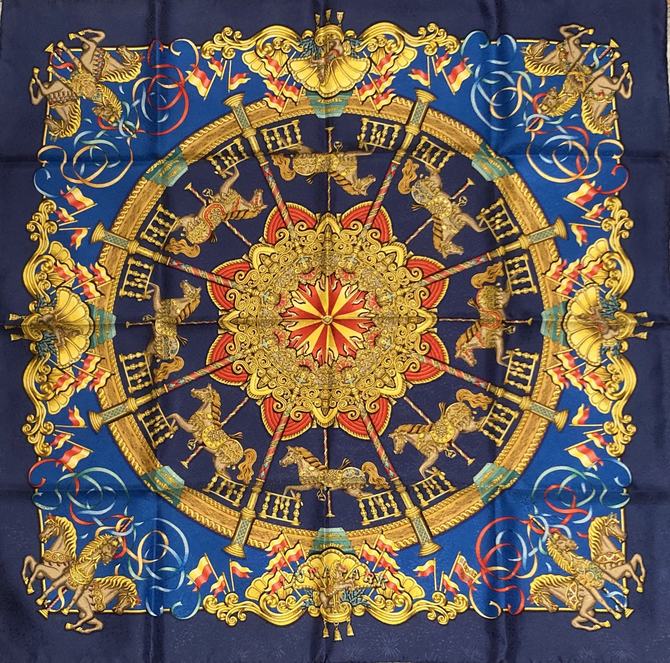 HERMES, Paris. "Luna Park. Square 90 in damask and printed silk twill (navy blue background), based on a design by Joachim Metz. Signed, with label. Very good condition. In a Maison box.