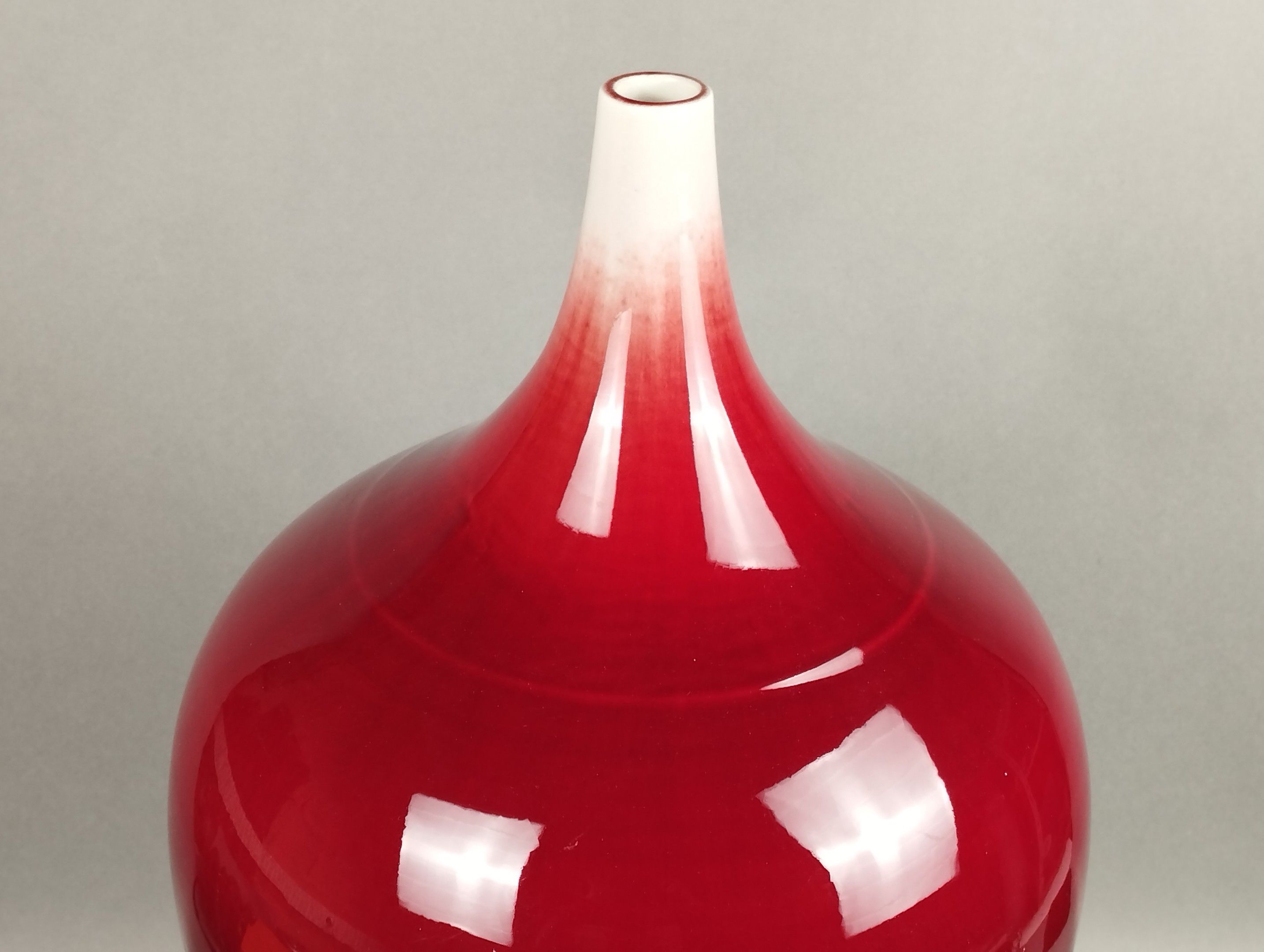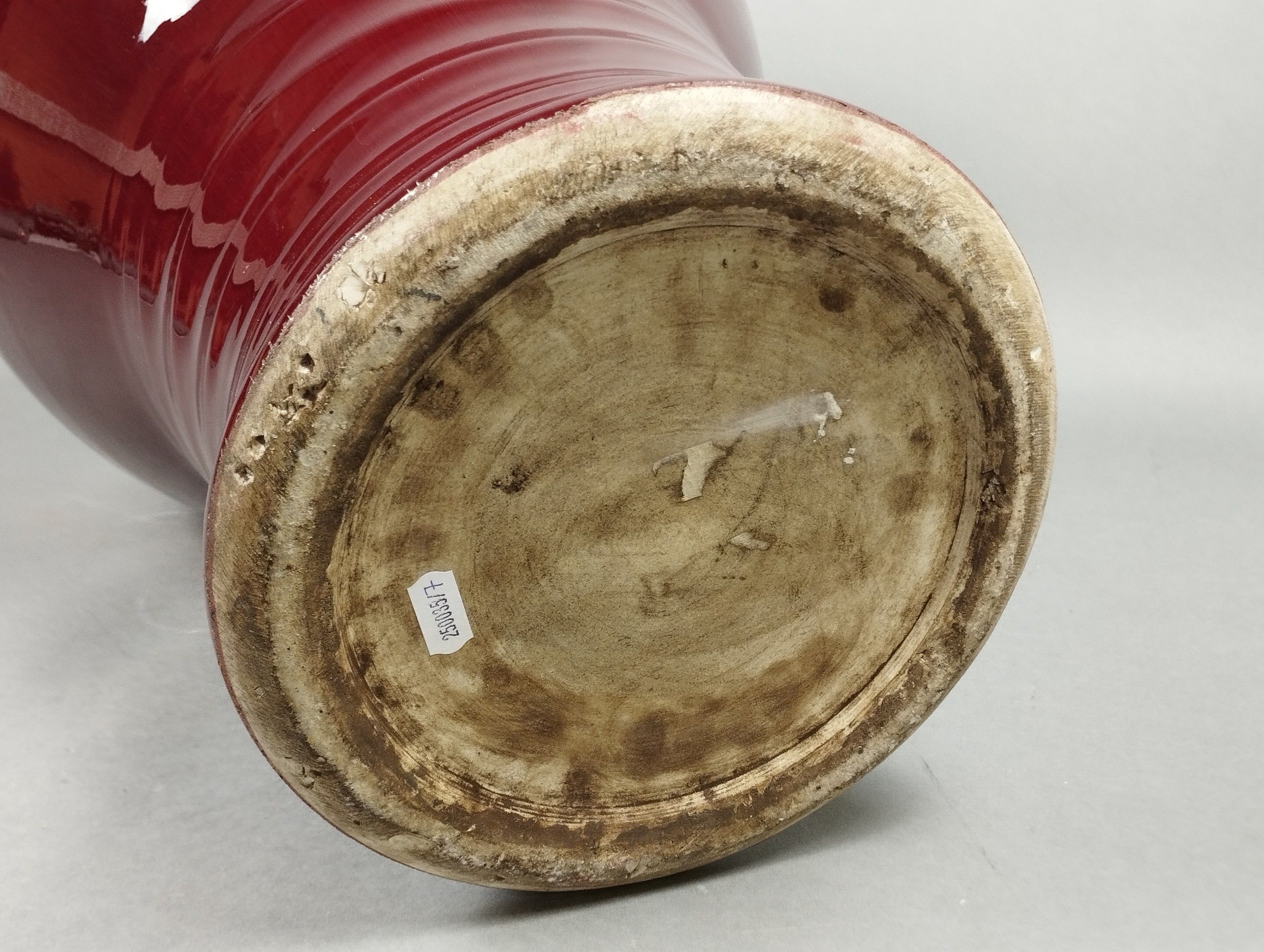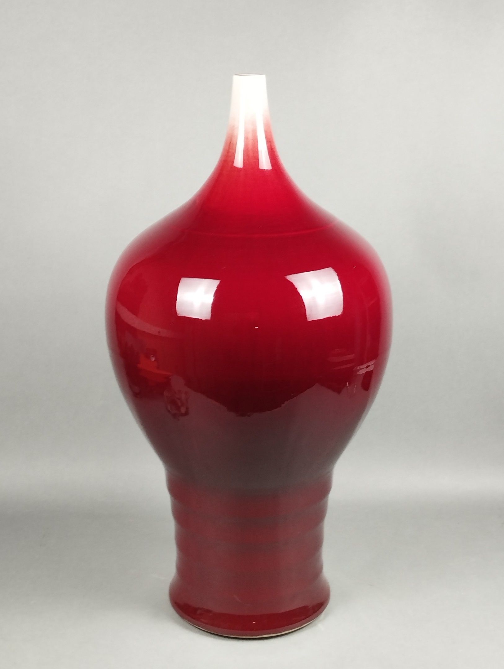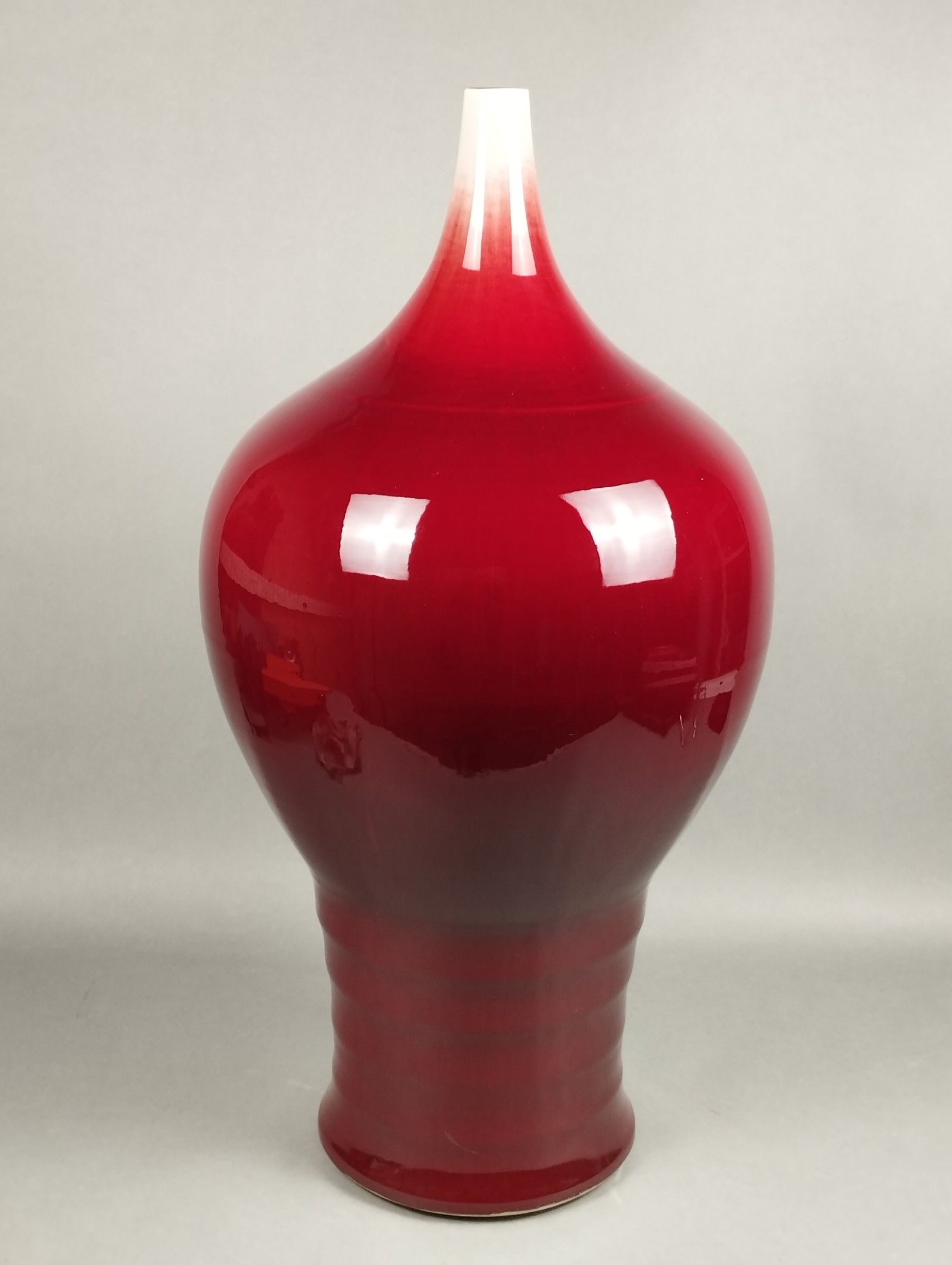 ROCHE BOBOIS, attributed to A large red and white glazed ceramic soliflore vase with a narrow neck, inspired by Chinese "sang-de-boeuf" pottery. Height = 77 cm.