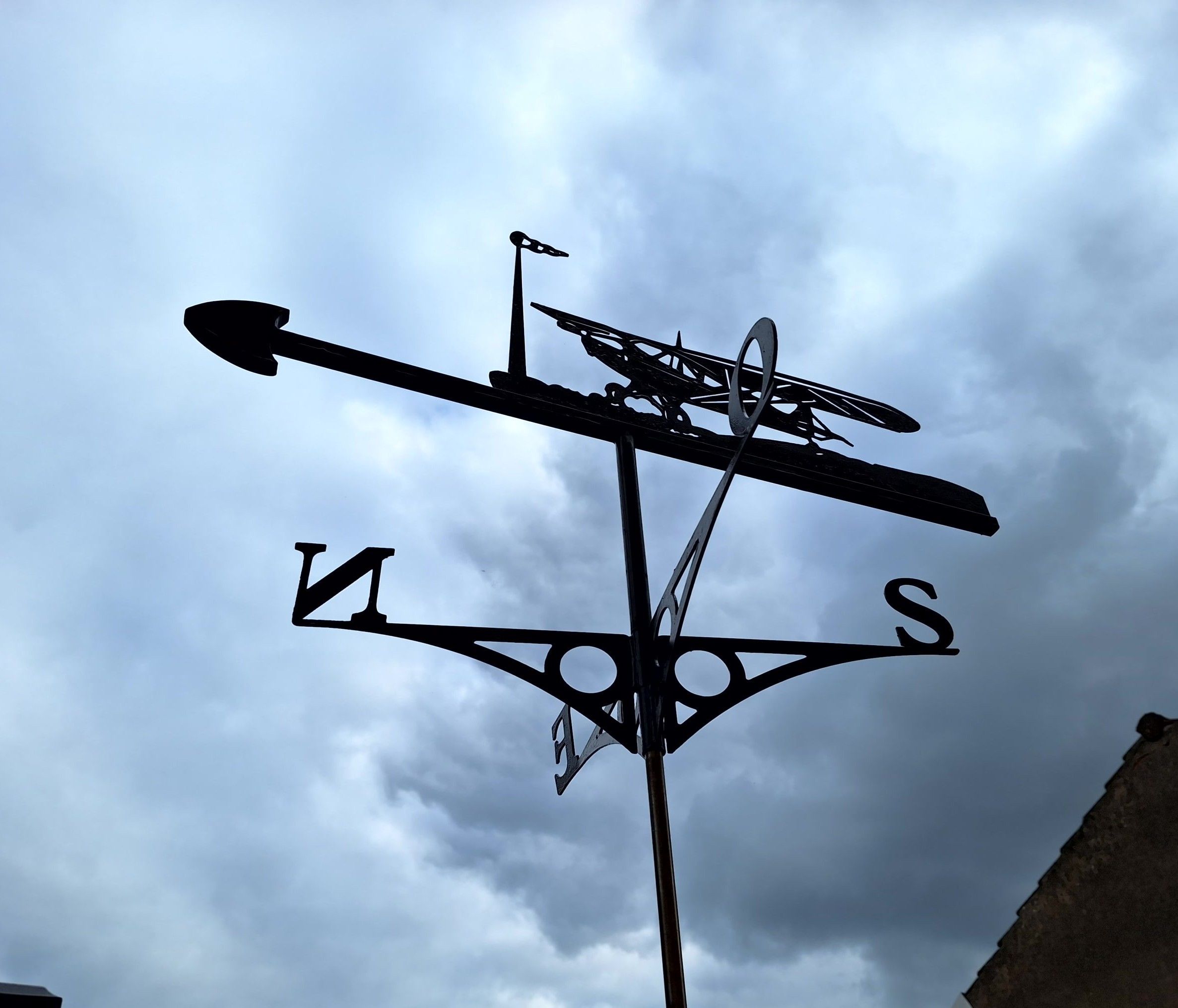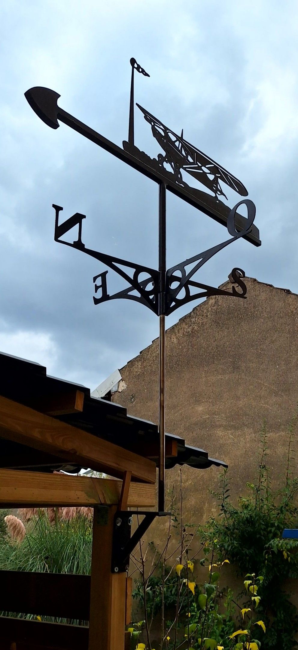 Modern weathervane, in black lacquered metal, decorated with an aeroplane. Width of main element: 100 cm. With fixing rod.