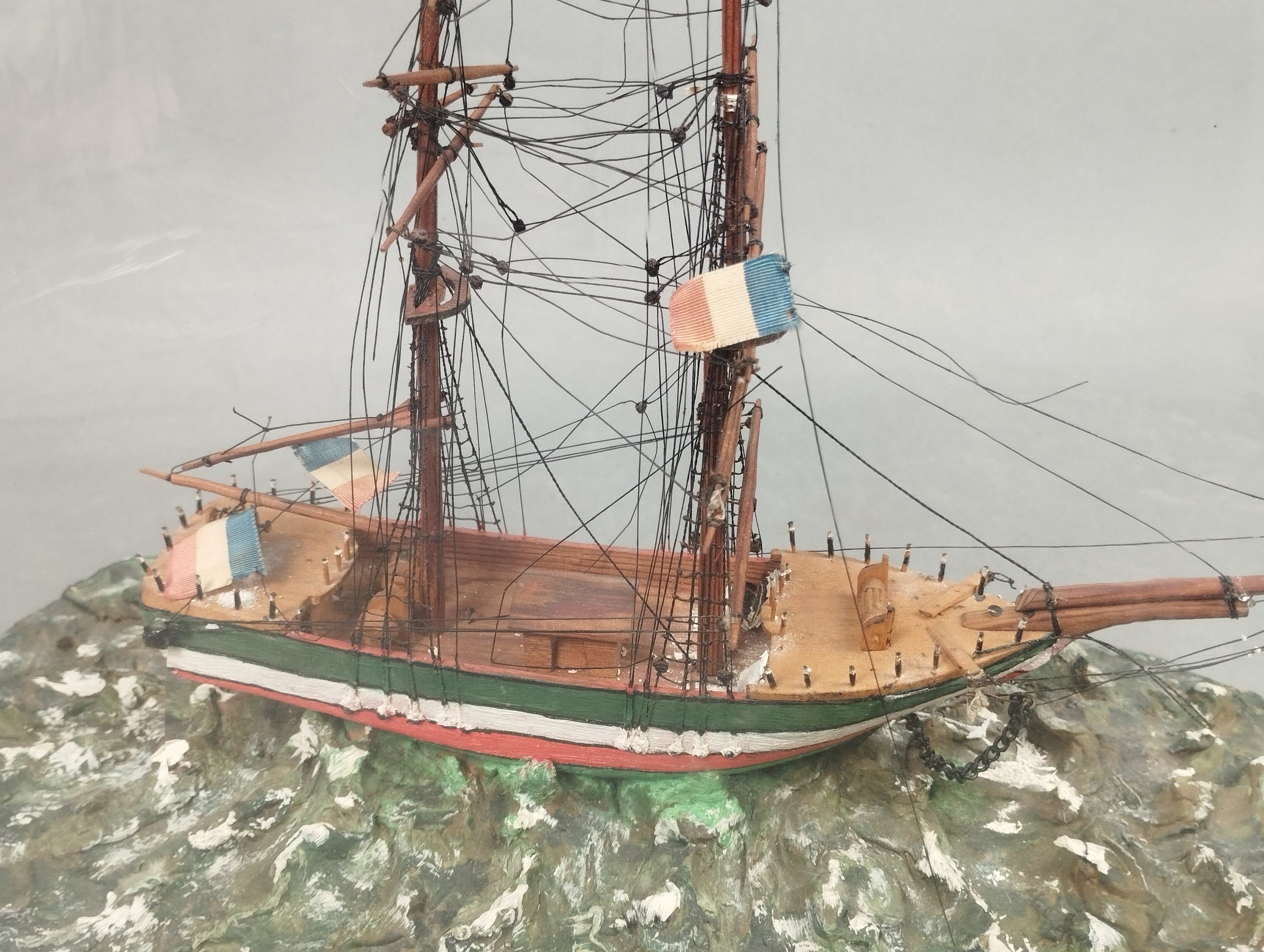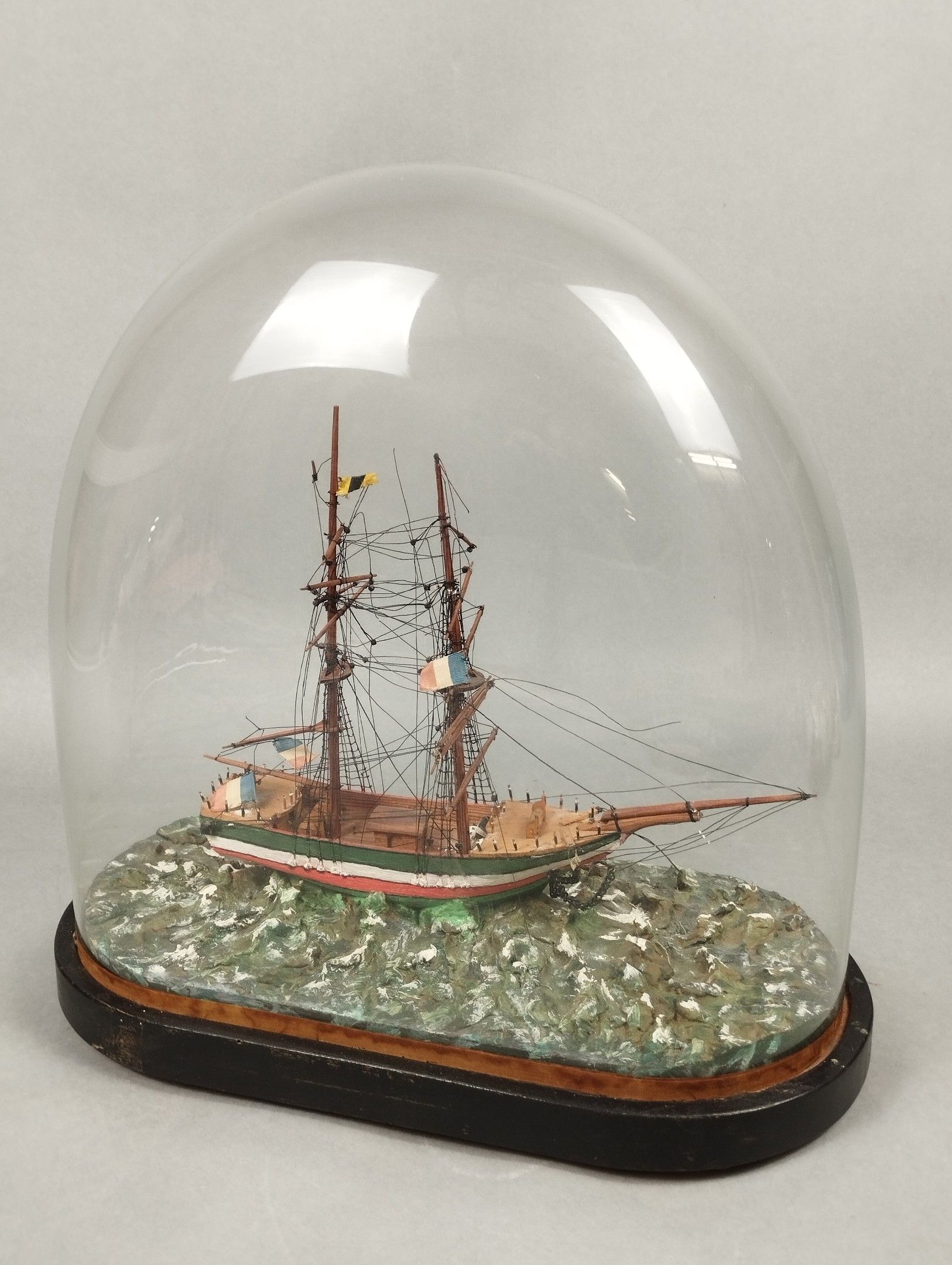 Antique model of a sailing ship in polychrome wood, under a globe. 19th century. Base length: 38.5cm. A part of the mast needs to be refixed at the back.