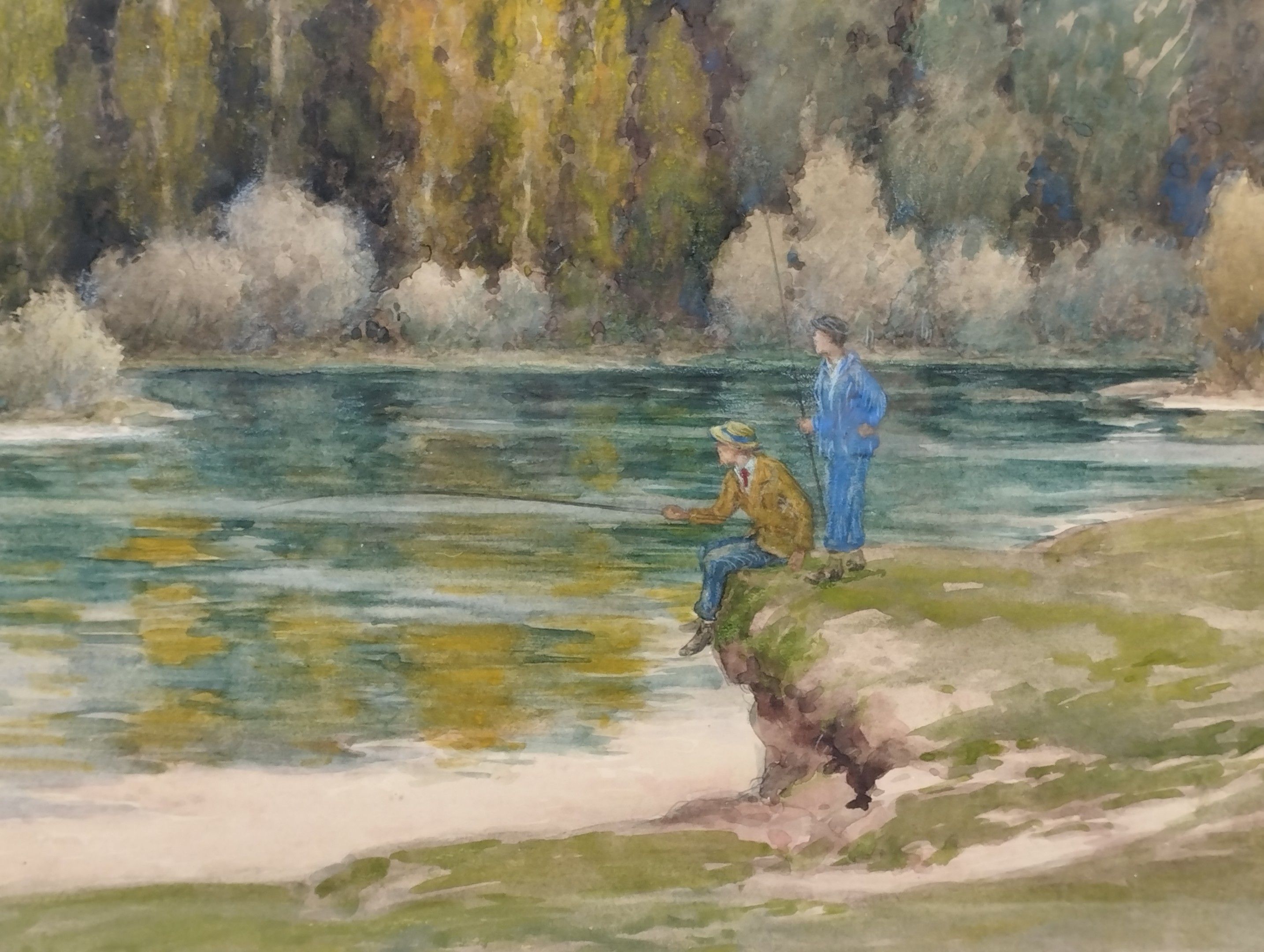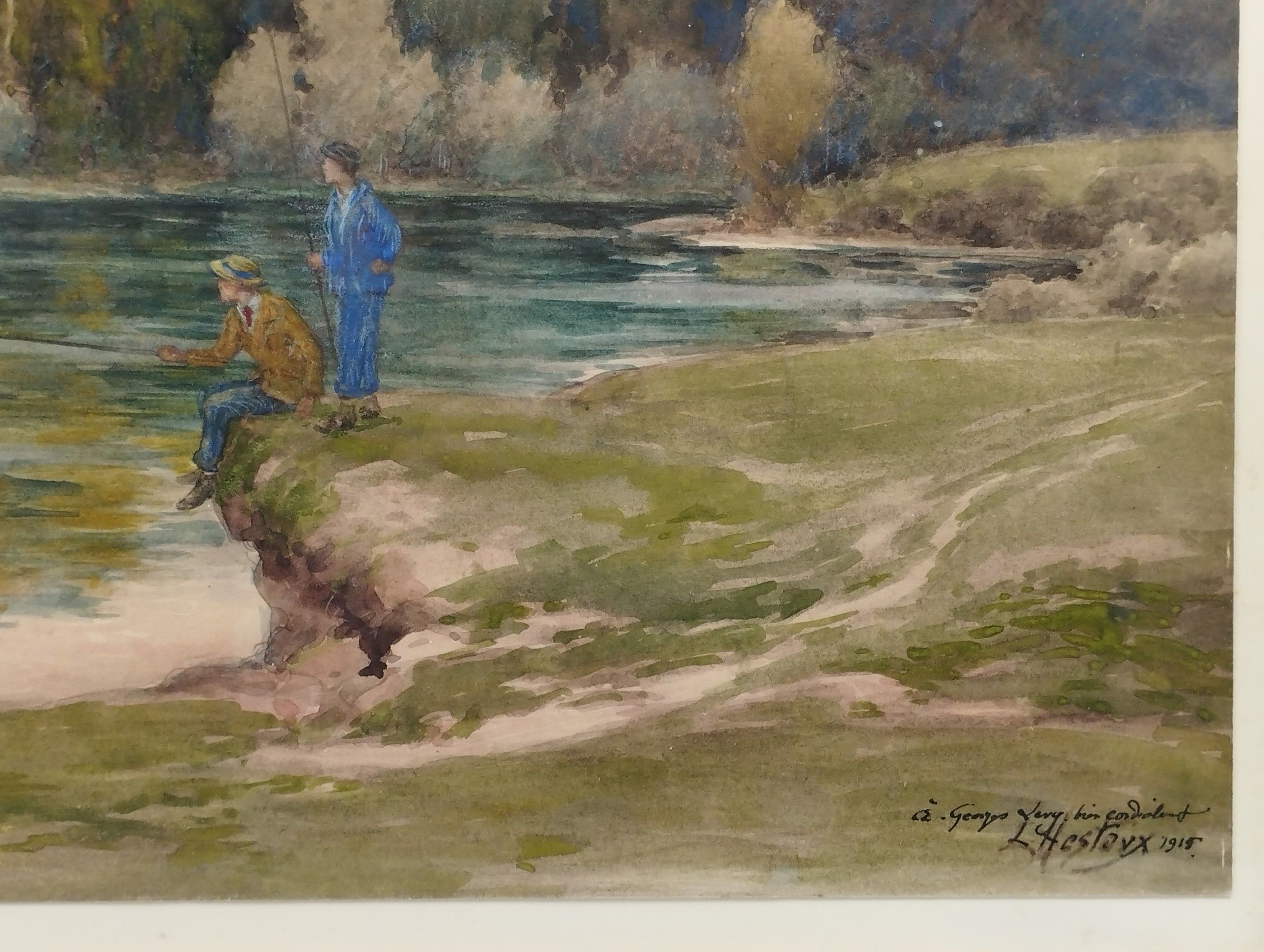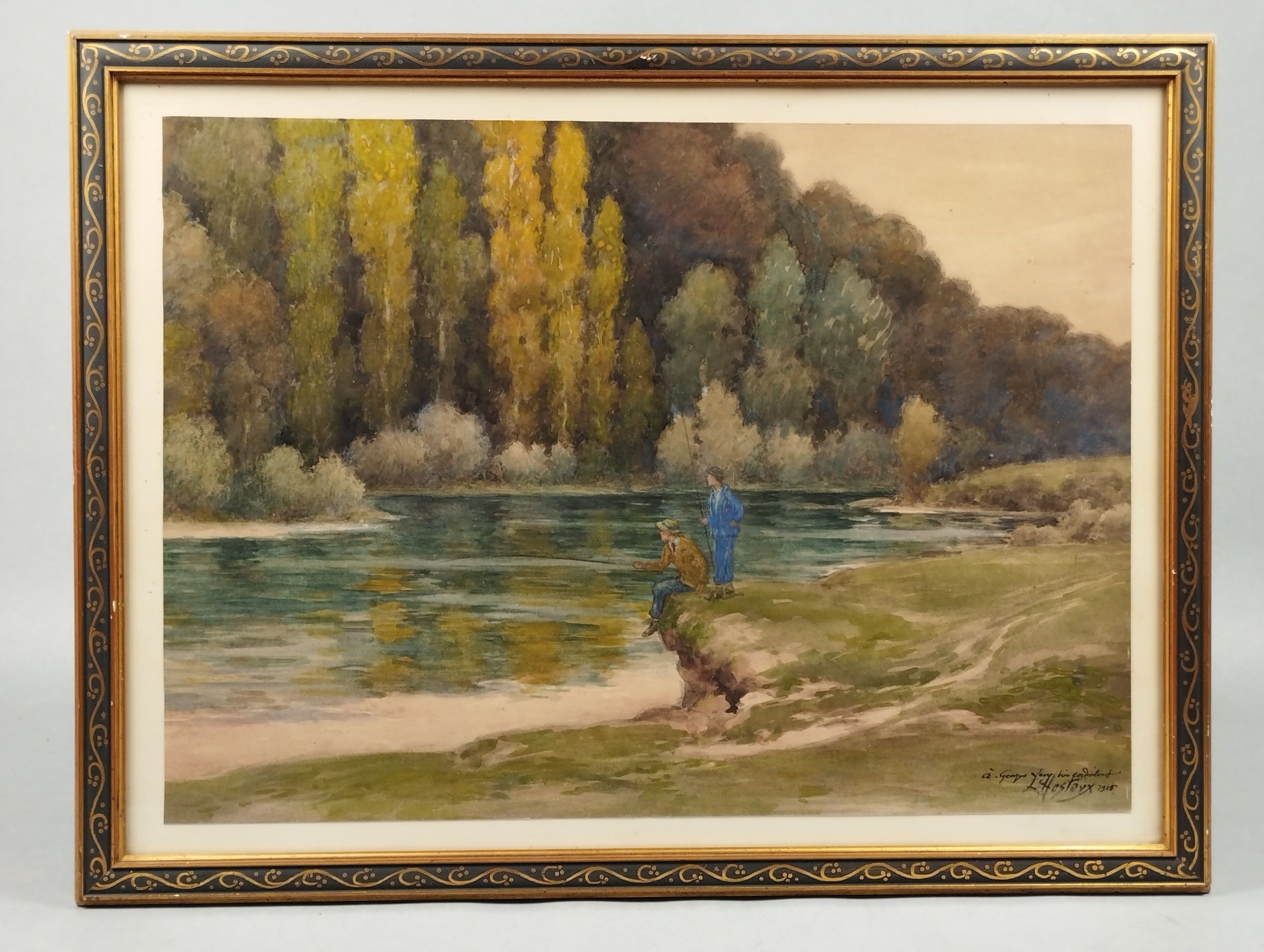 Louis HESTAUX (1858-1919). Fishermen by the river. Watercolour. Signed in ink and dedicated "to Georges Levy" lower right; dated "1915". Size of sheet: 35.3 x 49.5 cm.