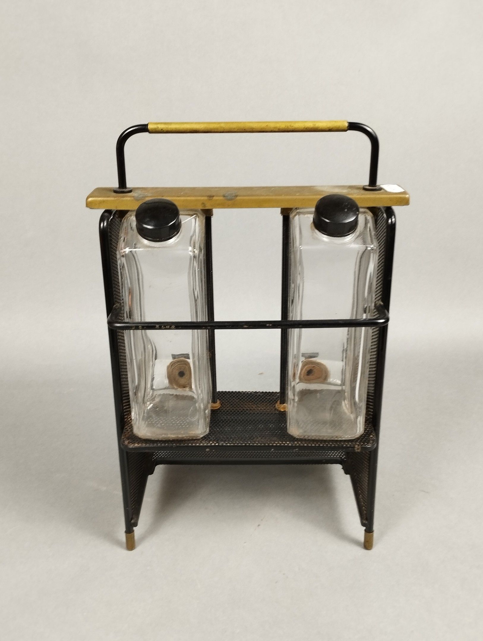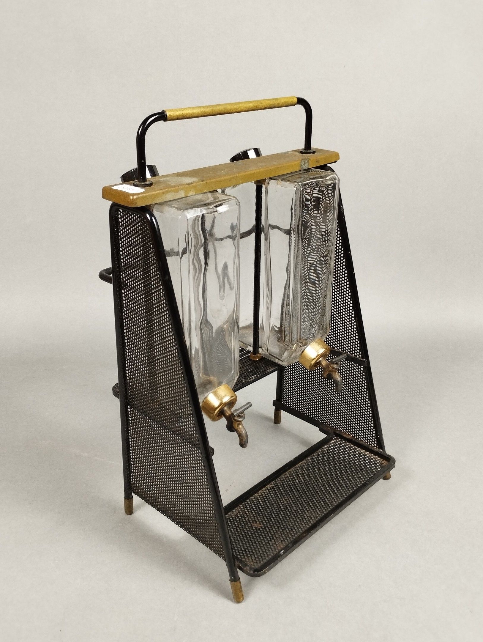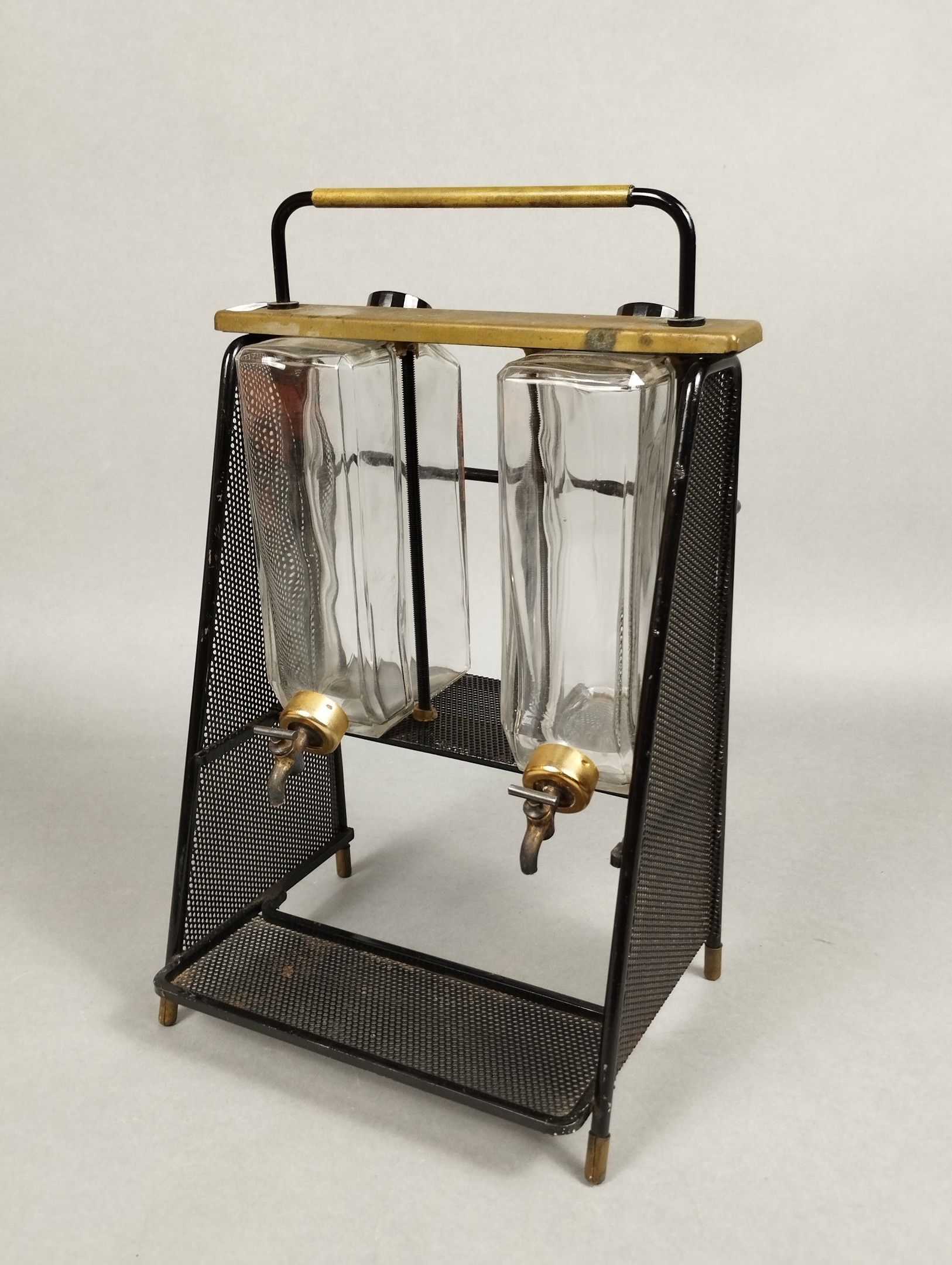 Mathieu MATEGOT (1910-2001). A black lacquered metal and rigitulle structure resting on four small brass sabots. The fountain features two glass containers with stoppers and taps. 36.5 x 23.5 x 19 cm. Bibliography: Philippe Jousse and Caroline Mondineu, "Mathieu Matégot", Jousse Entreprise éditions, model reproduced in archive photograph 1945-1960 under no. 73.