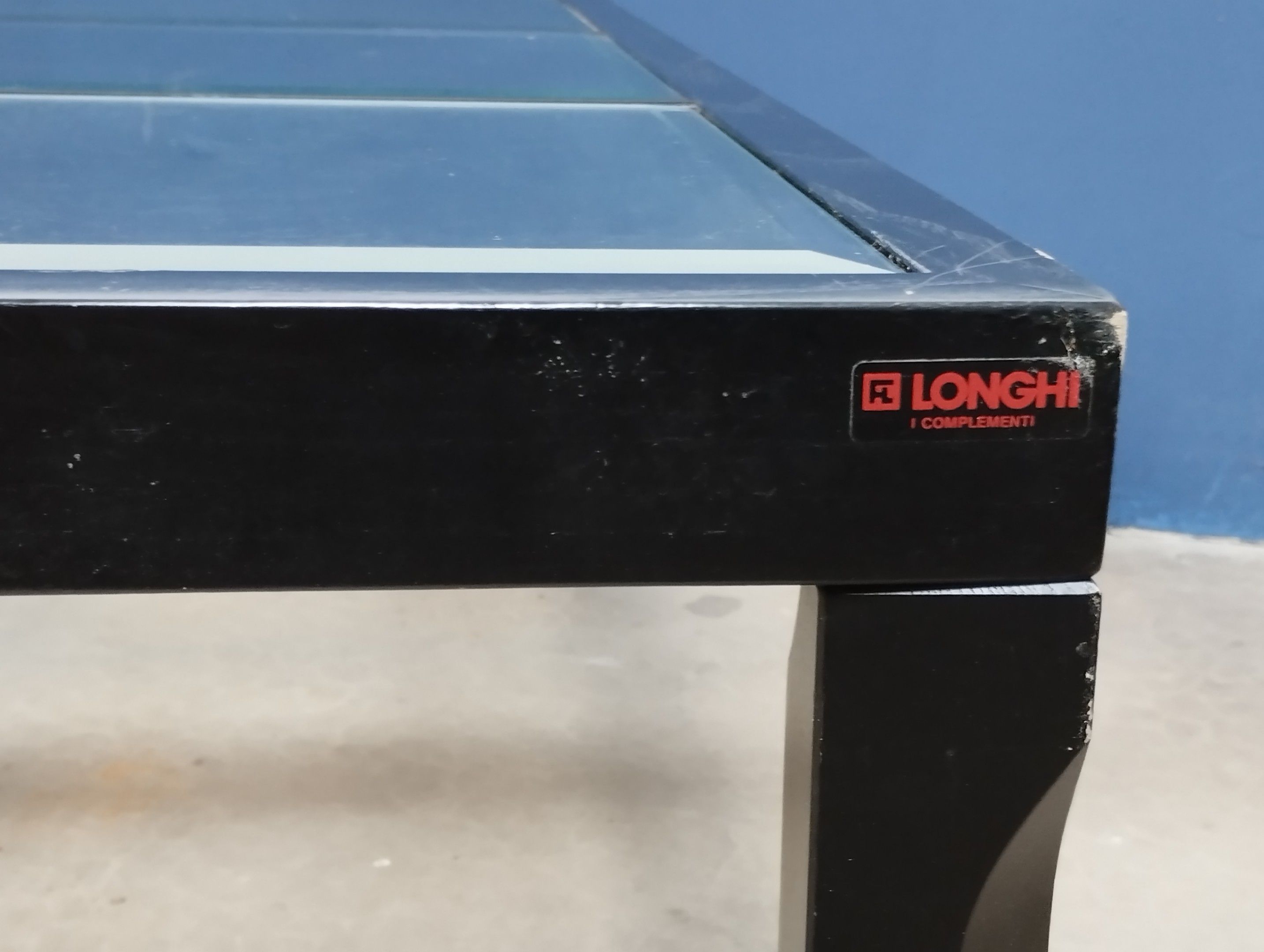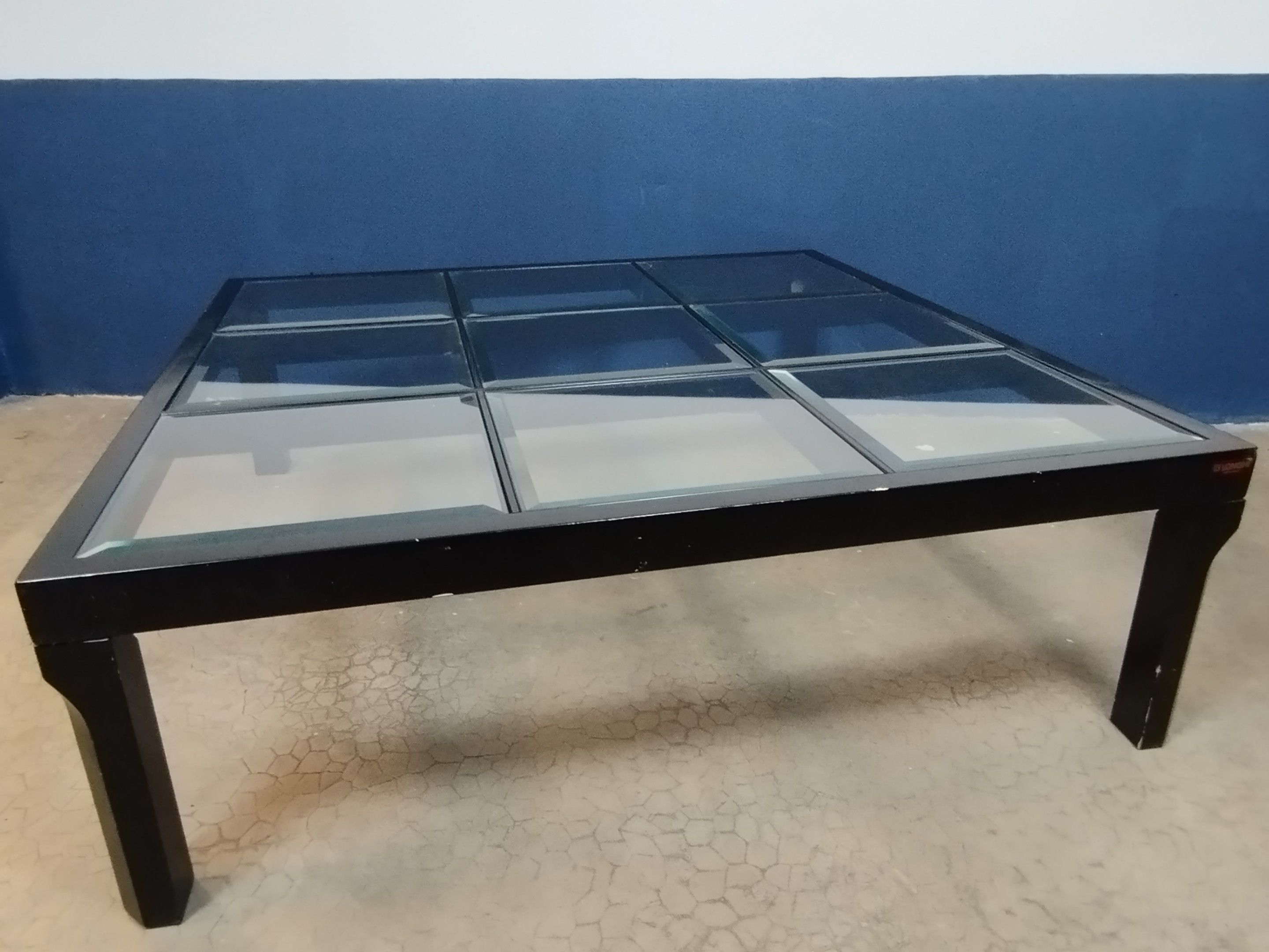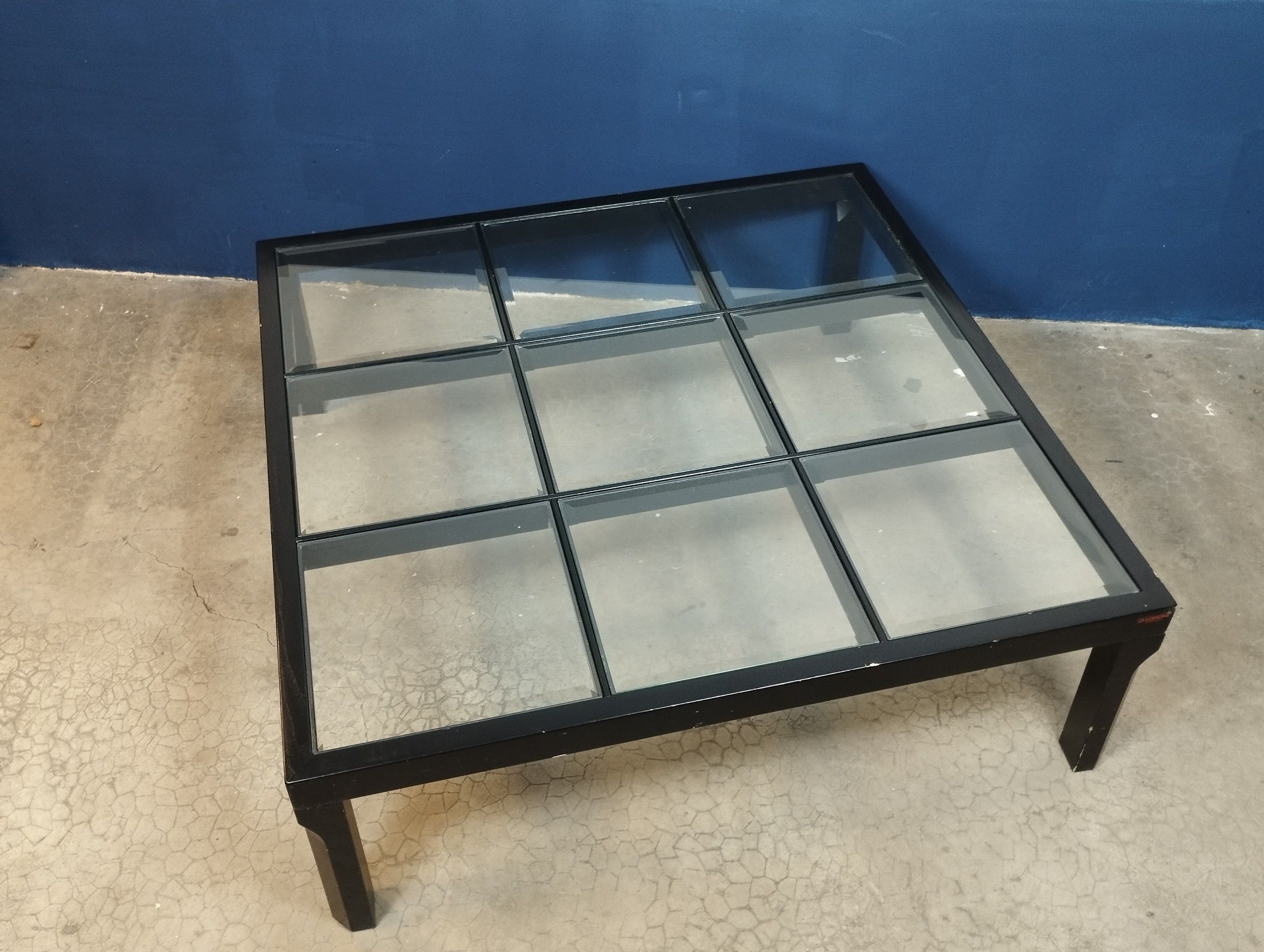 LONGHI, Italy. Vintage coffee table with square top. The blackened wood structure is decorated with nine bevelled glass tiles. Label on the base. Height = 32 cm; top: 98 x 98 cm. Some chips on the wood.