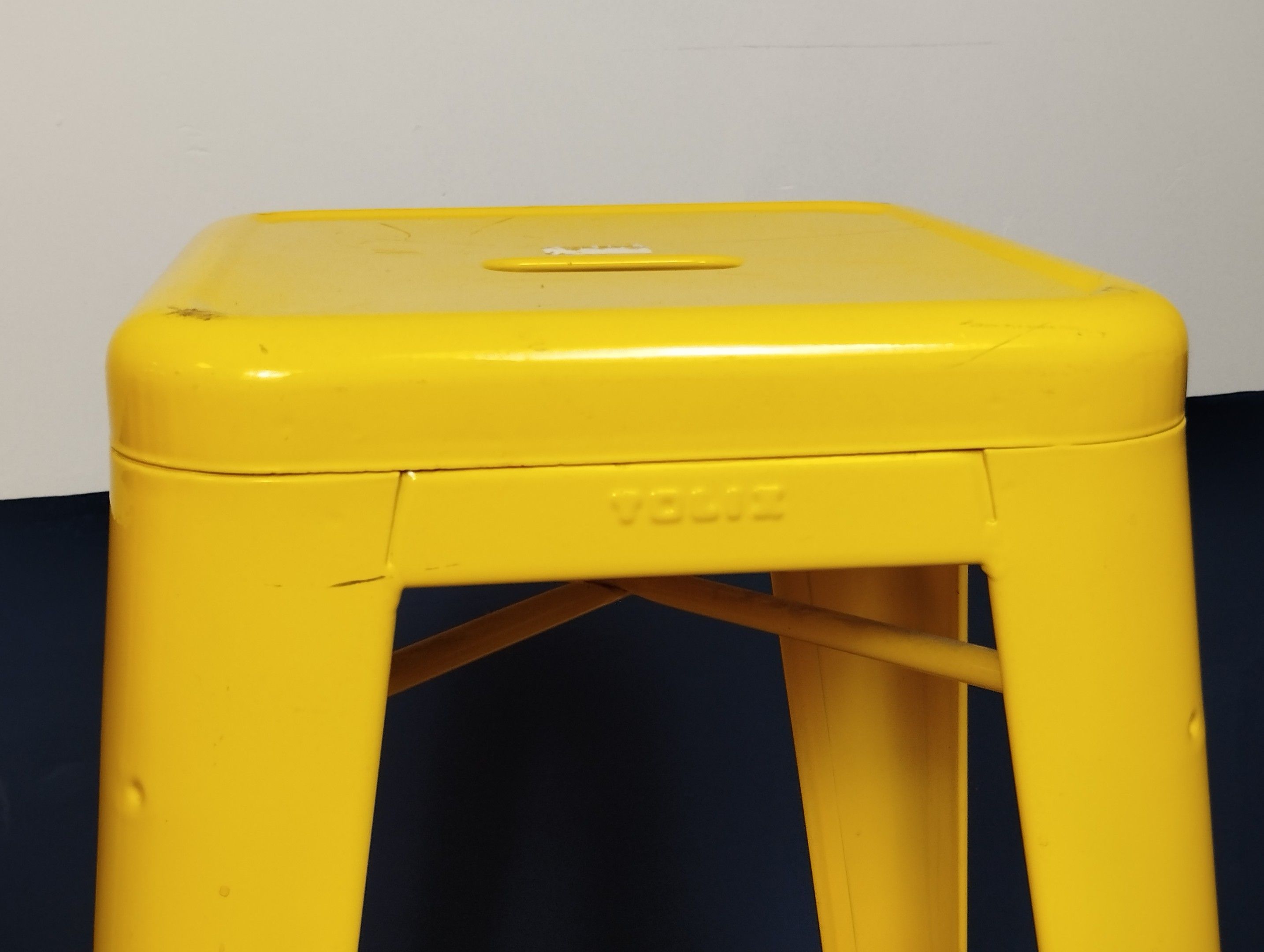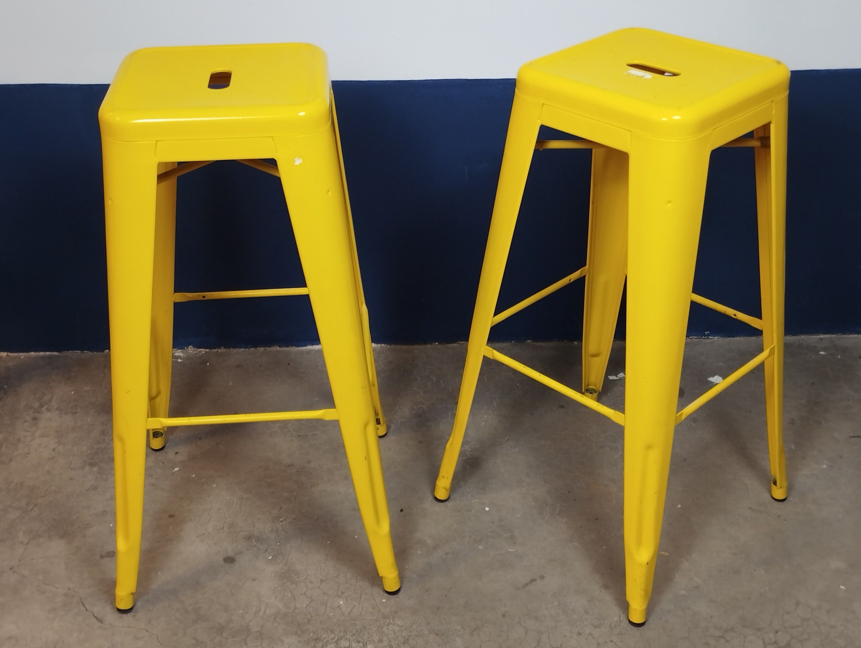 TOLIX. Two genuine "H" barstools (model created in 1937), in yellow lacquered metal. Stamped. Seat height: 82 cm. Traces of use.