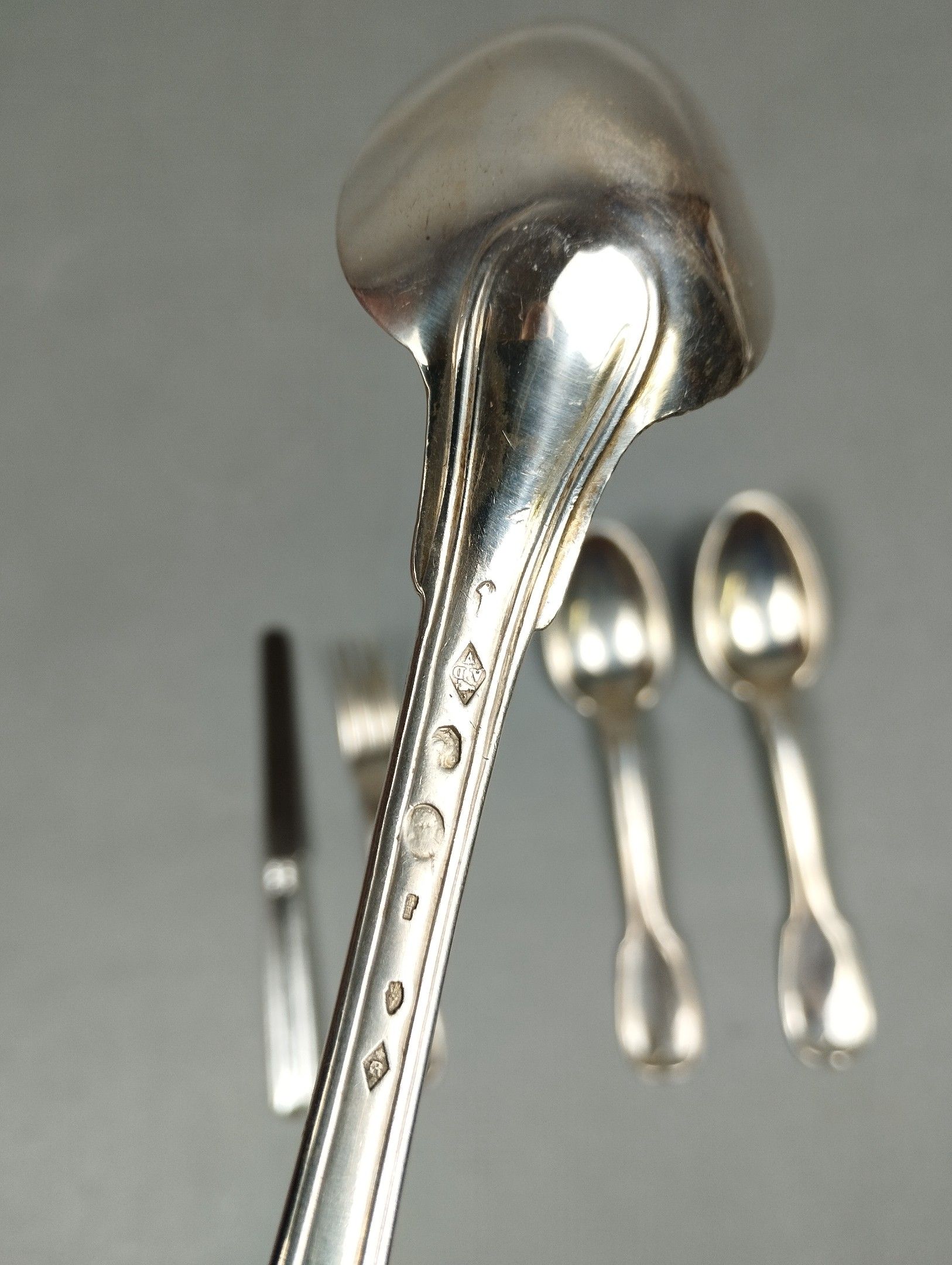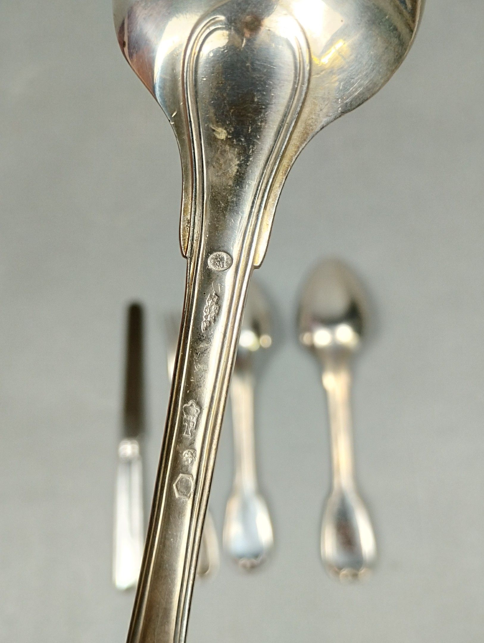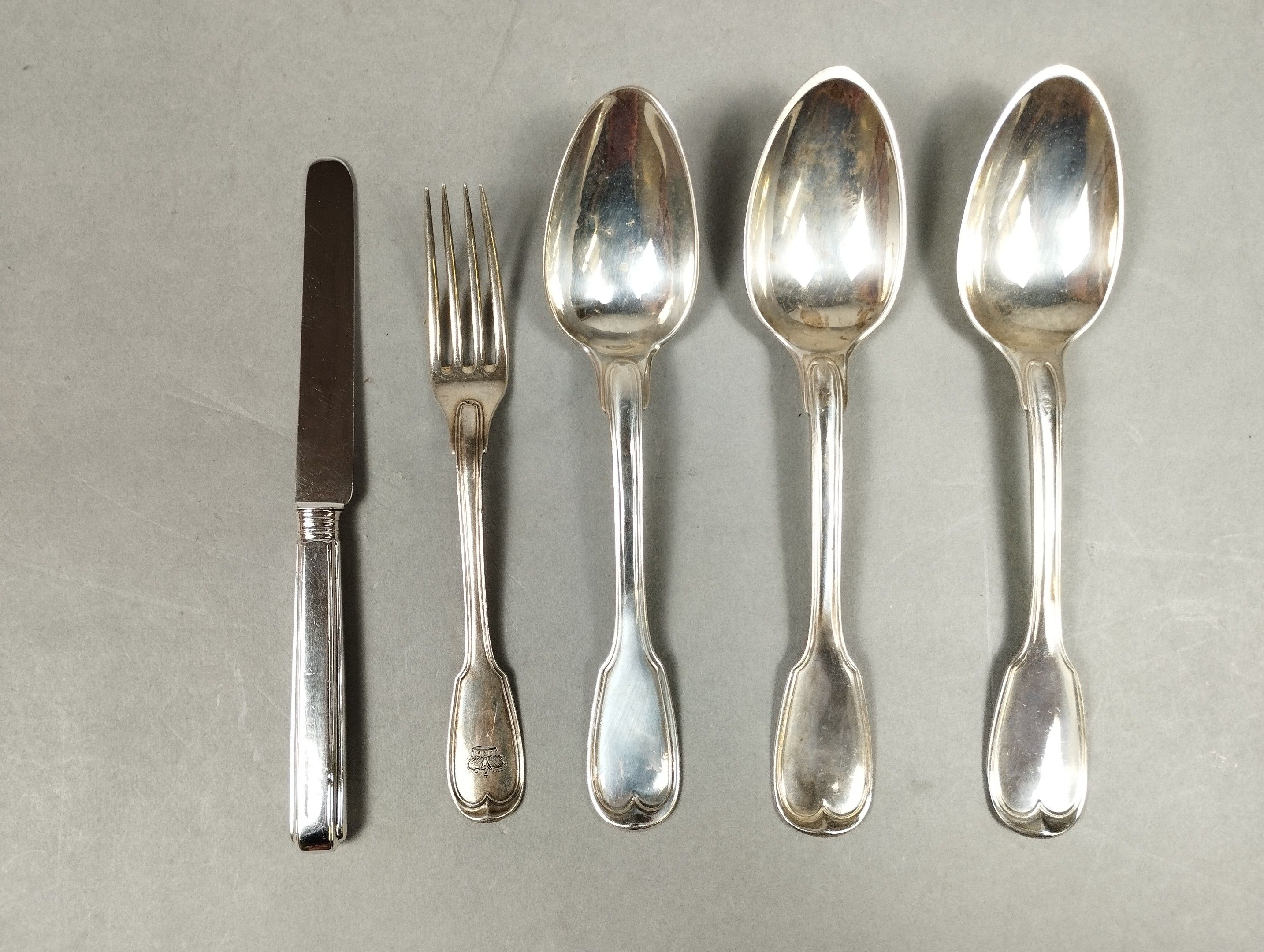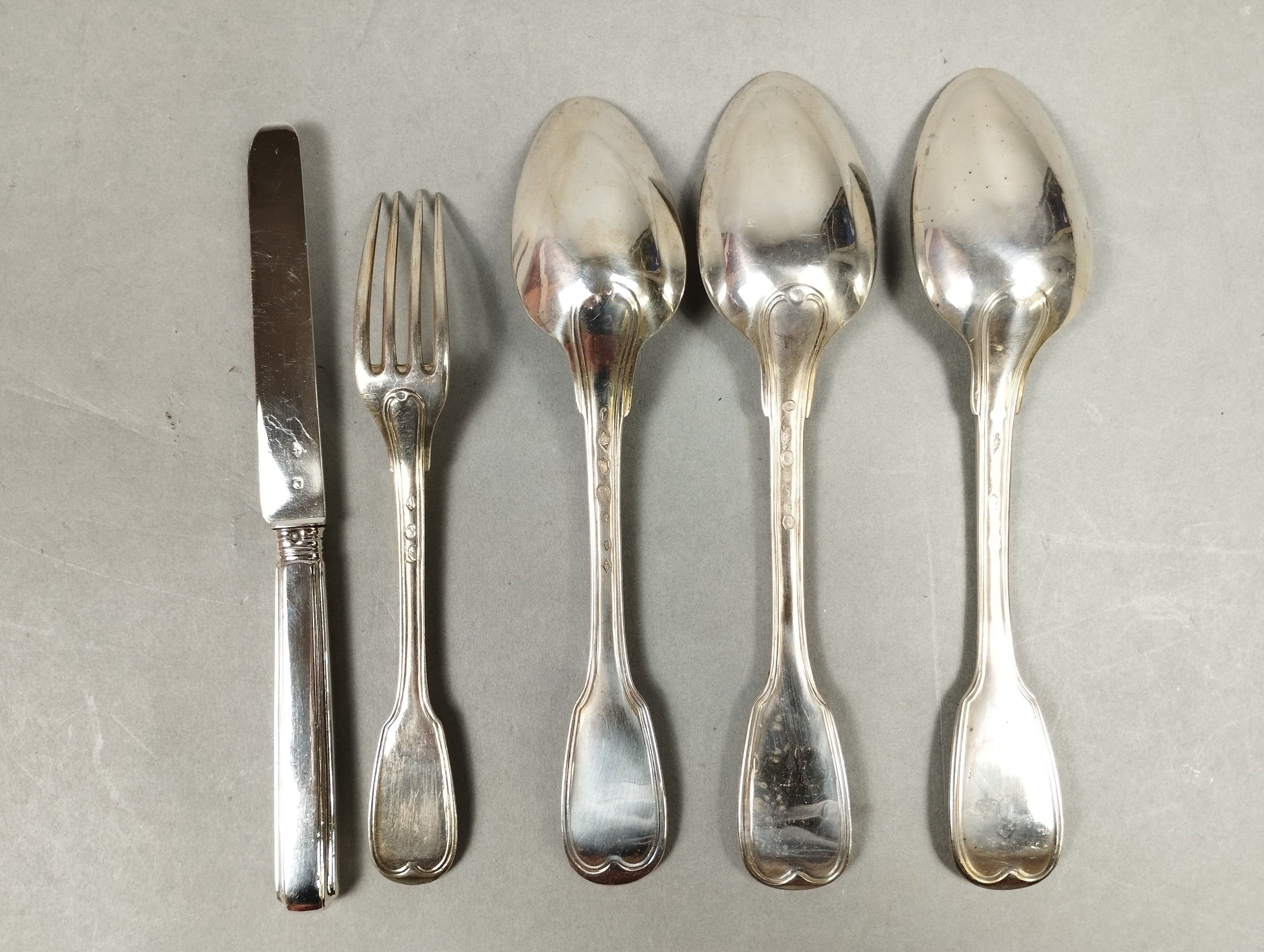 A set of silver cutlery (950/00) comprising three table spoons (Empire cock, Vieille - some repoinçonnés sur des poinçons de Paris - 1789), a dessert fork engraved with a crown of a prince of the Holy Empire (cock) and a silver-bladed fruit knife with a forged handle (Minerve). Total gross weight: 351 g. Repolished.