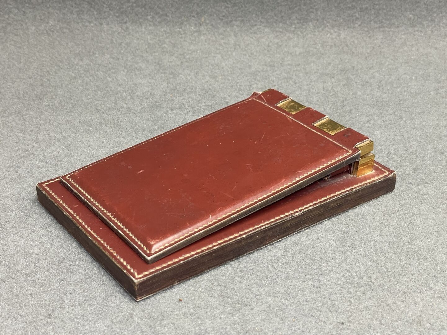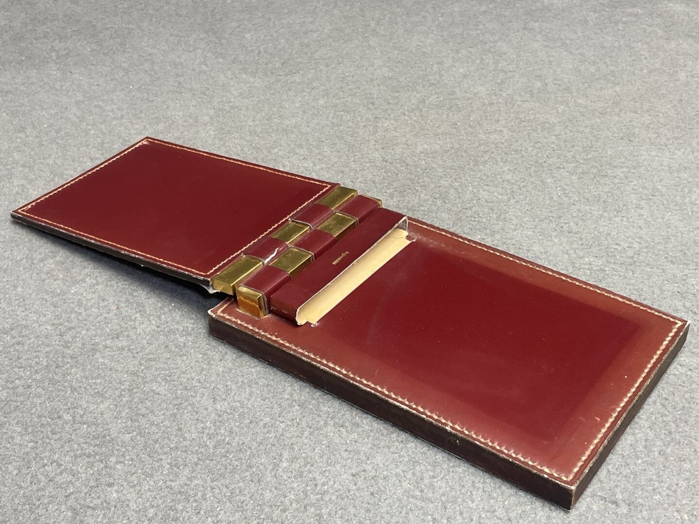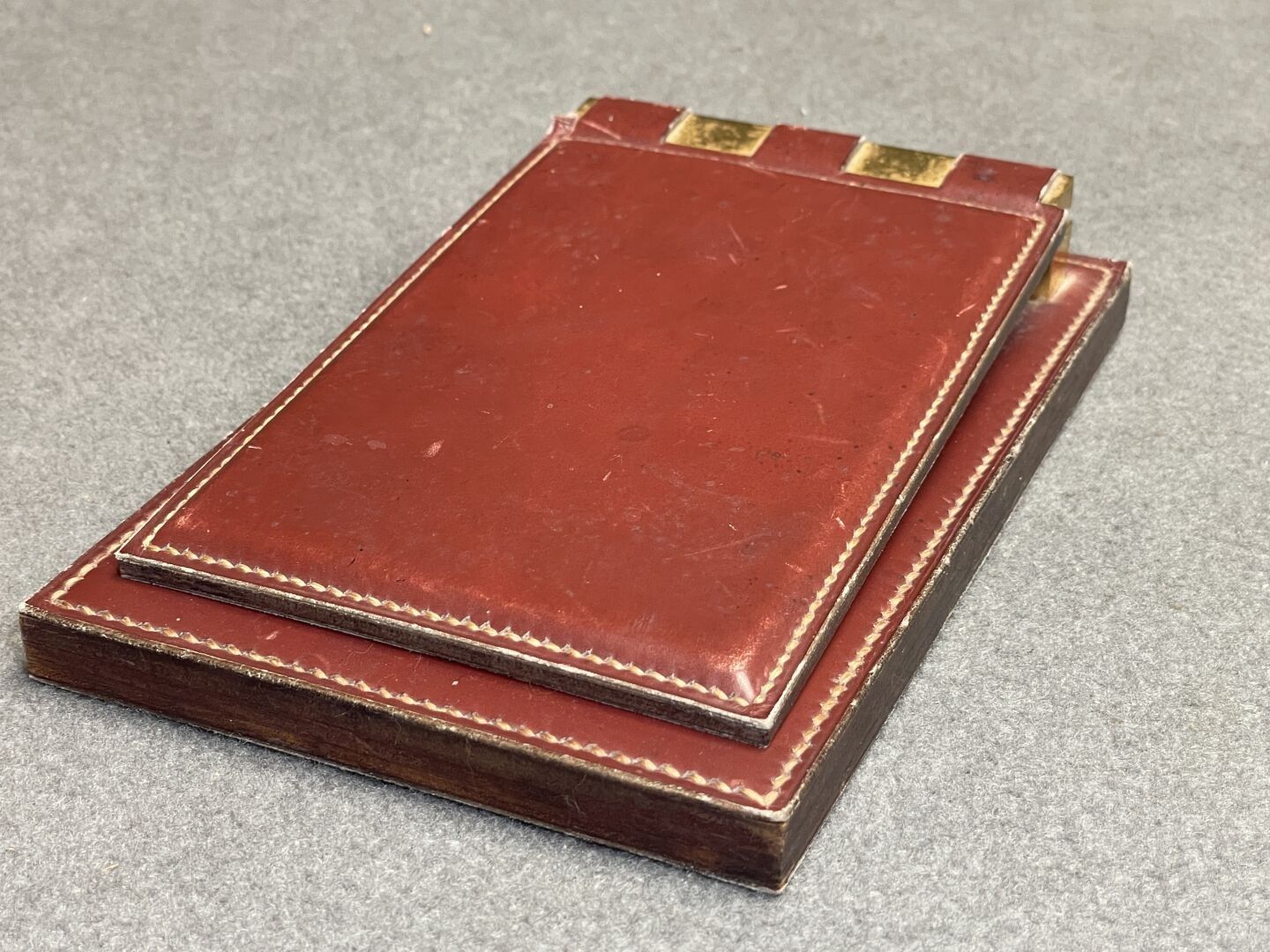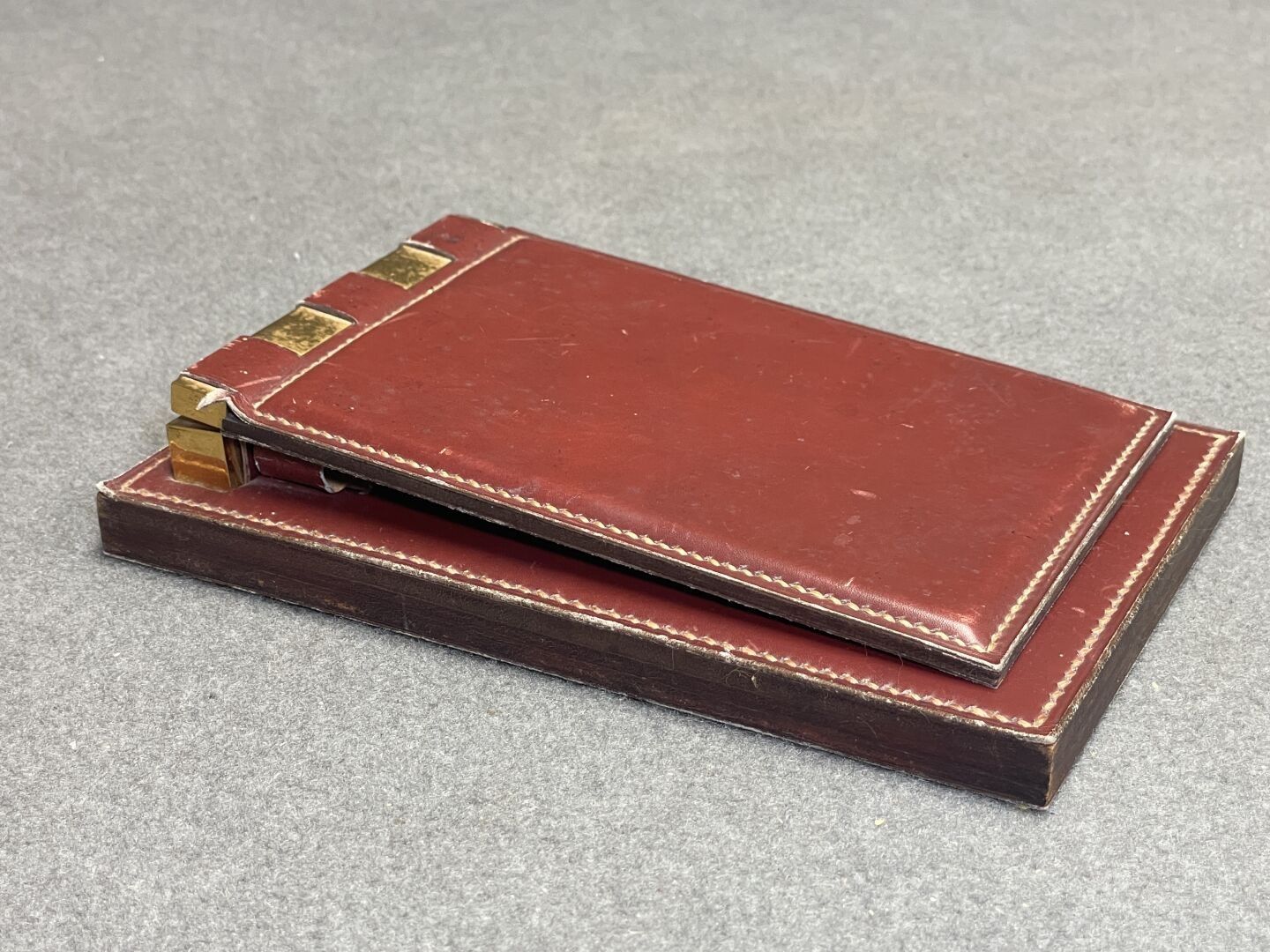 HERMÈS Paris. Notepad in burgundy box and gilt metal.