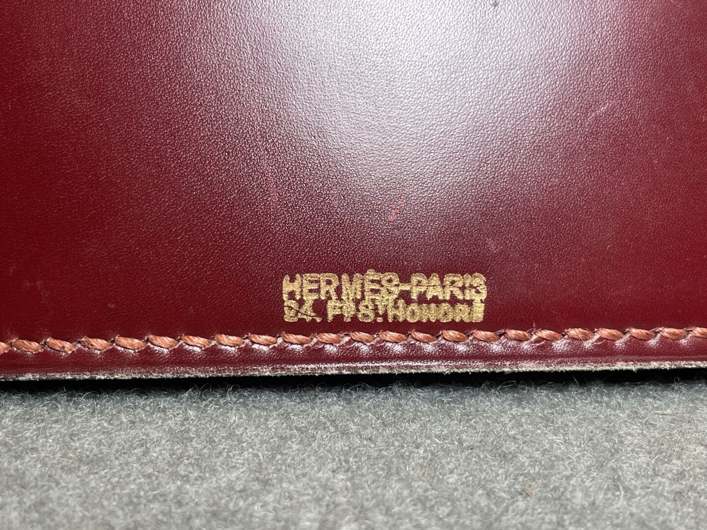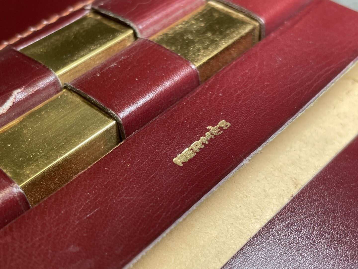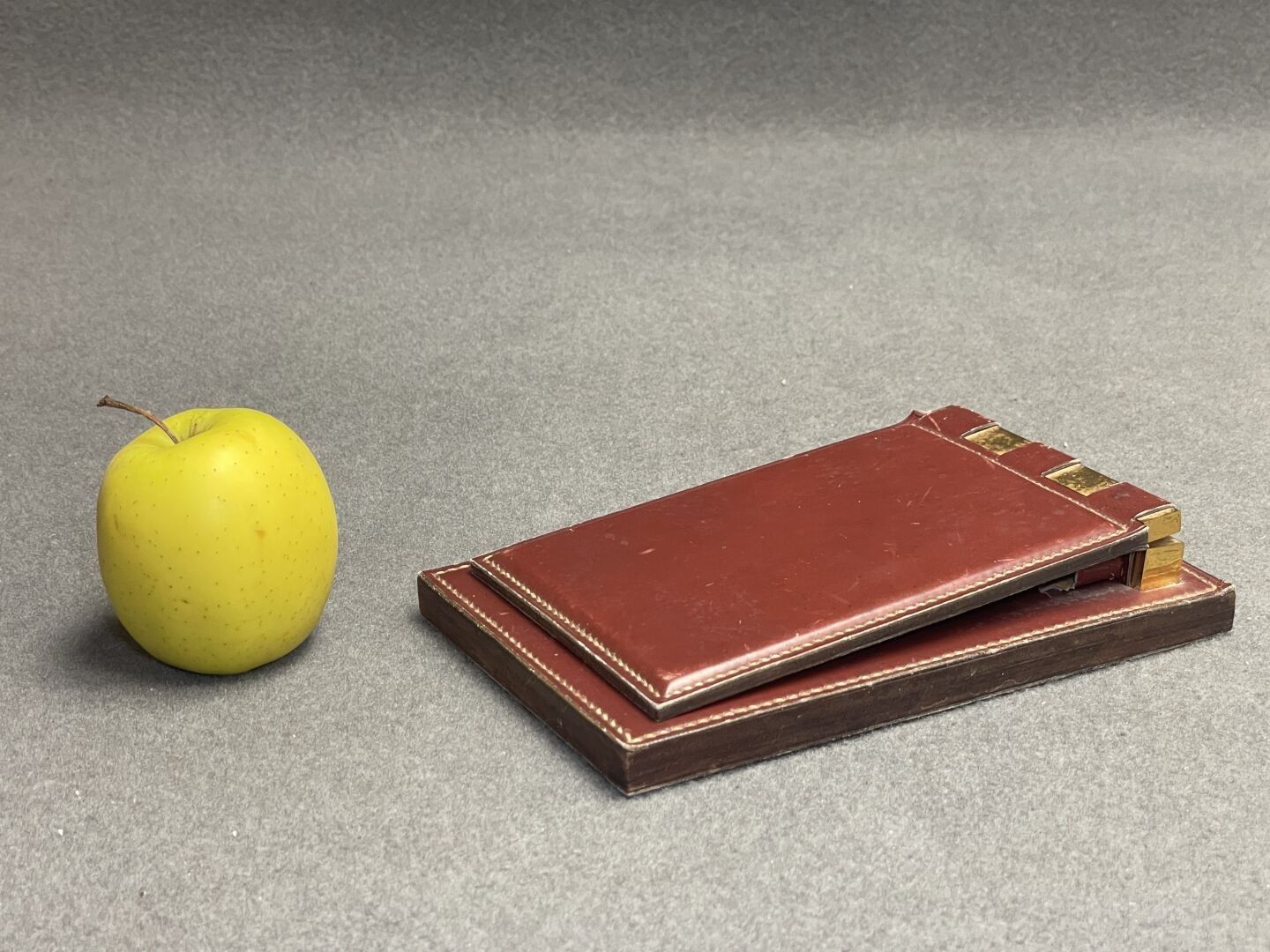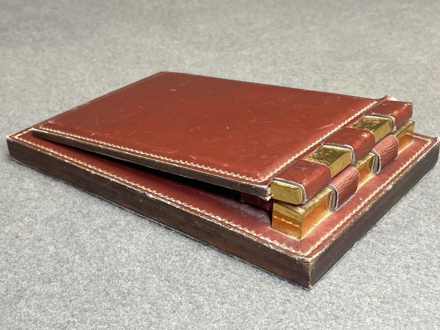 HERMÈS Paris. Notepad in burgundy box and gilt metal.