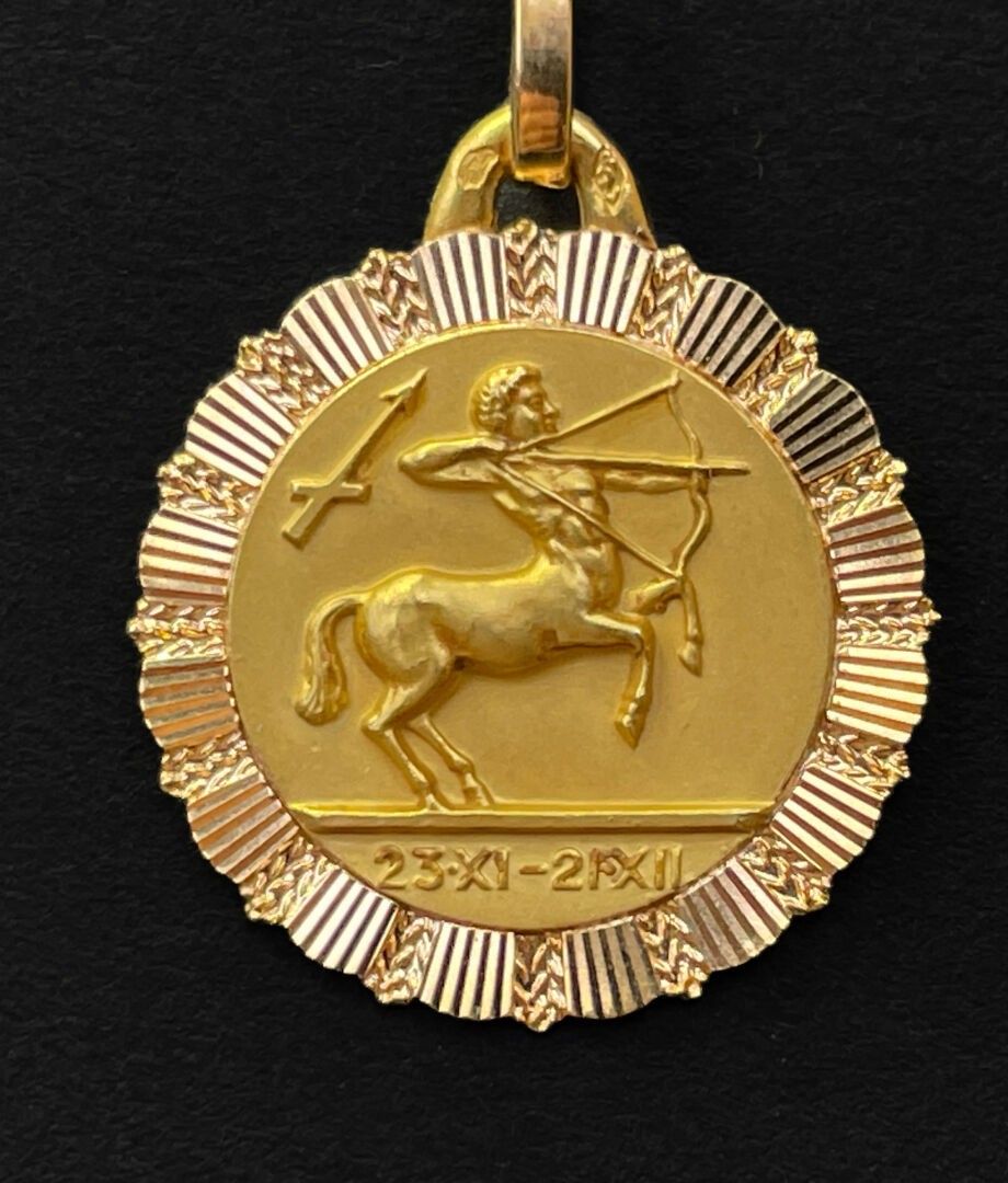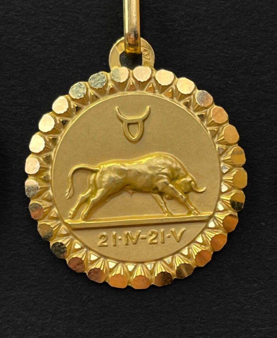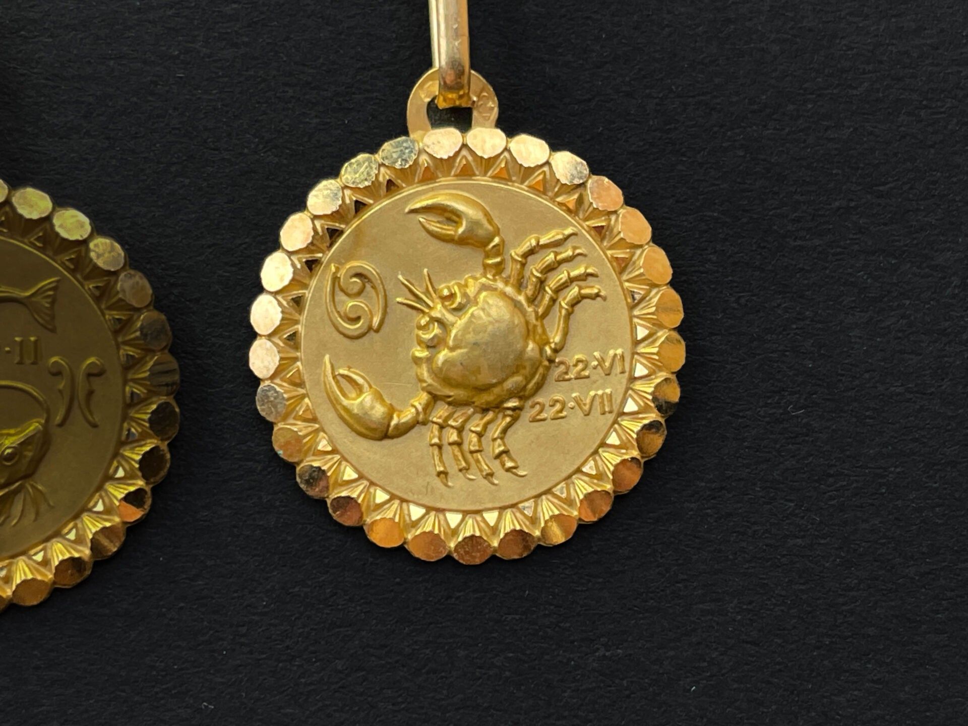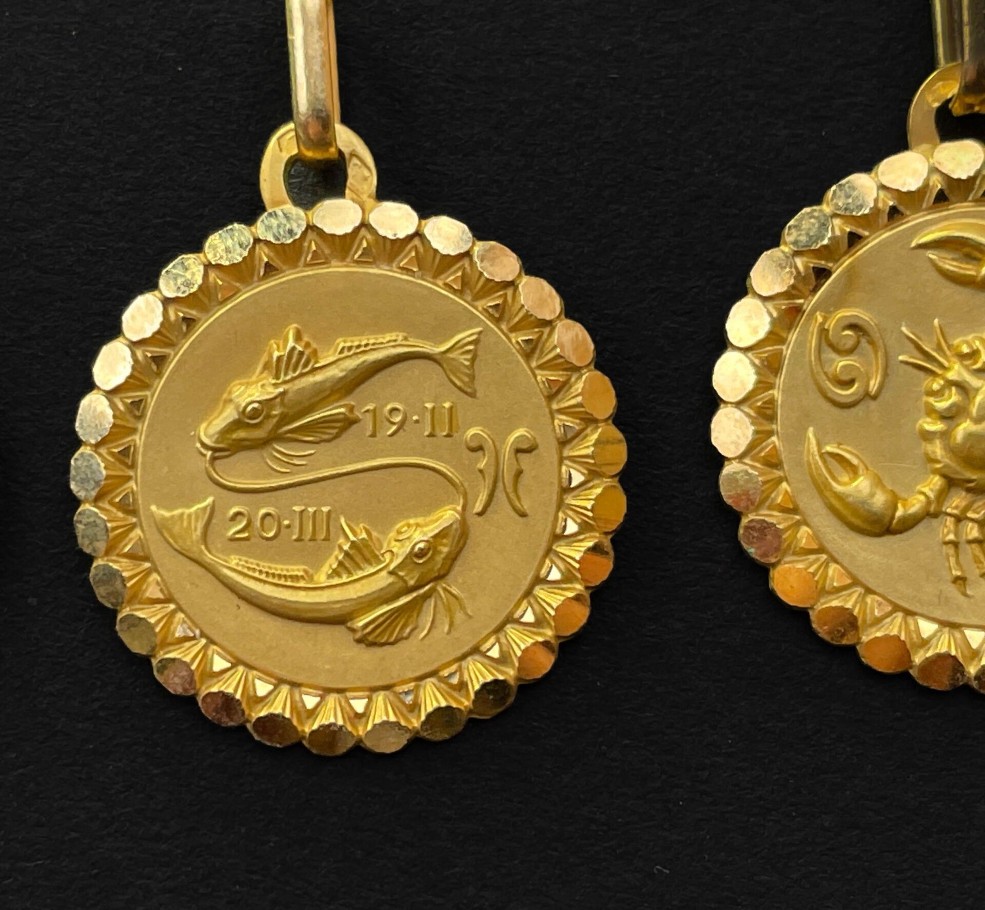 Four pendants decorated with astrological signs in gold.