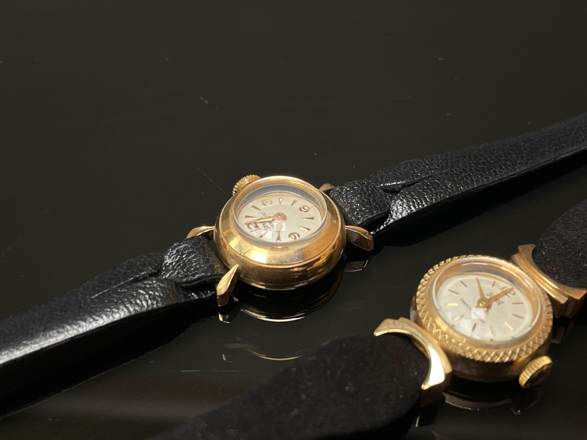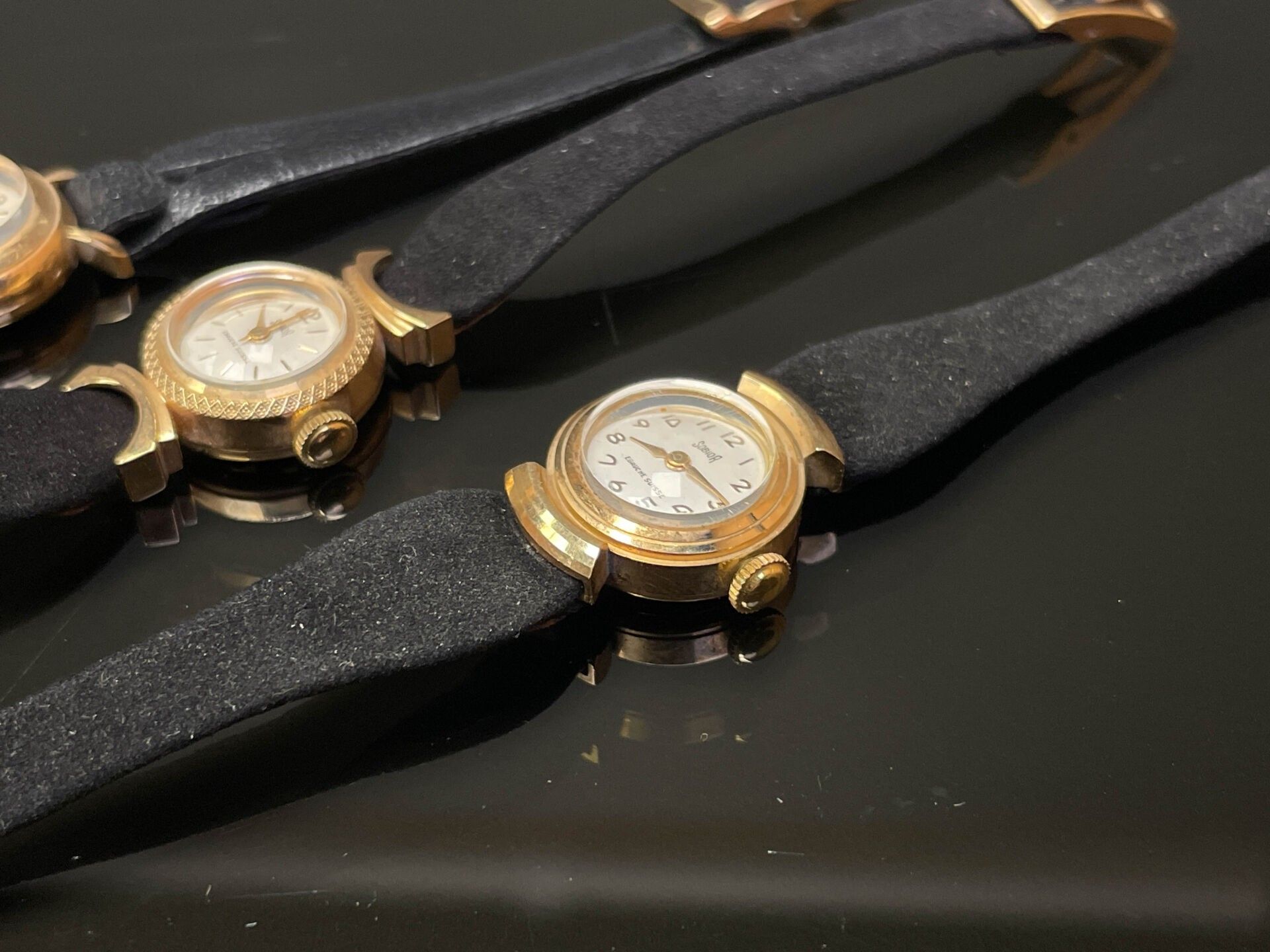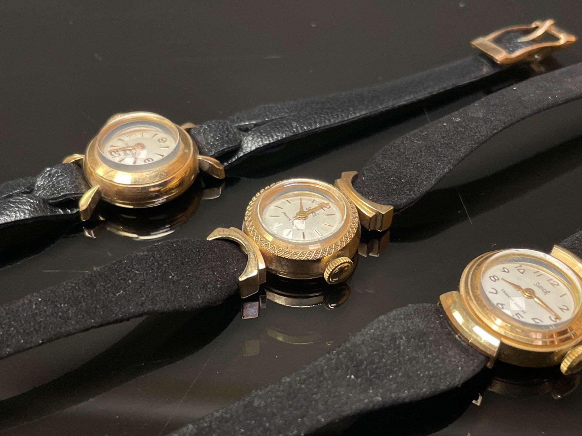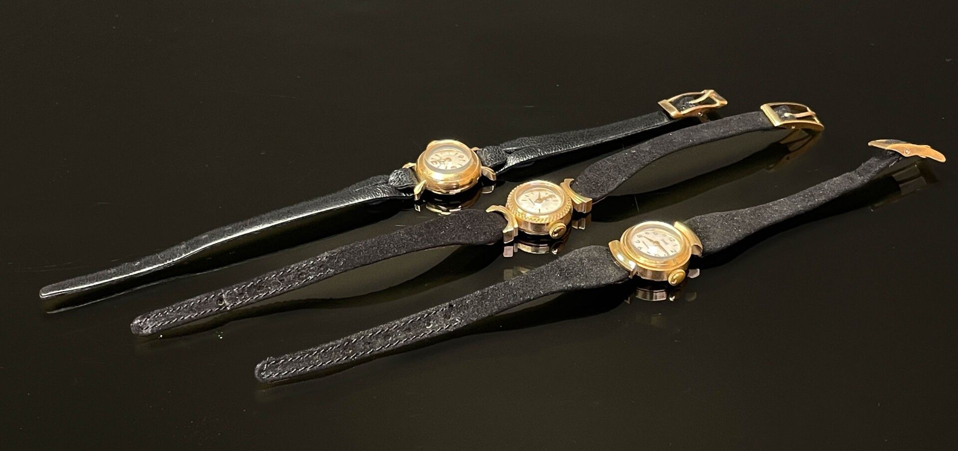 Three ladies' watches with 750°/00 gold cases, brand SOBIOR, black suede strap with gold-plated buckle.