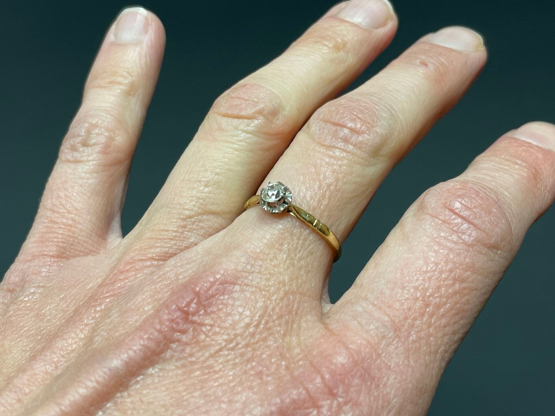 Yellow gold solitaire set with a small old-cut diamond, appr…