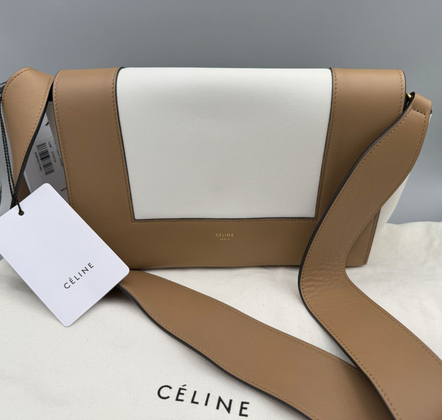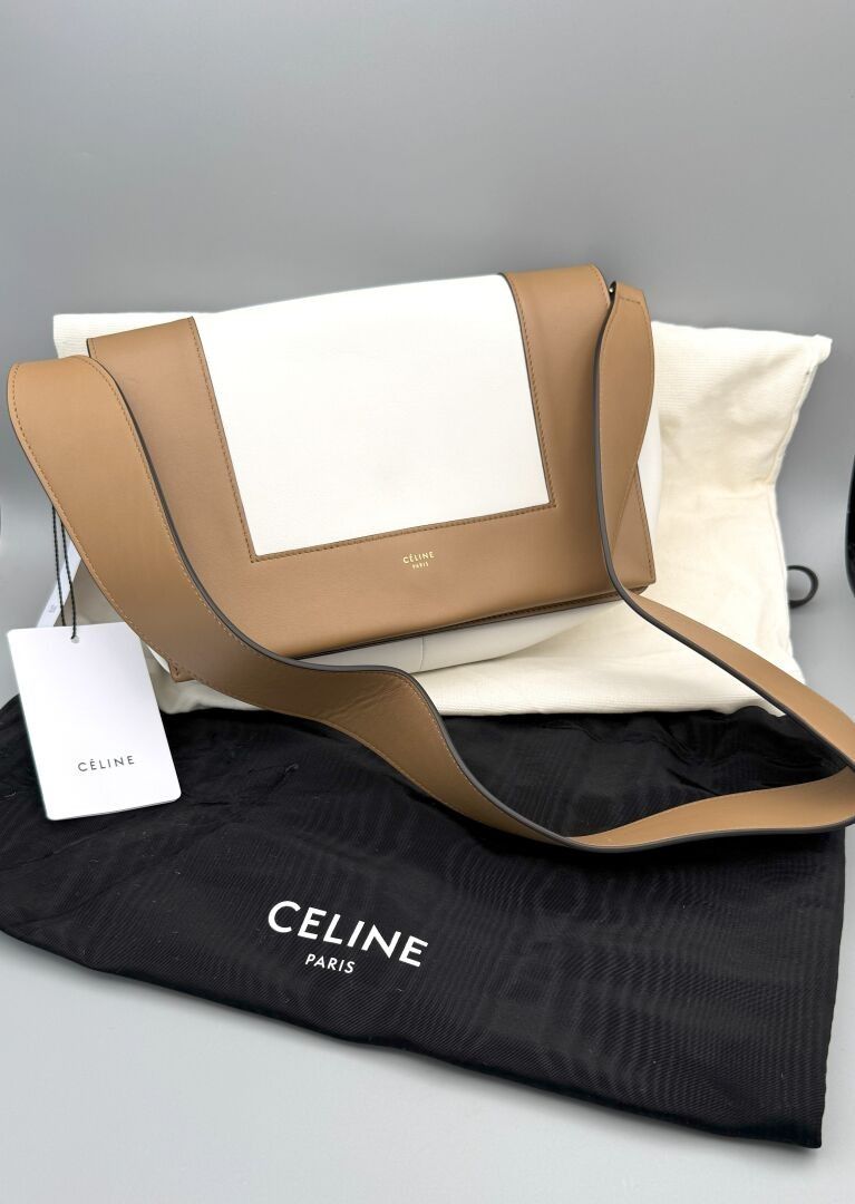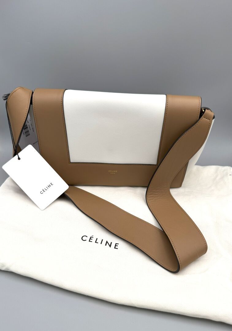 CELINE. FRAME bag in two-tone Tan/Optic White calfskin and lambskin. Structured design with flap and adjustable shoulder strap for carrying on the shoulder or across the body. Magnetic flap closure. Smooth leather interior and patch pocket. Gold embossed CELINE Paris logo on front. 7 x 25 x 10 cm Brand new with label and two pouches