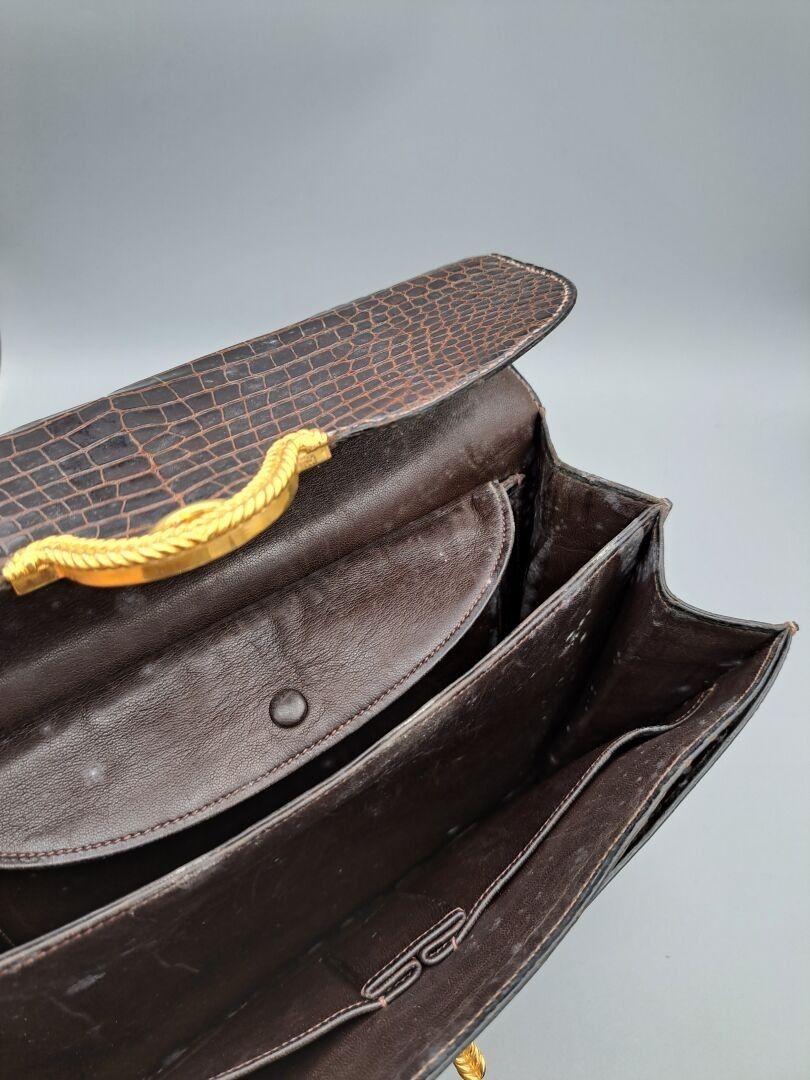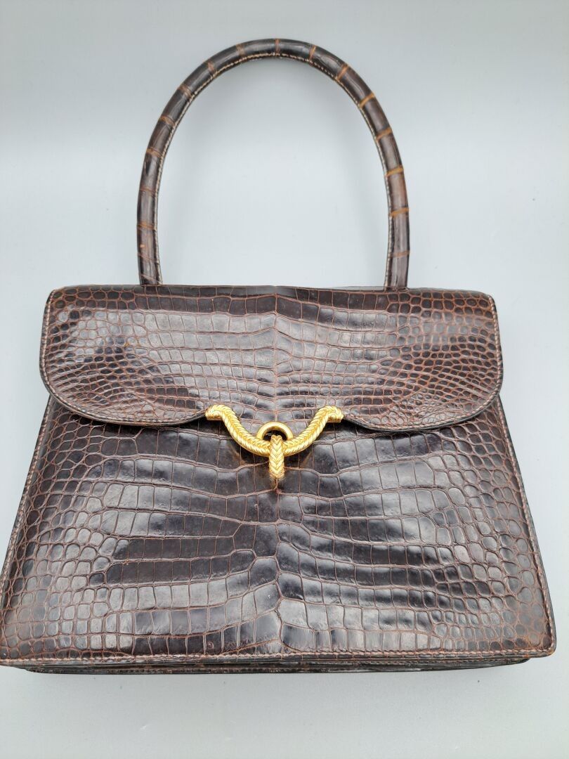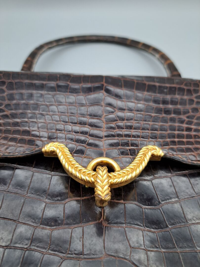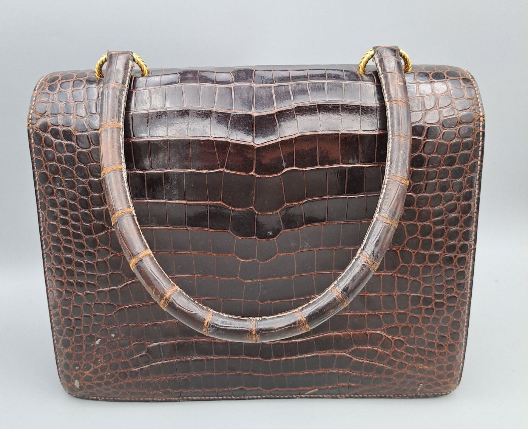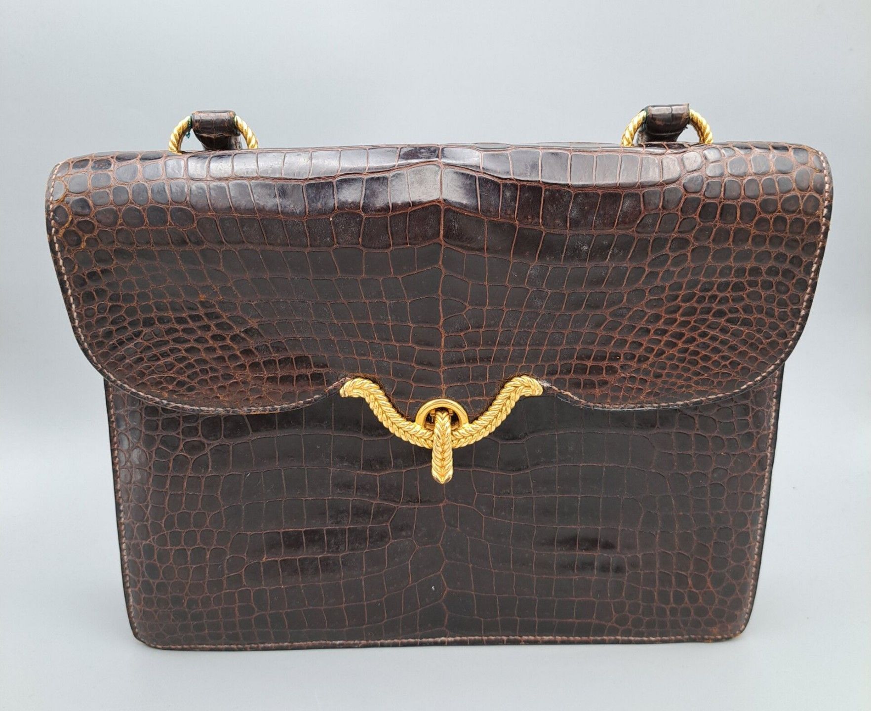 HERMES - HERMES - Vasco bag in estuary brown crocodile, rectangular shape with flap. Gilded metal clasp in the shape of a stylised V, characteristic of the model. Side rings for shoulder strap (not shown), Work circa 1960, 36 x 25 cm.