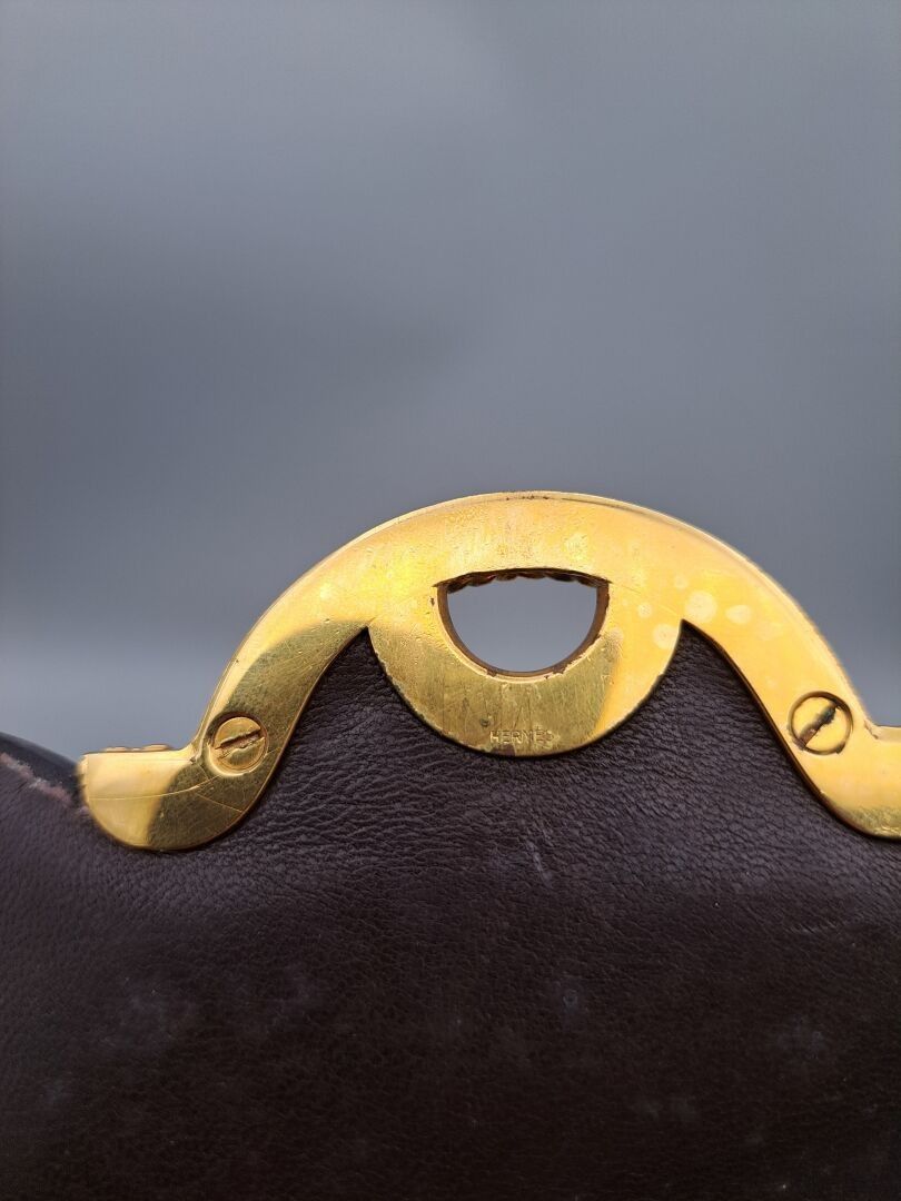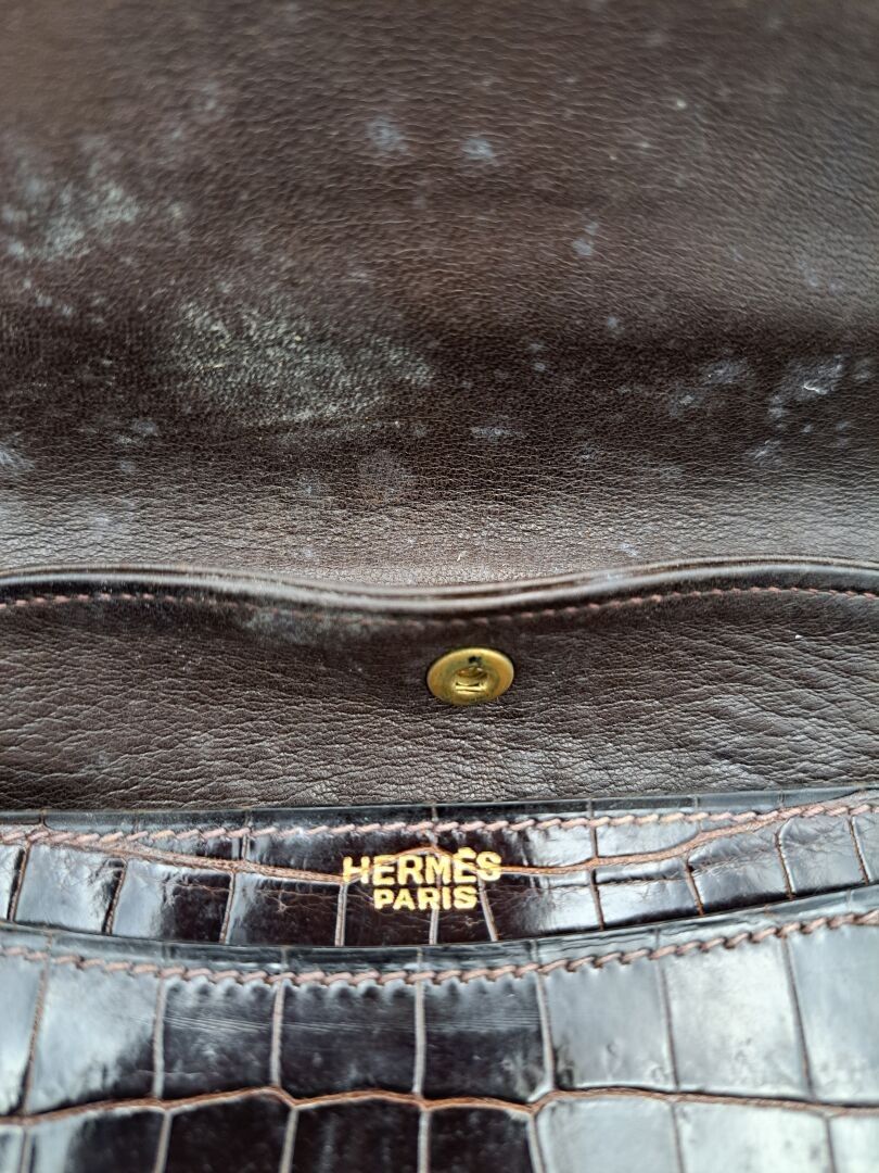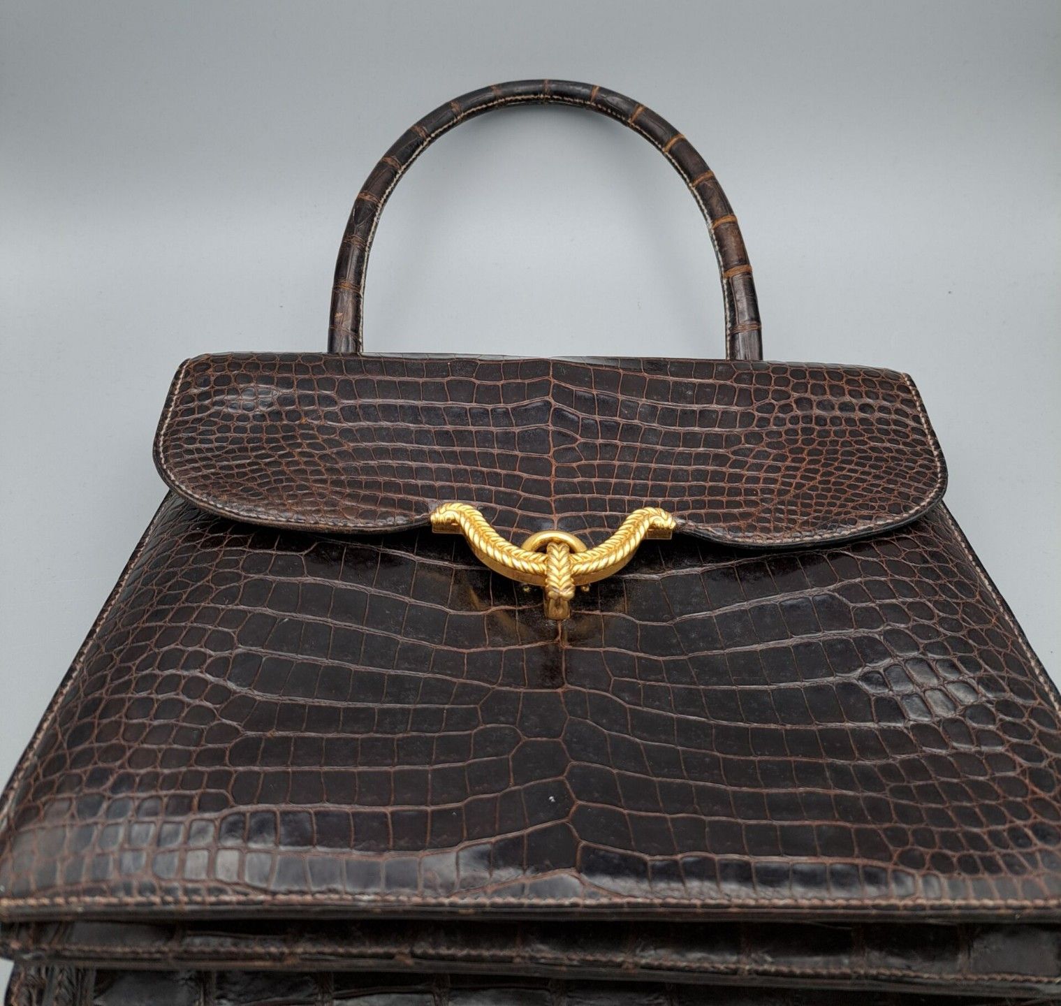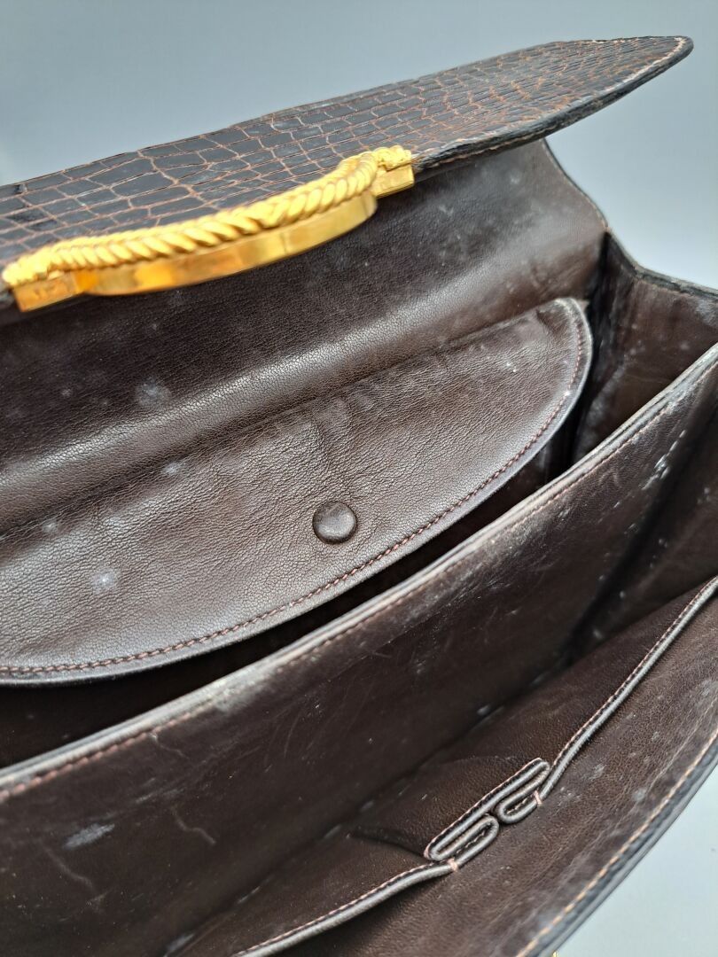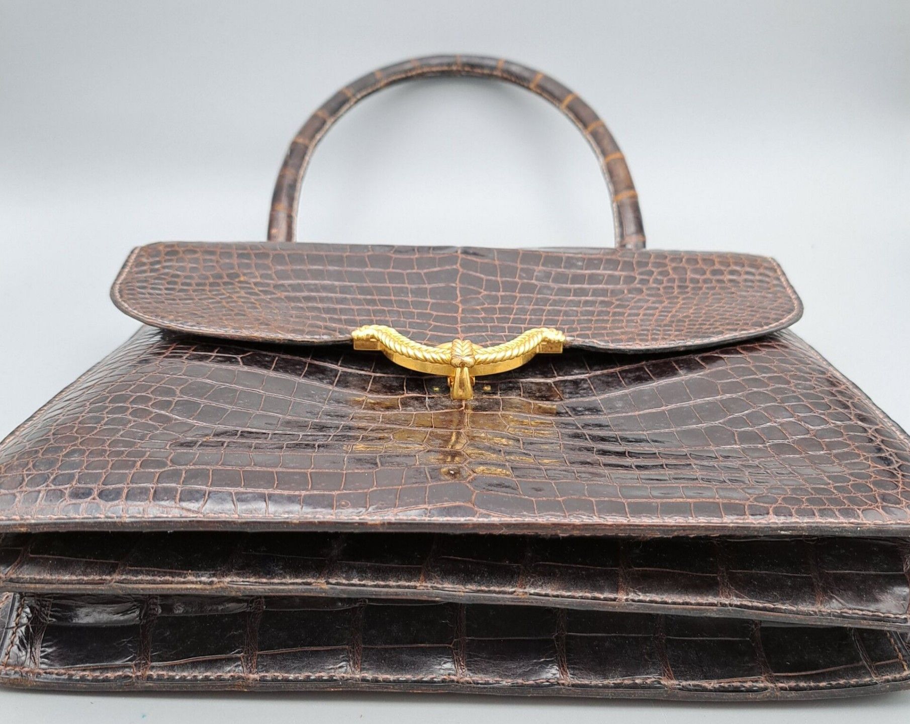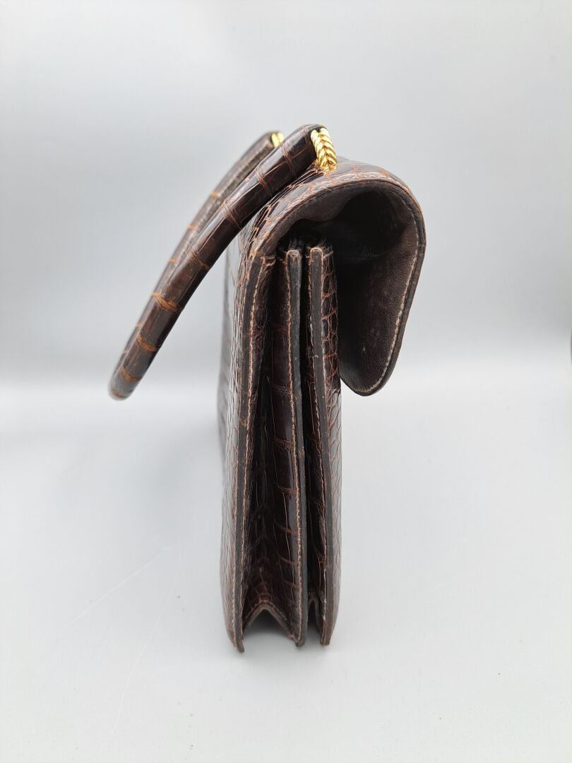 HERMES - HERMES - Vasco bag in estuary brown crocodile, rectangular shape with flap. Gilded metal clasp in the shape of a stylised V, characteristic of the model. Side rings for shoulder strap (not shown), Work circa 1960, 36 x 25 cm.