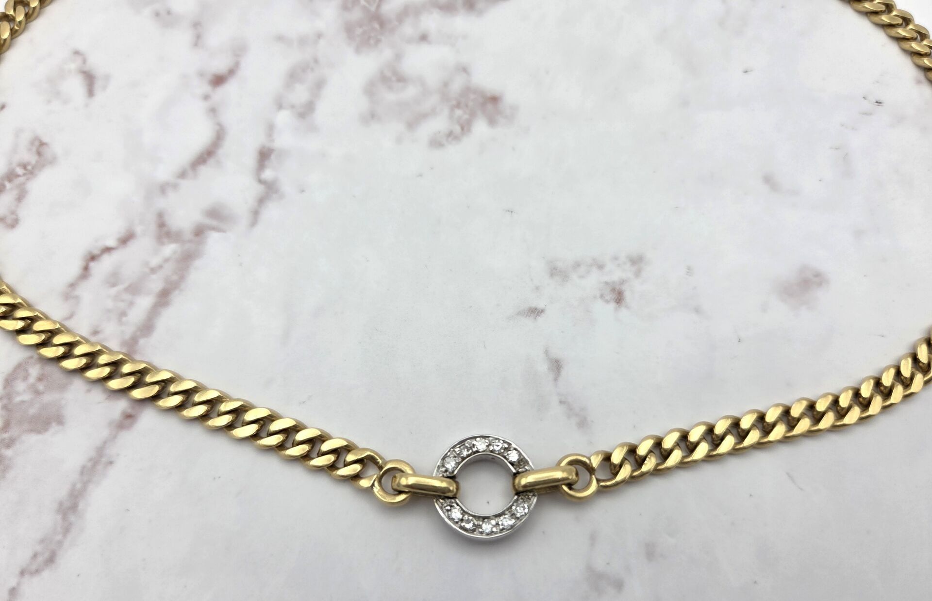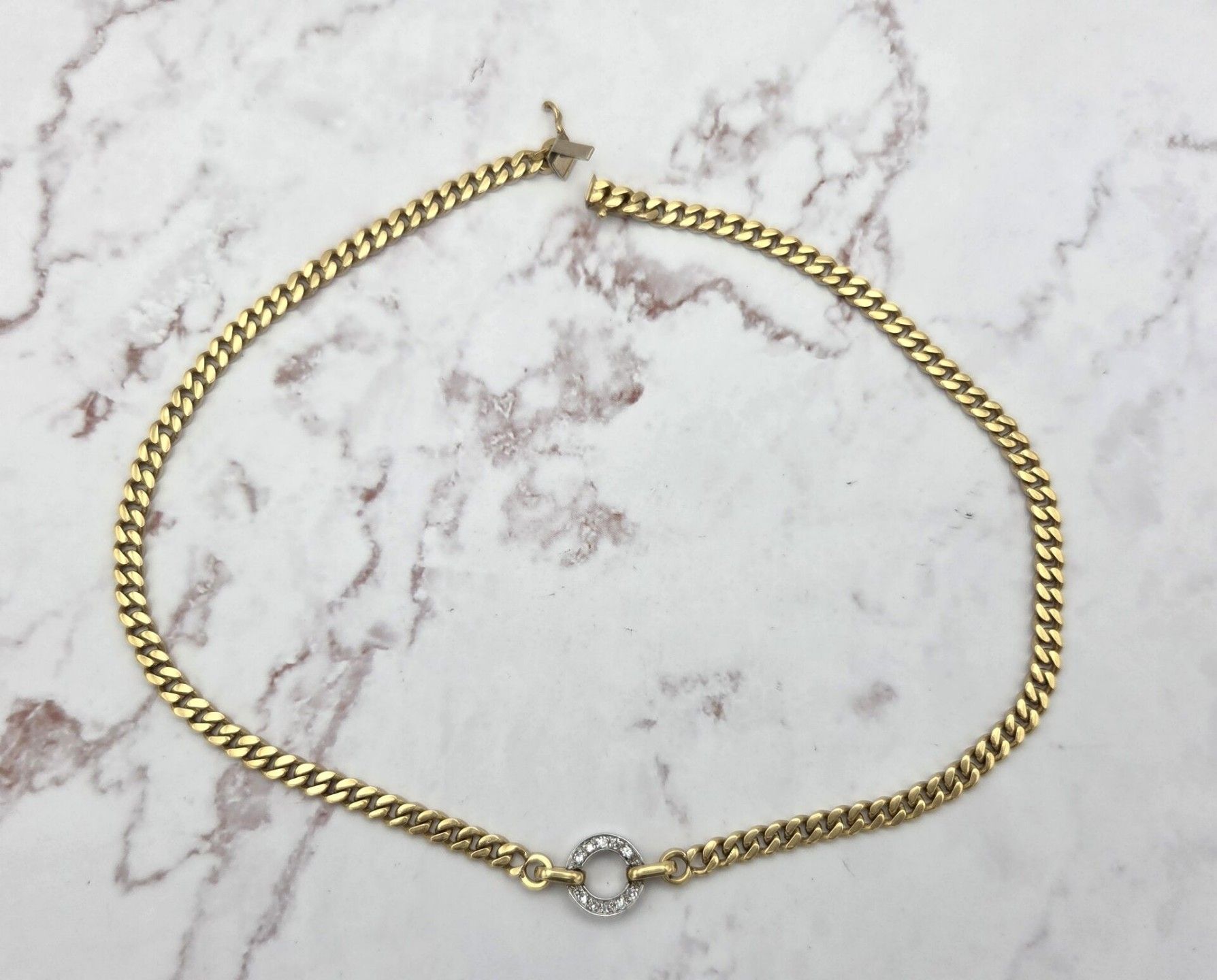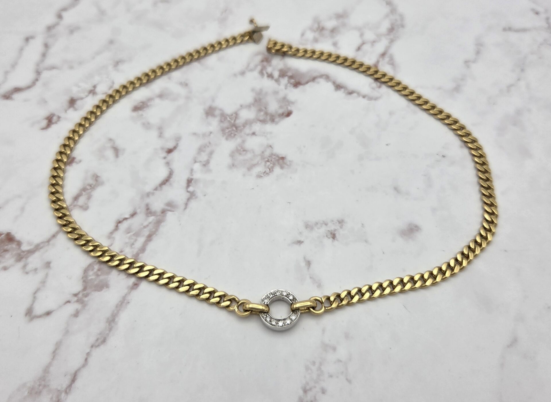 750 thousandths yellow gold choker necklace, gourmette stitch, central round motif in white gold paved with simplified-cut diamonds, weight: 34.6 g, length: 40 cm