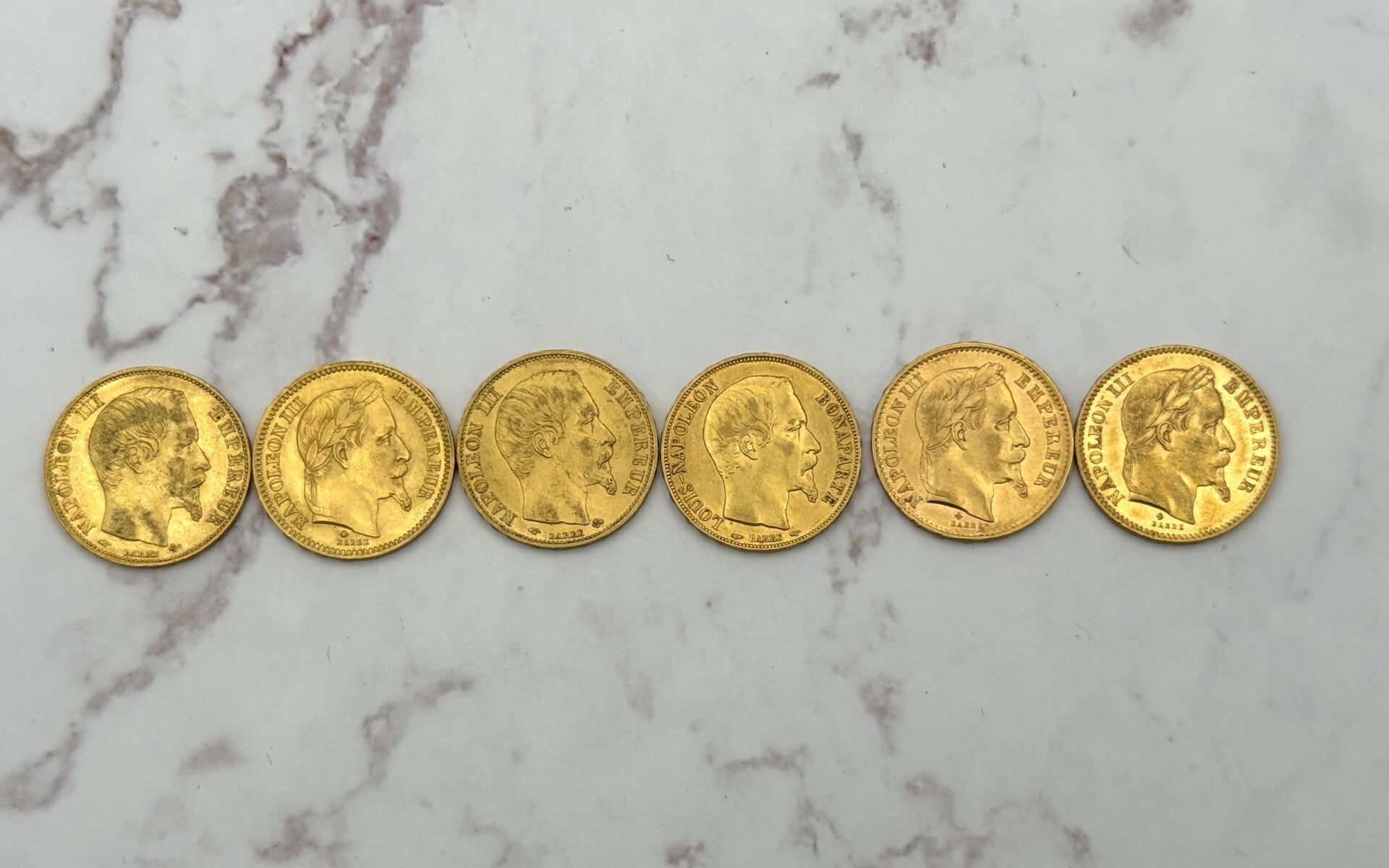 6 Napoleon 20 franc gold coins, 3 with laurel heads and 3 without, total weight :38,76 g - NOT EXHIBITED IN THE ROOM