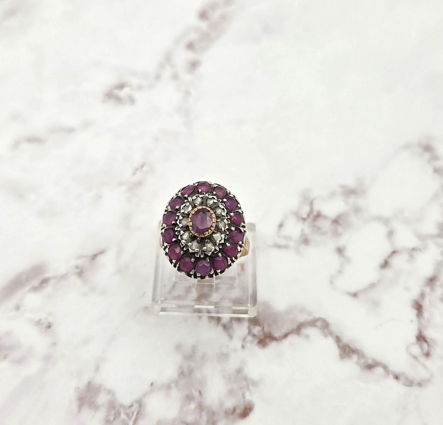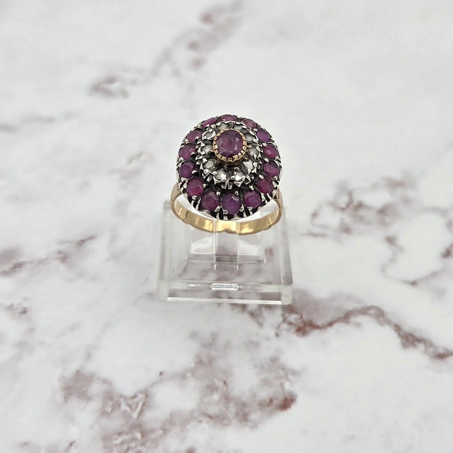A ring in 750 thousandths yellow gold and silver, set with rose-cut diamonds and rubies - PB: 4.3 g - TDD: 47 (rubies chipped)