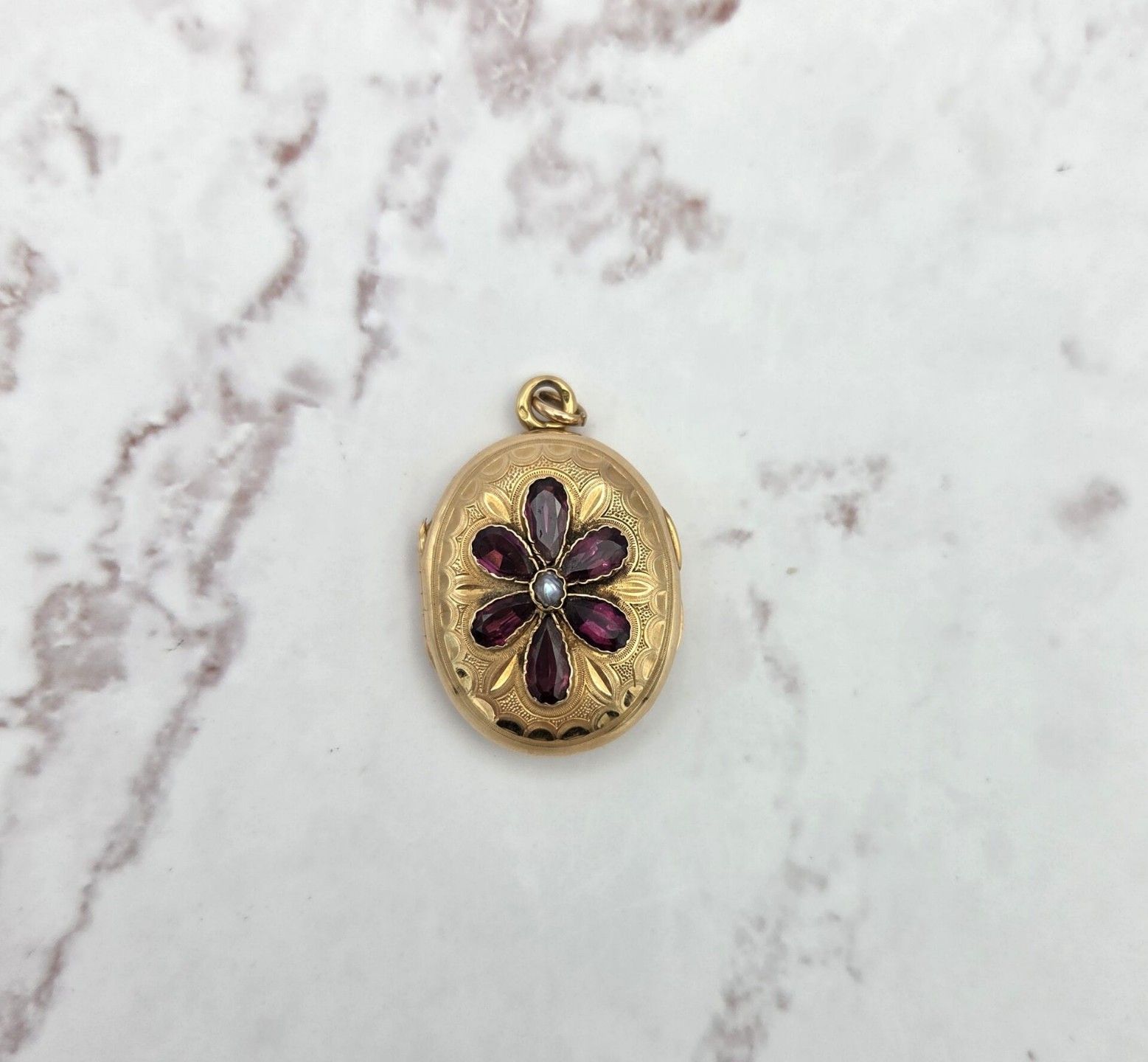 Oval photo holder pendant in 750 thousandths yellow gold with chased decoration set with rhodolite garnets and a central half-pearl, the interior adorned with a glass, weight: 9.2 g, eagle head hallmark, length: 3.5 cm
