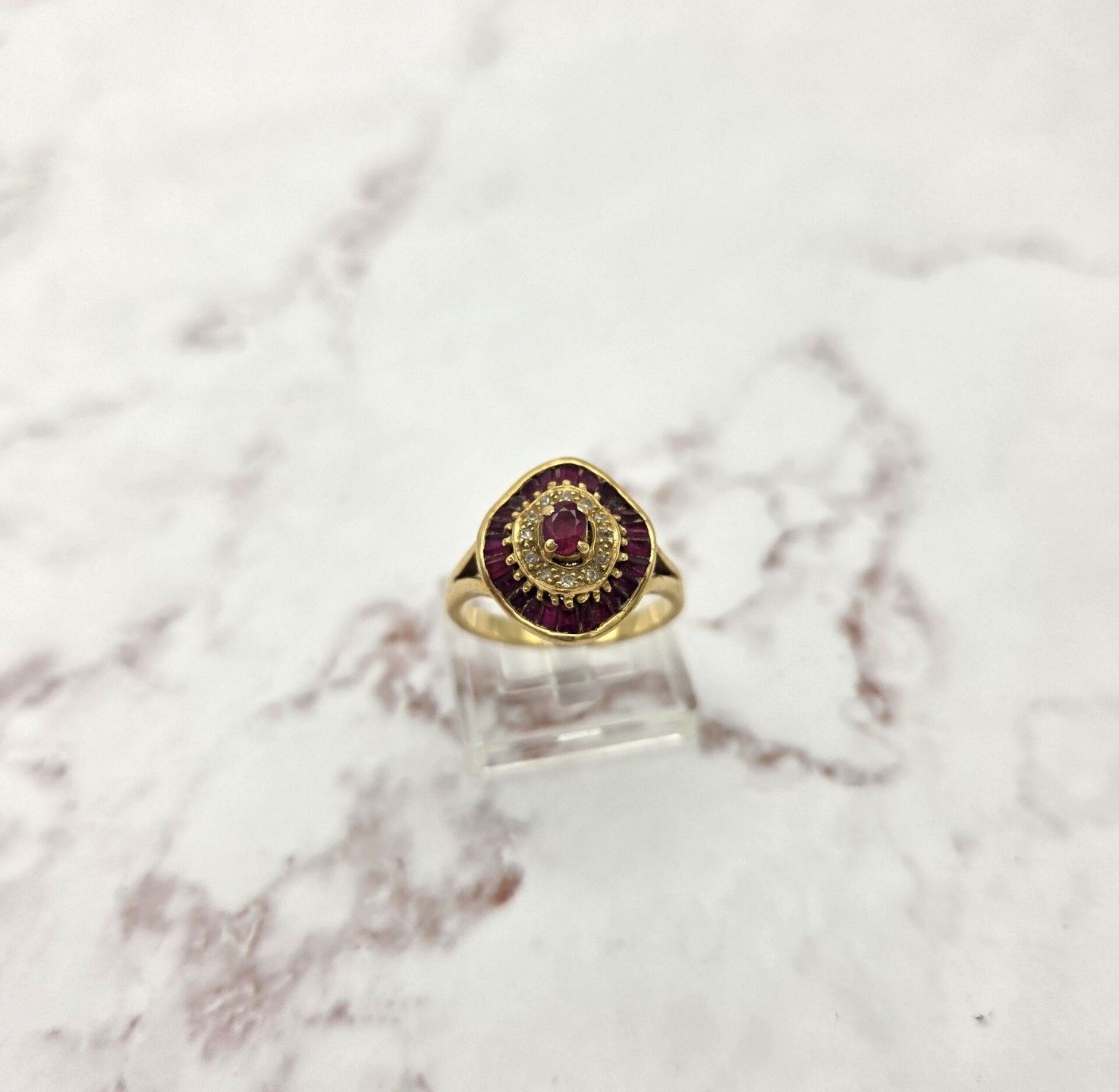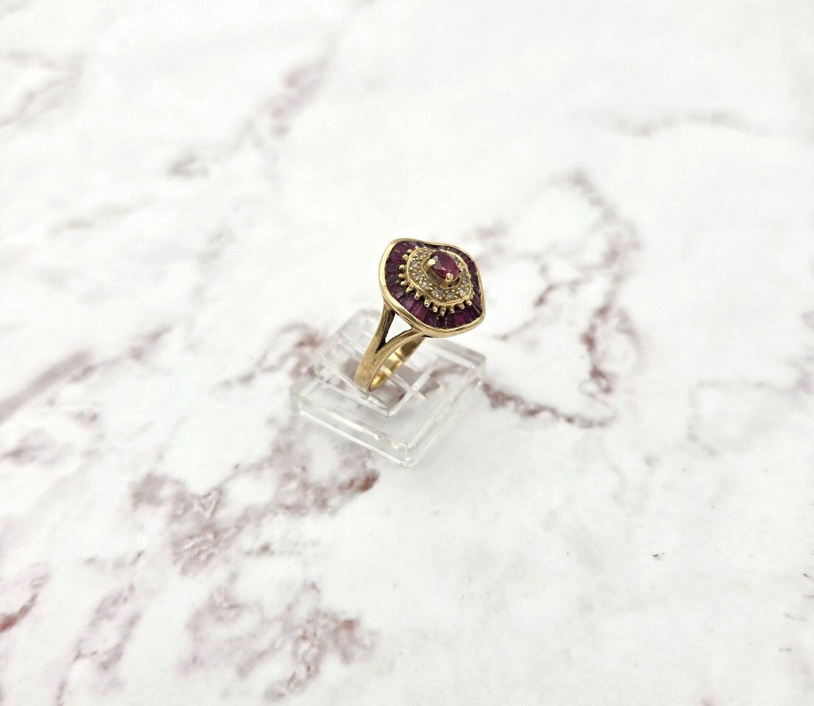 Ring in 750 thousandths yellow gold with a round motif set with calibrated rubies and small diamonds - PB: 5.2 g - Size: 56