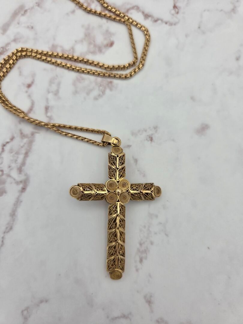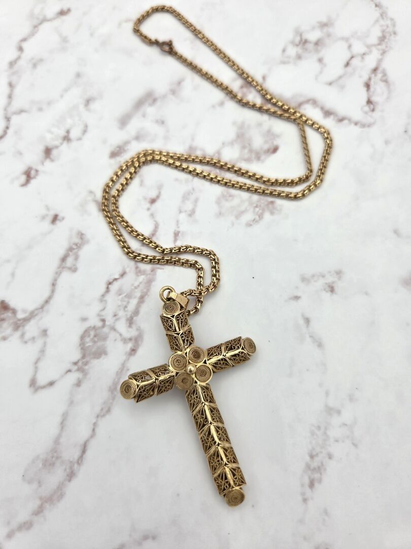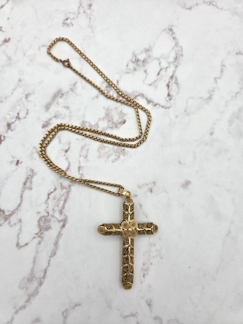 An interlaced link necklace and a cross pendant, in 750 thousandths yellow gold - B.P.: 25.2g - Necklace length: 51 cm - Cross length: 6.5 cm