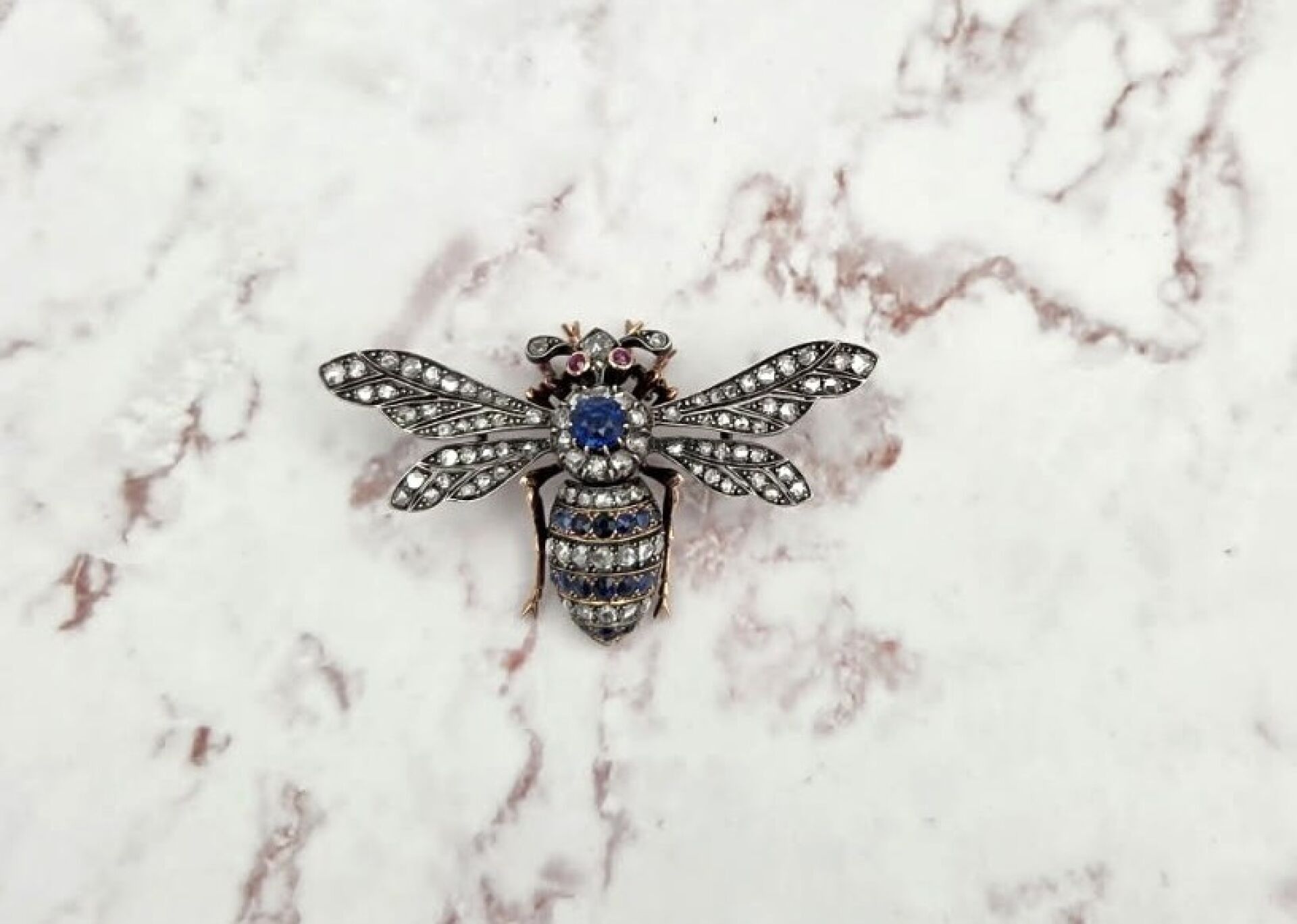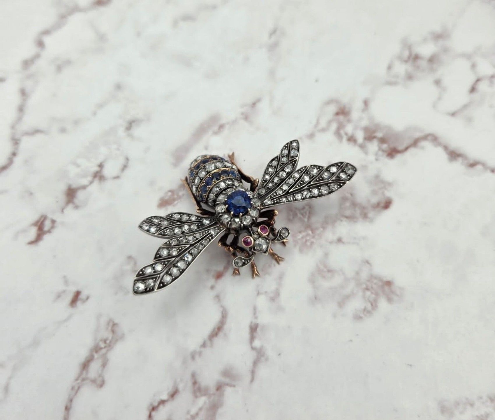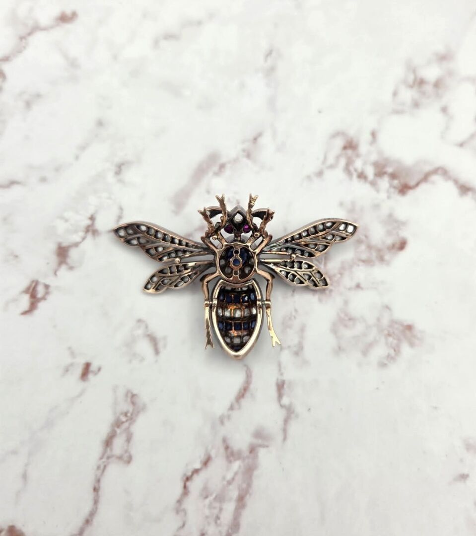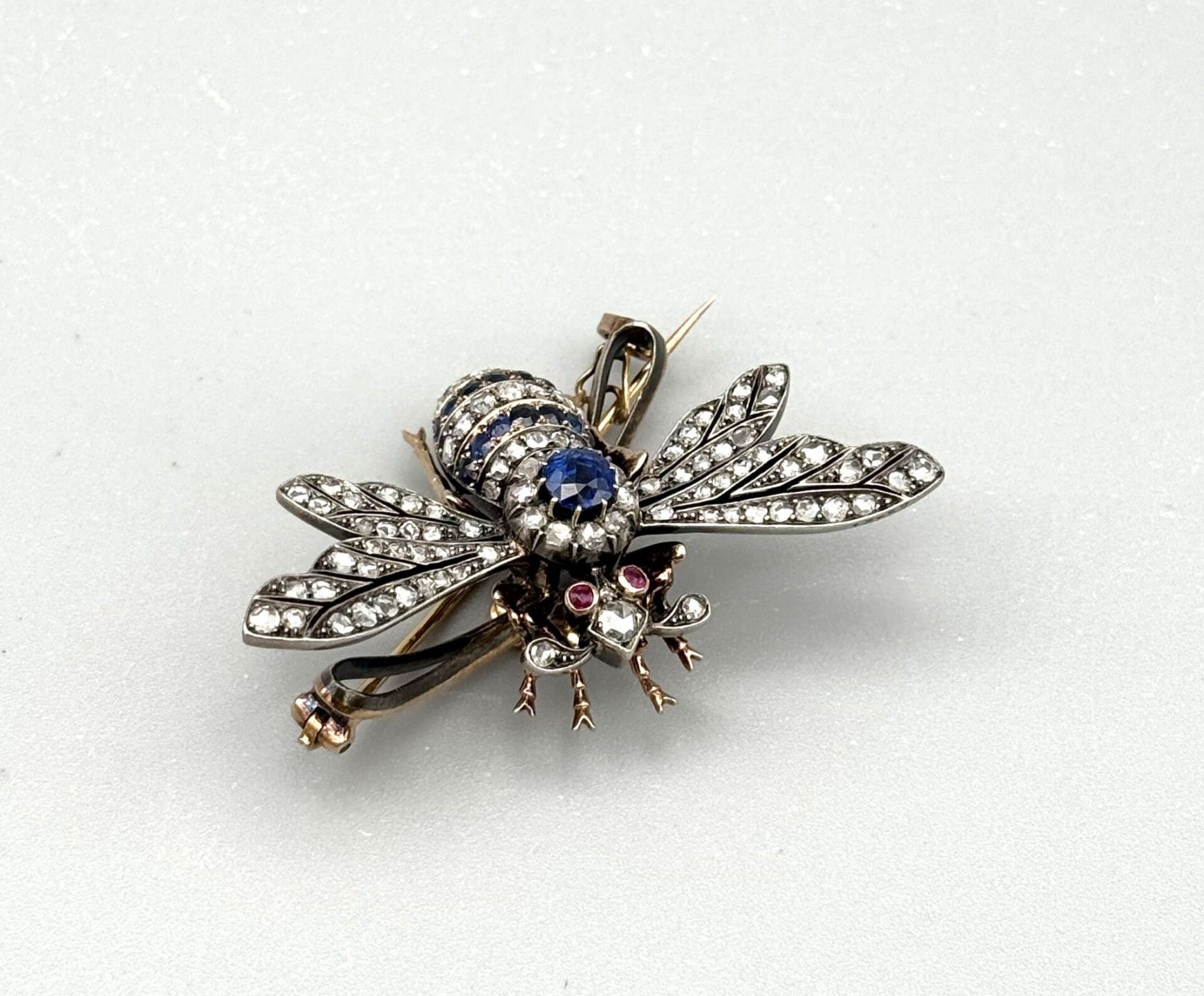 Gold and silver bumblebee brooch, the body paved with rose-cut diamonds and sapphires, the eyes in ruby, late 19th century - Eagle head hallmark, numbered 13337 on the pin, the wing and on the abdomen - PB: 22.6 g - Length: 3.5 cm - Width: 5.9 cm.