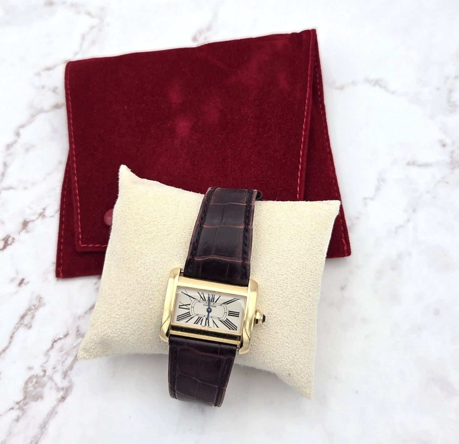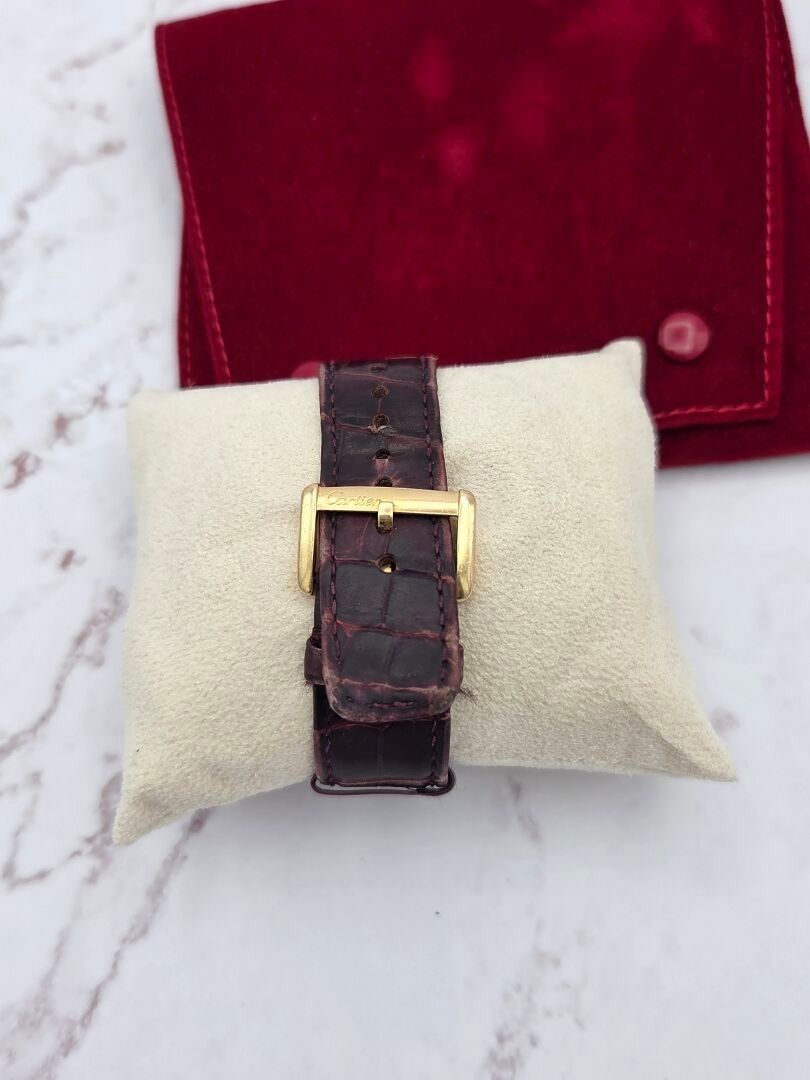 CARTIER - Tank Divan wristwatch, rectangular case in 750 thousandths yellow gold, ivory dial index Roman numerals, blued steel hands, back numbered 277909 CE 2601, 750 thousandths yellow gold Cartier buckle. Quartz movement. Winding crown set with a faceted synthetic sapphire (damaged). Case dimensions: 32 x 19 mm. Worn leather strap.