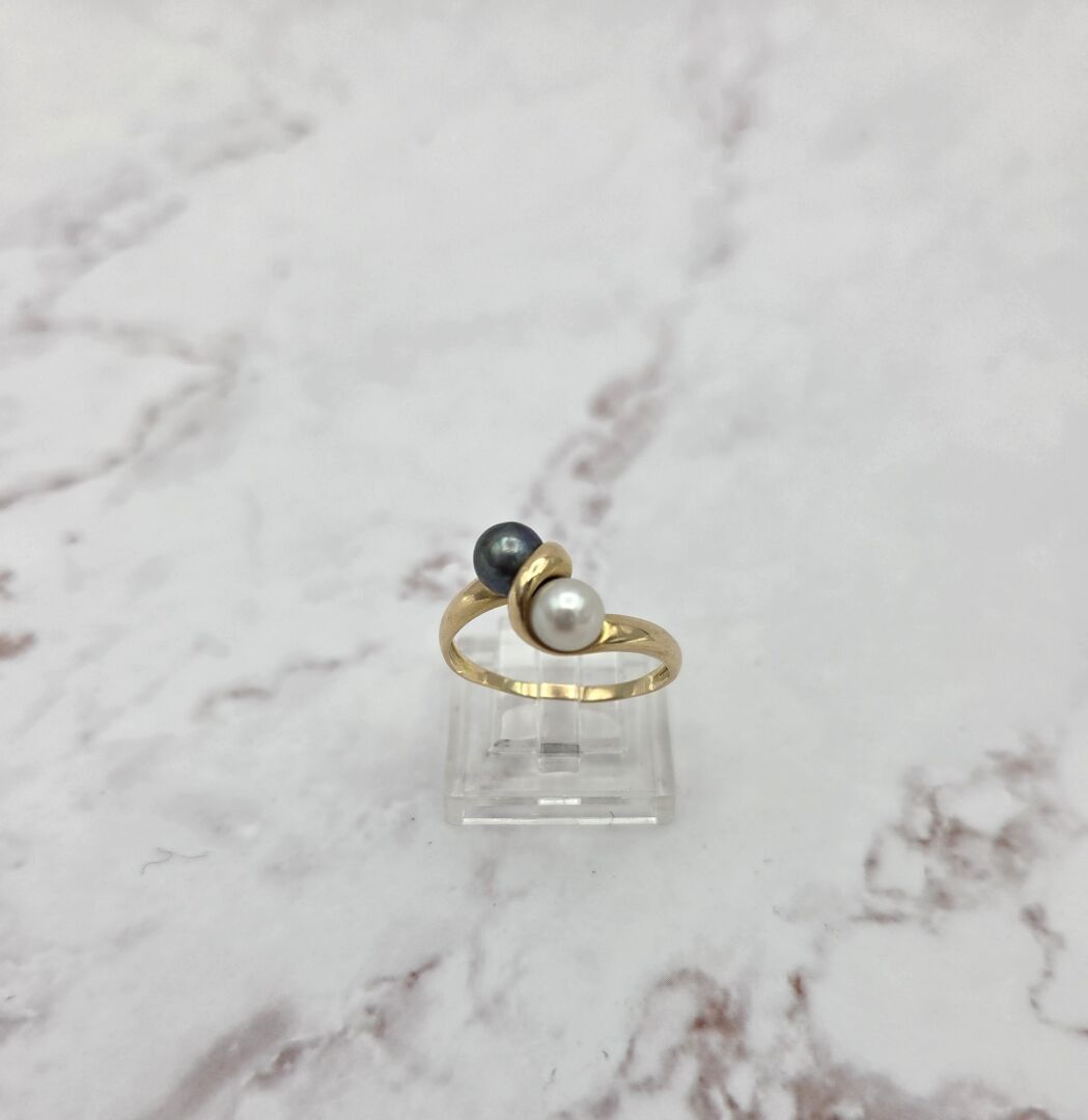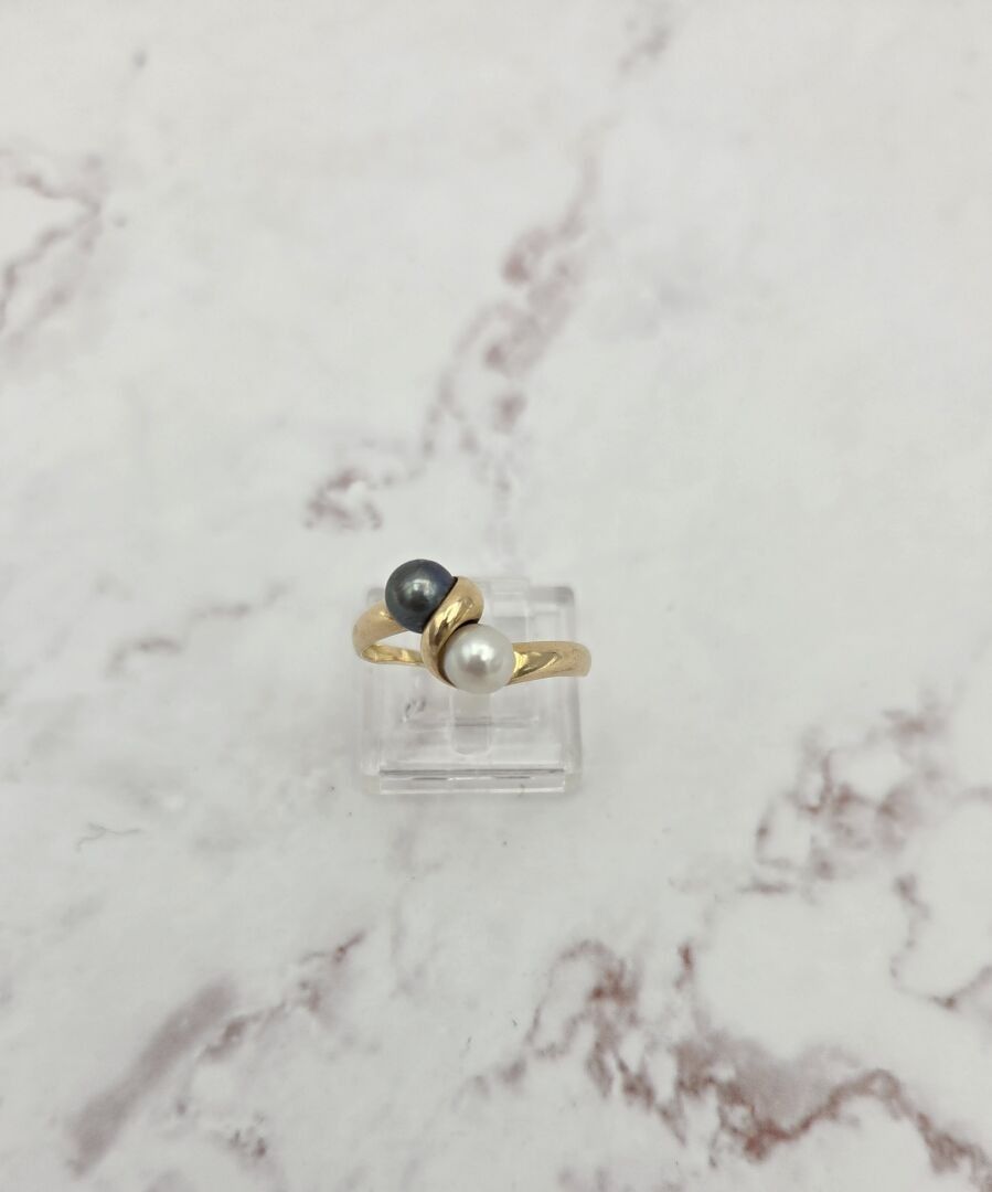 Toi et Moi ring in 750 thousandths yellow gold set with two white and grey cultured pearls - PB: 2.8 g - TDD: 59